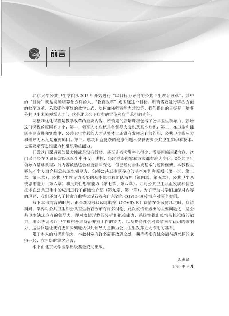 公共卫生领导力基础教程 普通高等教育本科规划教材 供公共卫生与预防医学类相关专业用 孟庆跃 9787565924095 北京大学医学出版社