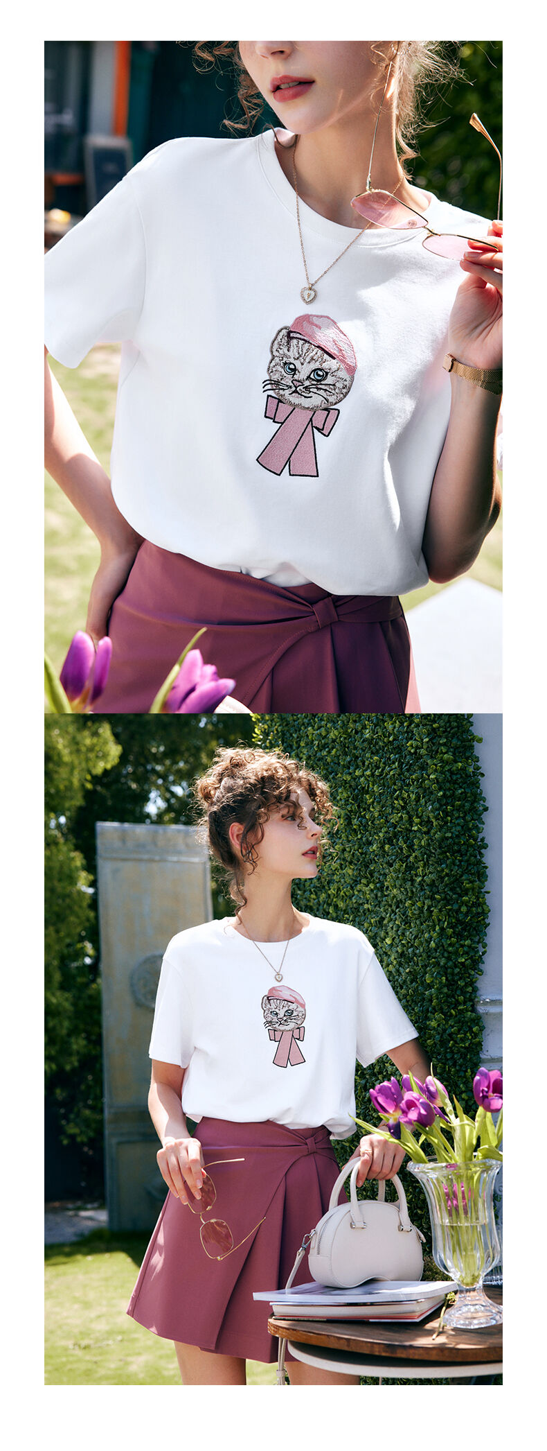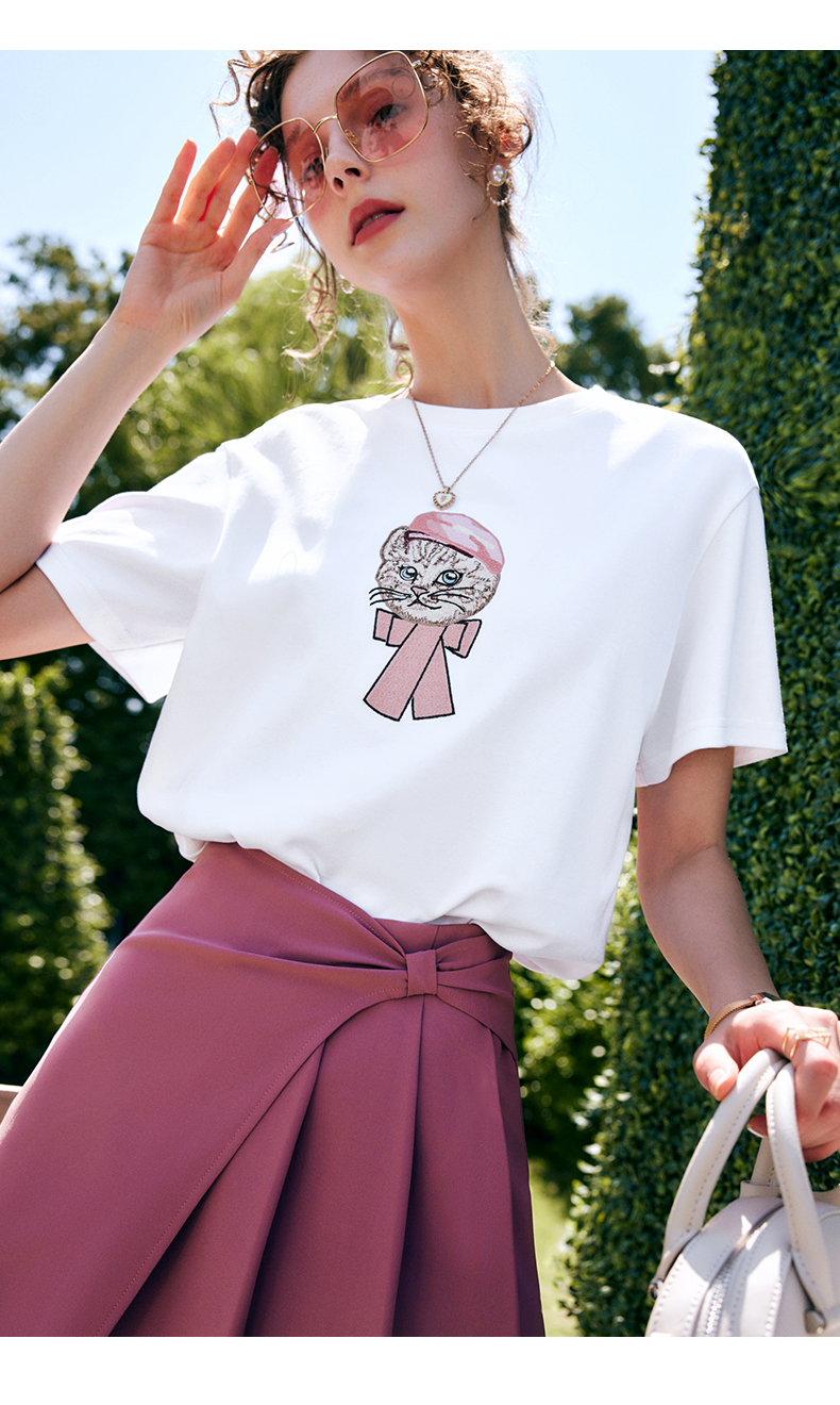 欧芮儿2026年新款夏季红色绣花设计感圆领宽松短袖休闲简约T恤女