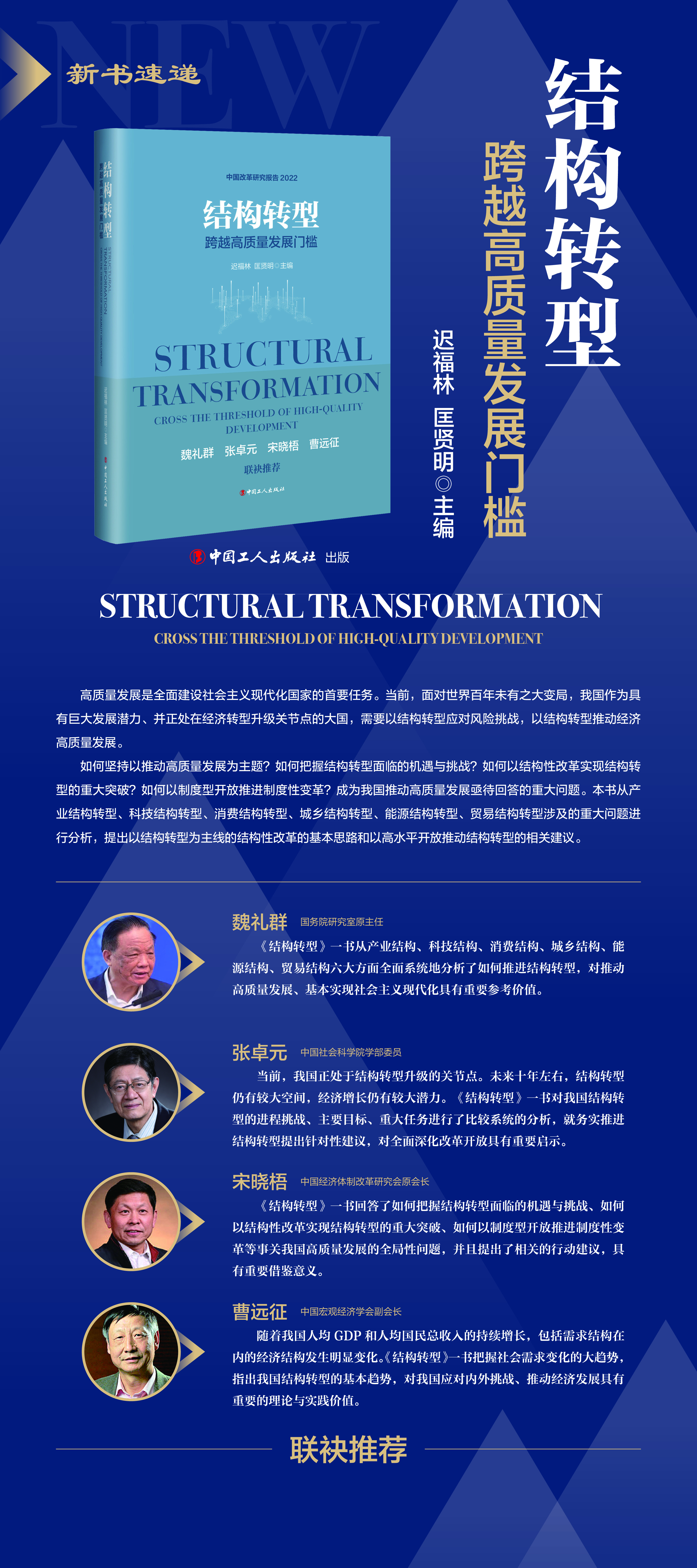 《结构转型》一书从产业结构、科技结构、消费结构、城乡结构、能源结构、贸易结构六大方面全面系统地分析了如何推进结构转型,对推动高质量发展、基本实现社会主义现代化具有重要参考价值。