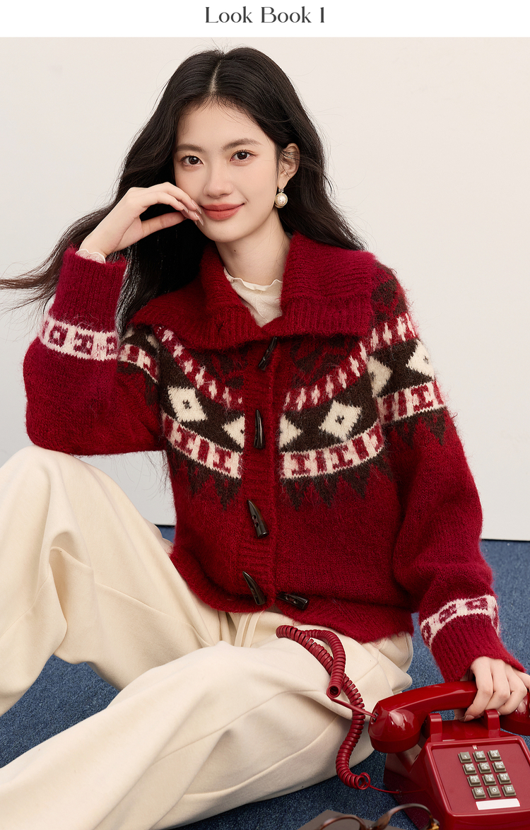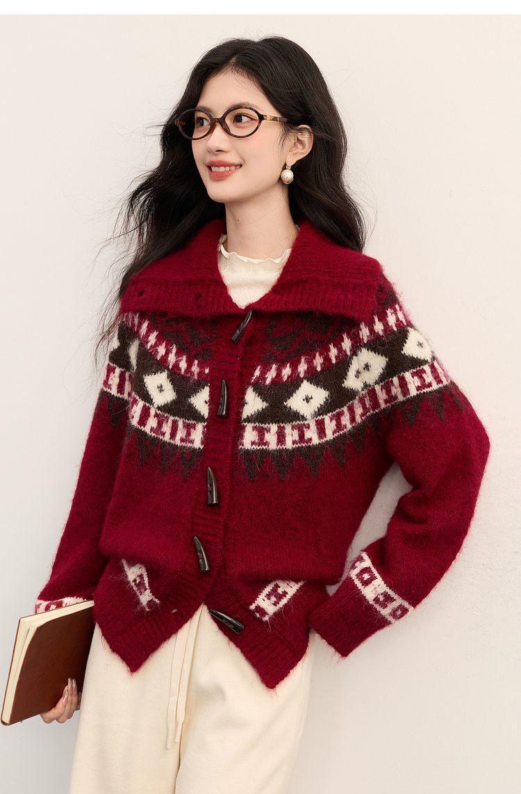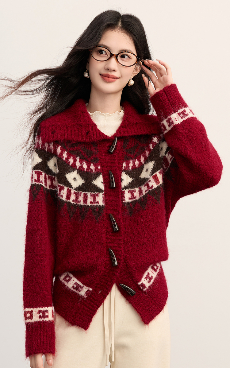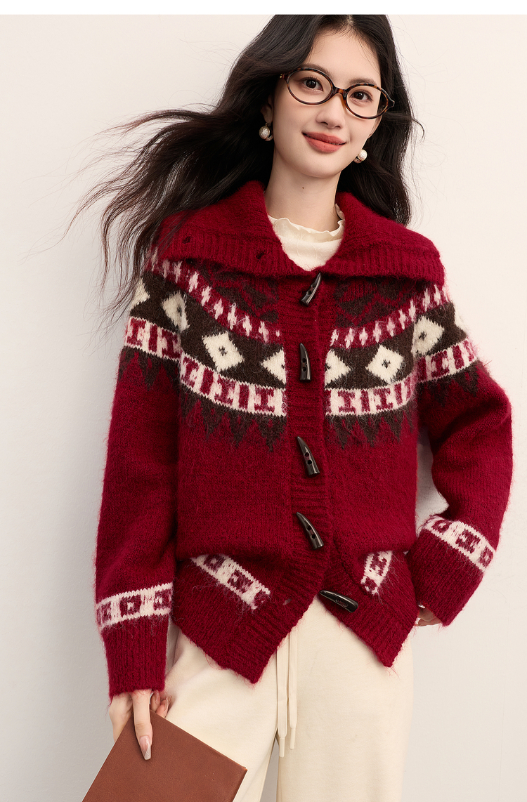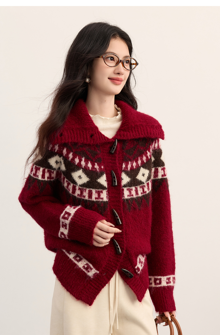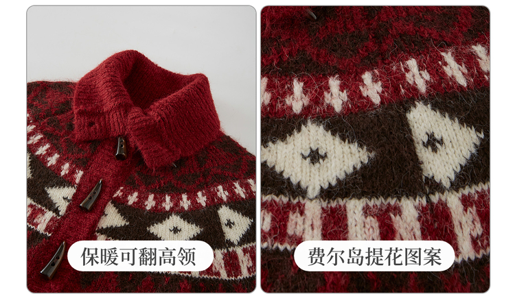 【11/19新品】熙世界复古学院风费尔岛针织开衫女秋冬宽松设计感牛角扣毛衣外套