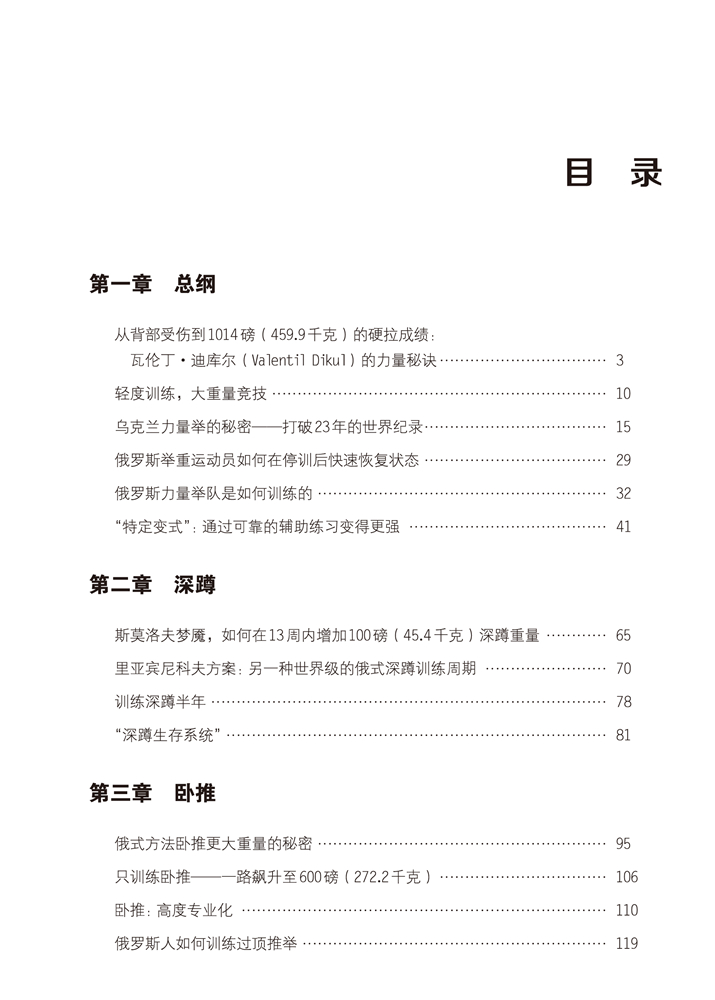 这本书总结了众多举重世界和队的力量训练经验和训练计划,是一本名副其实的训练教程。来自这些国度的运动科学研究在世界上居于地位,他们在举重领域,特别是大重量举重领域,以及力量举领域也是享誉世界的。这本书梳理了这些国家杠铃力量训练的方法和训练计划,保留了来自经验的精华部分,剔除了相对过时的内容,并将其整理为适用于大众使用的科学训练体系。这本书适用于系统健身的训练者和各个层次的教练。