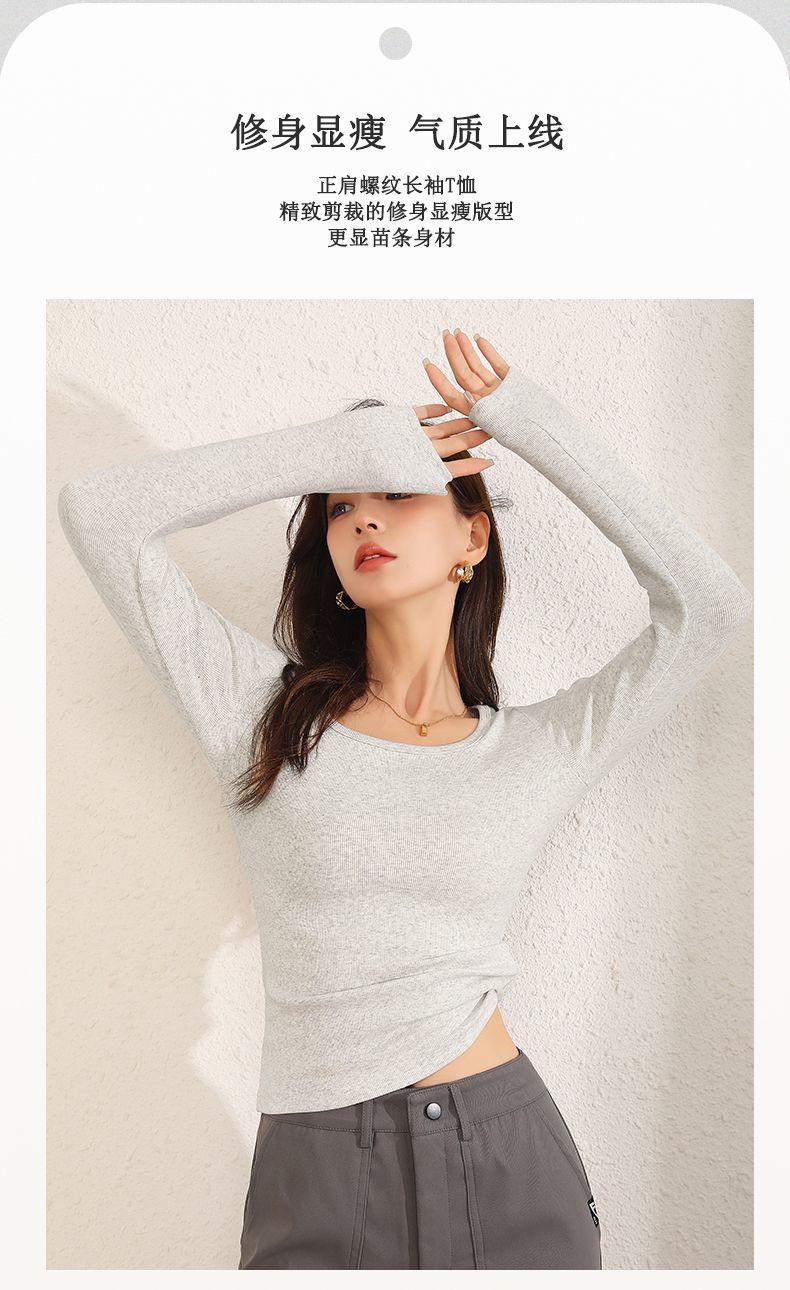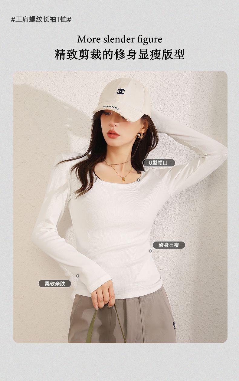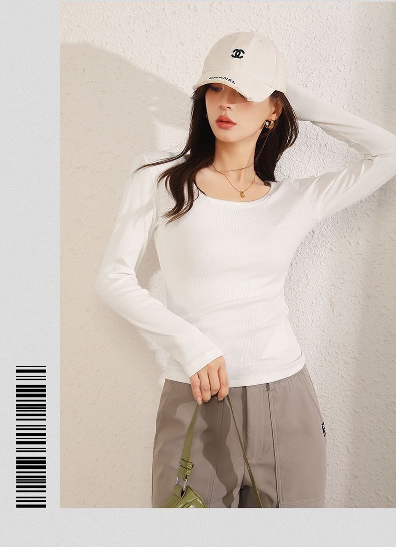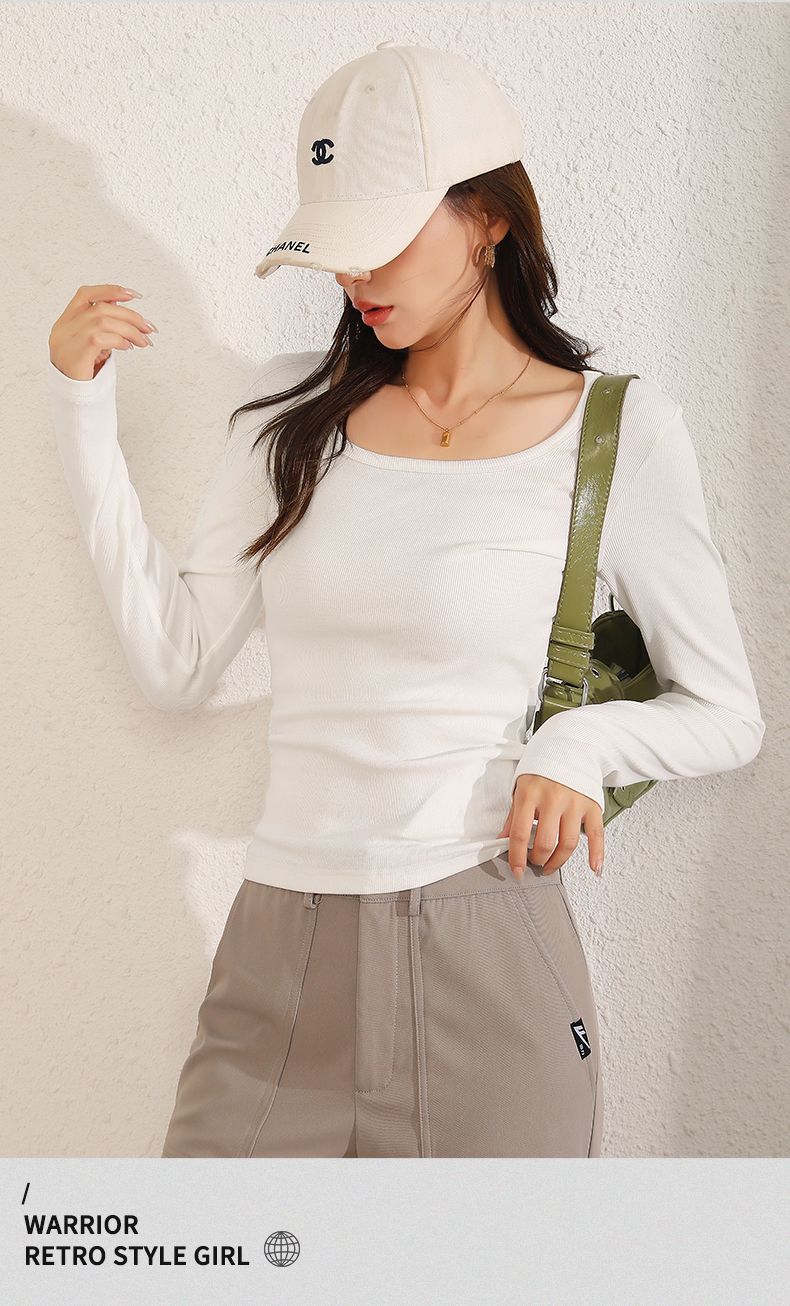 回力长袖t恤女春秋2025新款方领短款修身针织上衣白色内搭打底衫