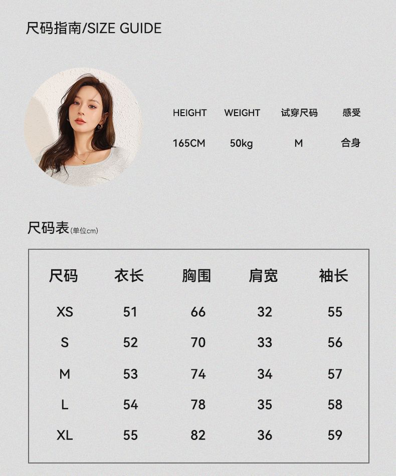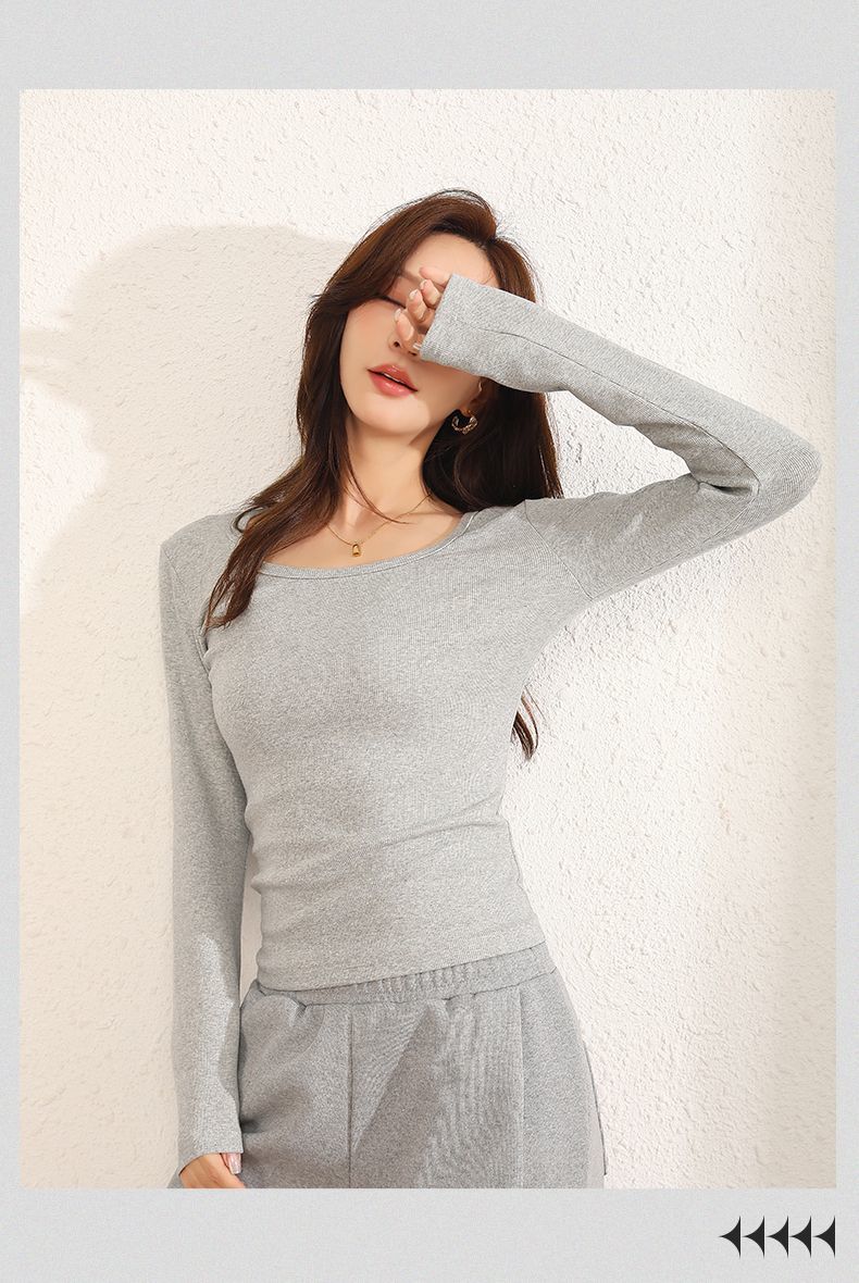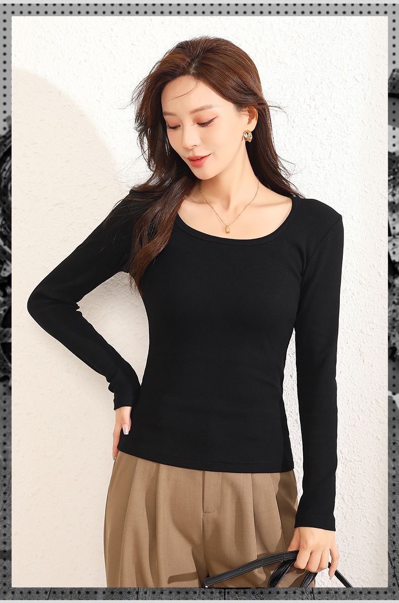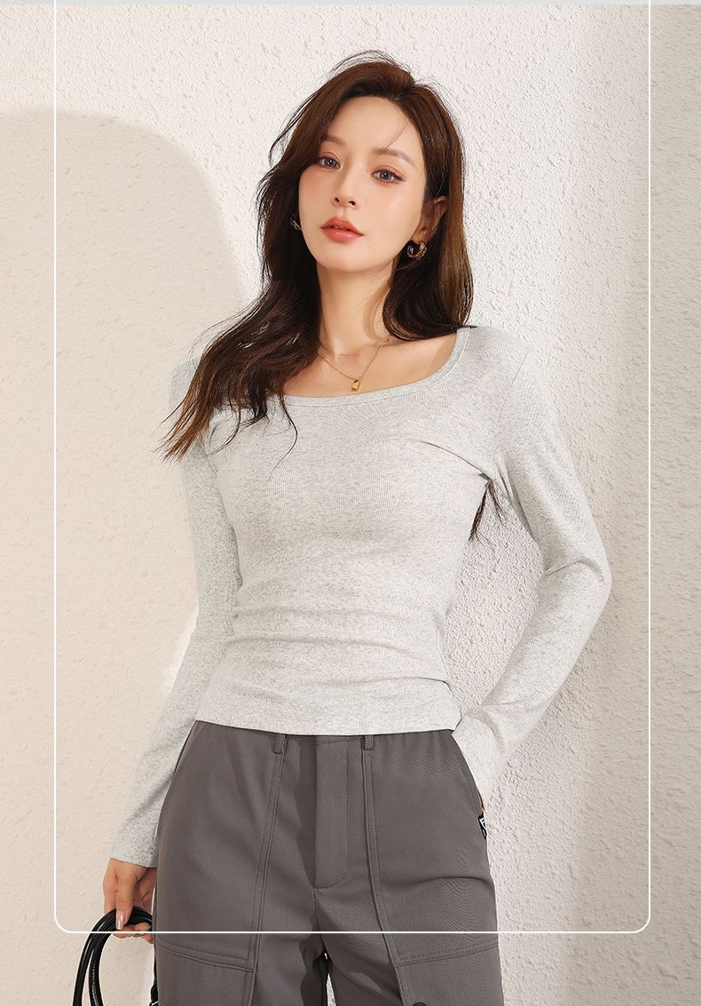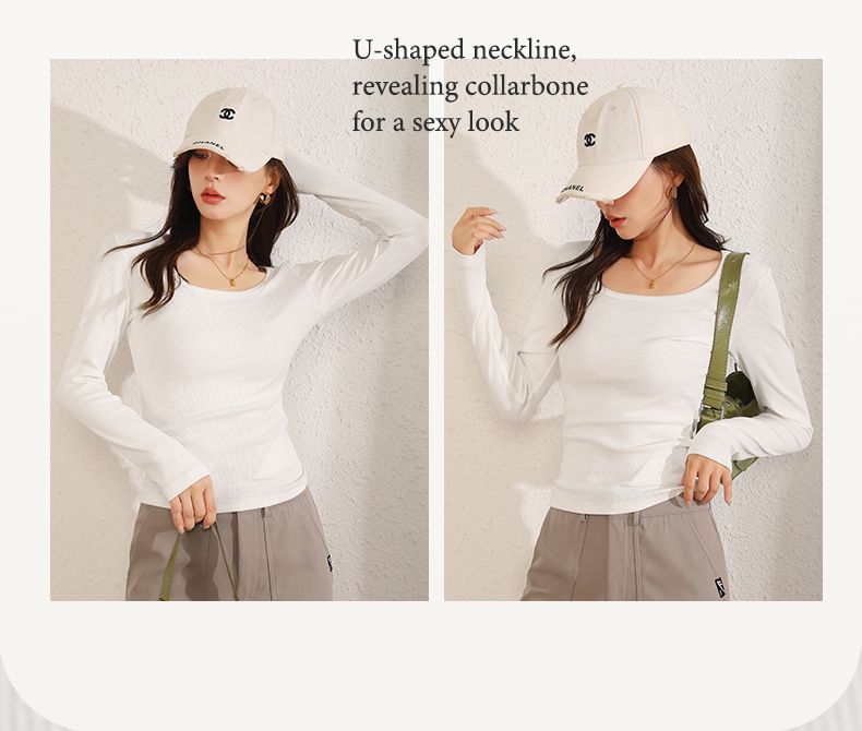 回力长袖t恤女春秋2025新款方领短款修身针织上衣白色内搭打底衫