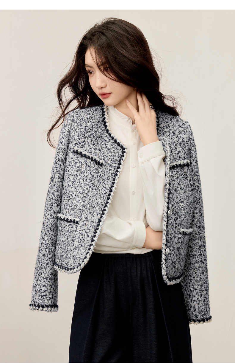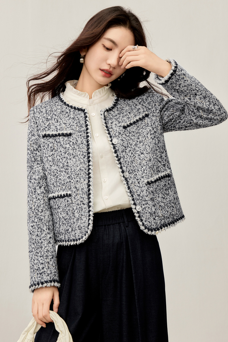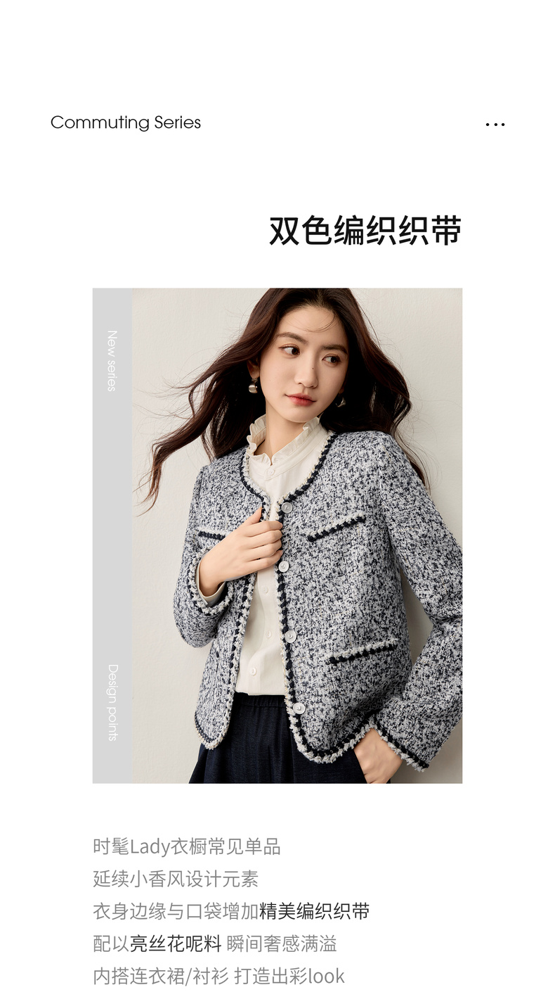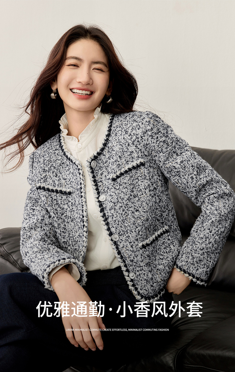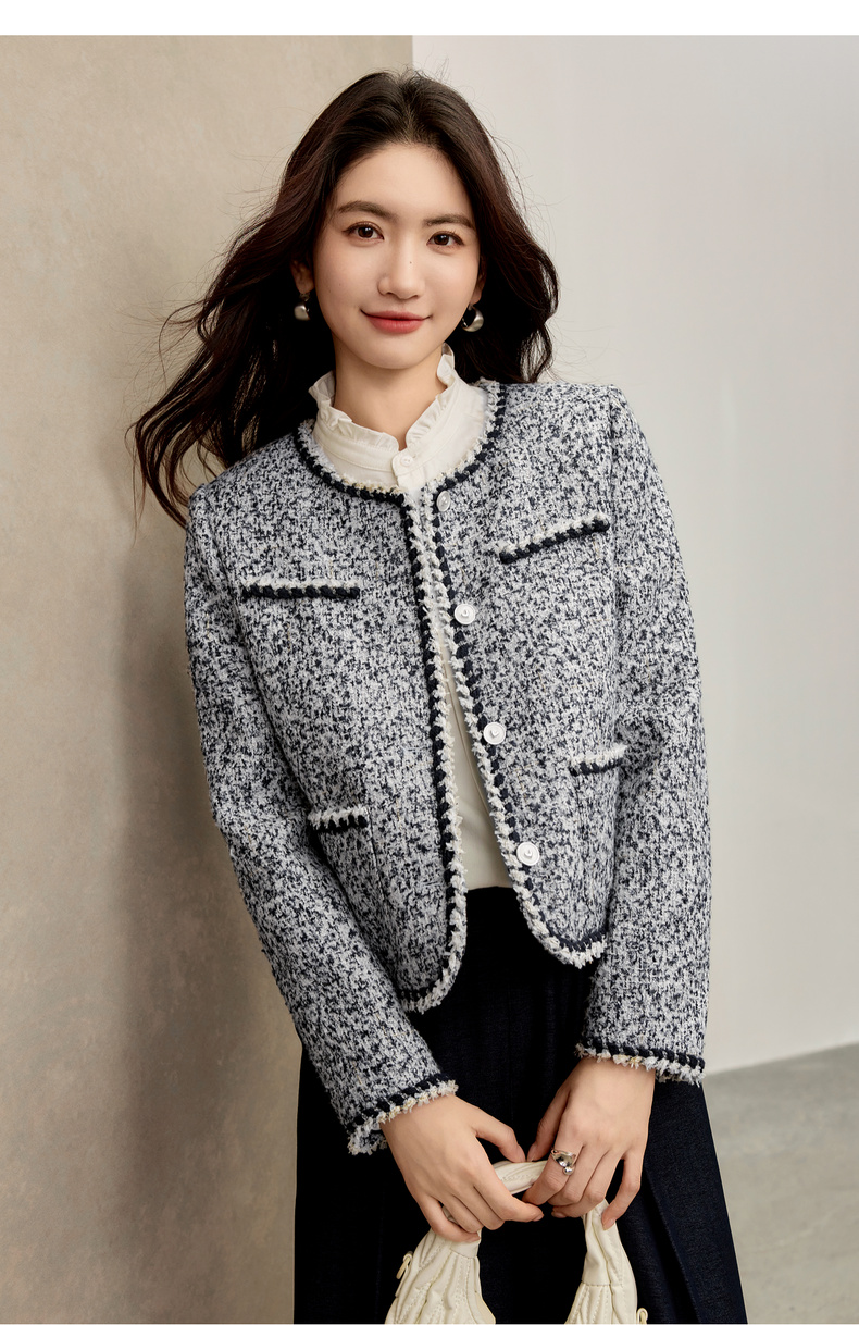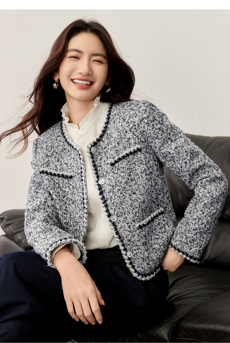 【内购】【精美织带】优雅通勤圆领圆形爱心扣垫肩亮丝花呢小香风外套-153WA2115