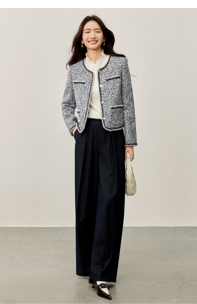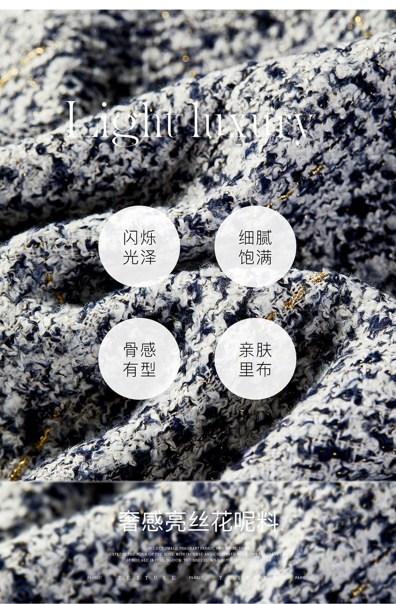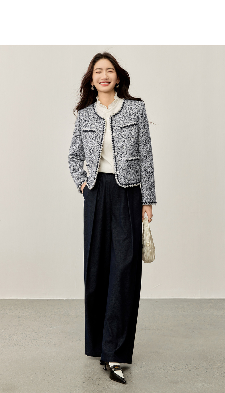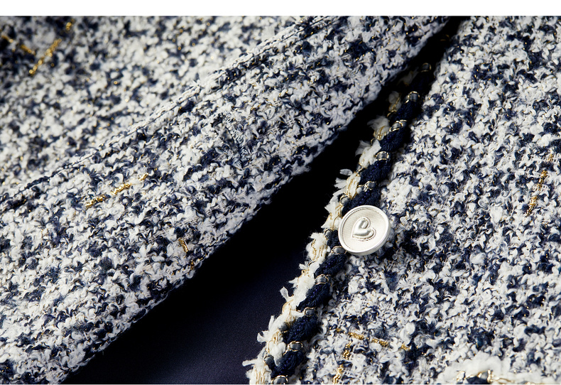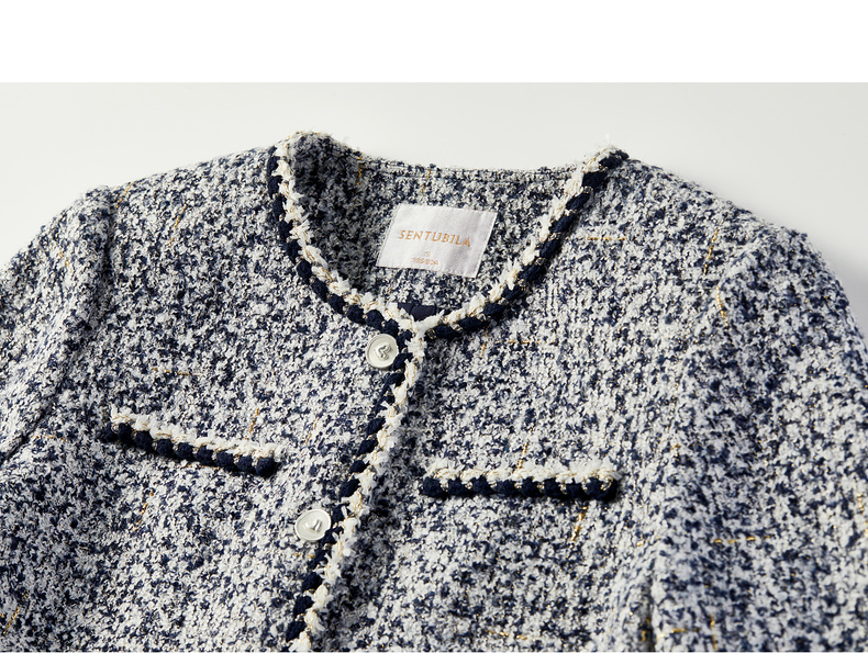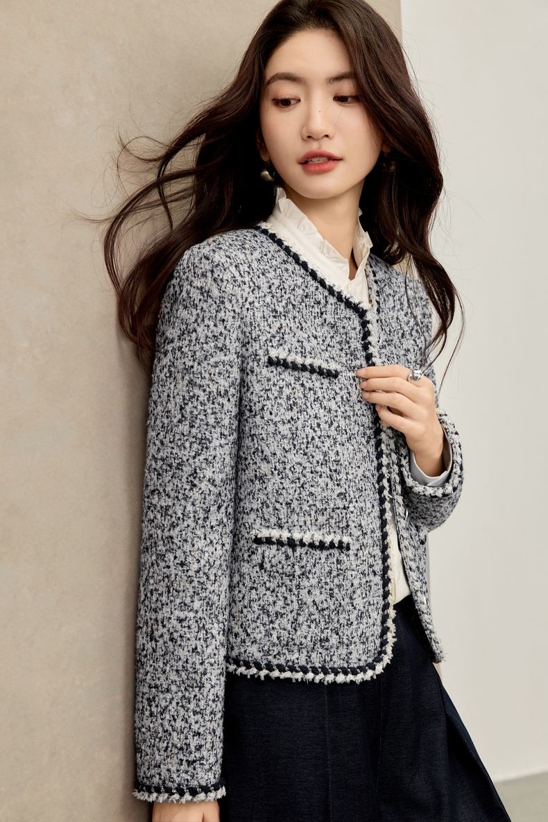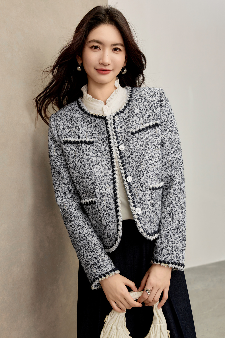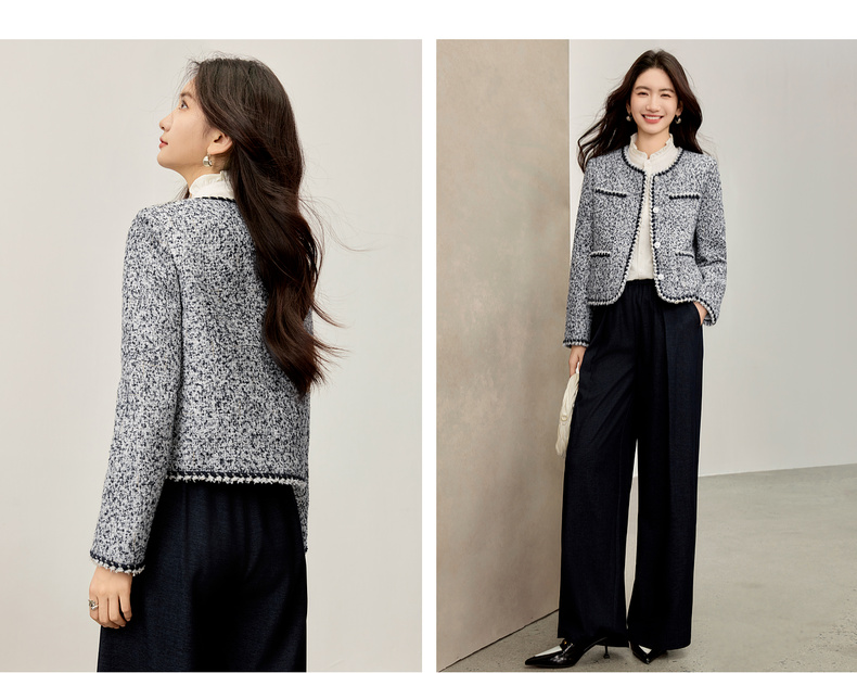 【内购】【精美织带】优雅通勤圆领圆形爱心扣垫肩亮丝花呢小香风外套-153WA2115