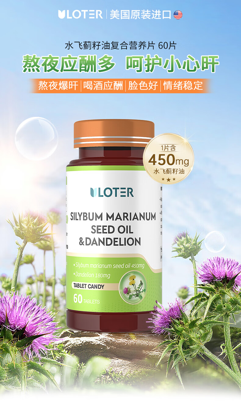 美国原装进口 优乐驰ULOTER 水飞蓟籽油蒲公英复合片60片/瓶