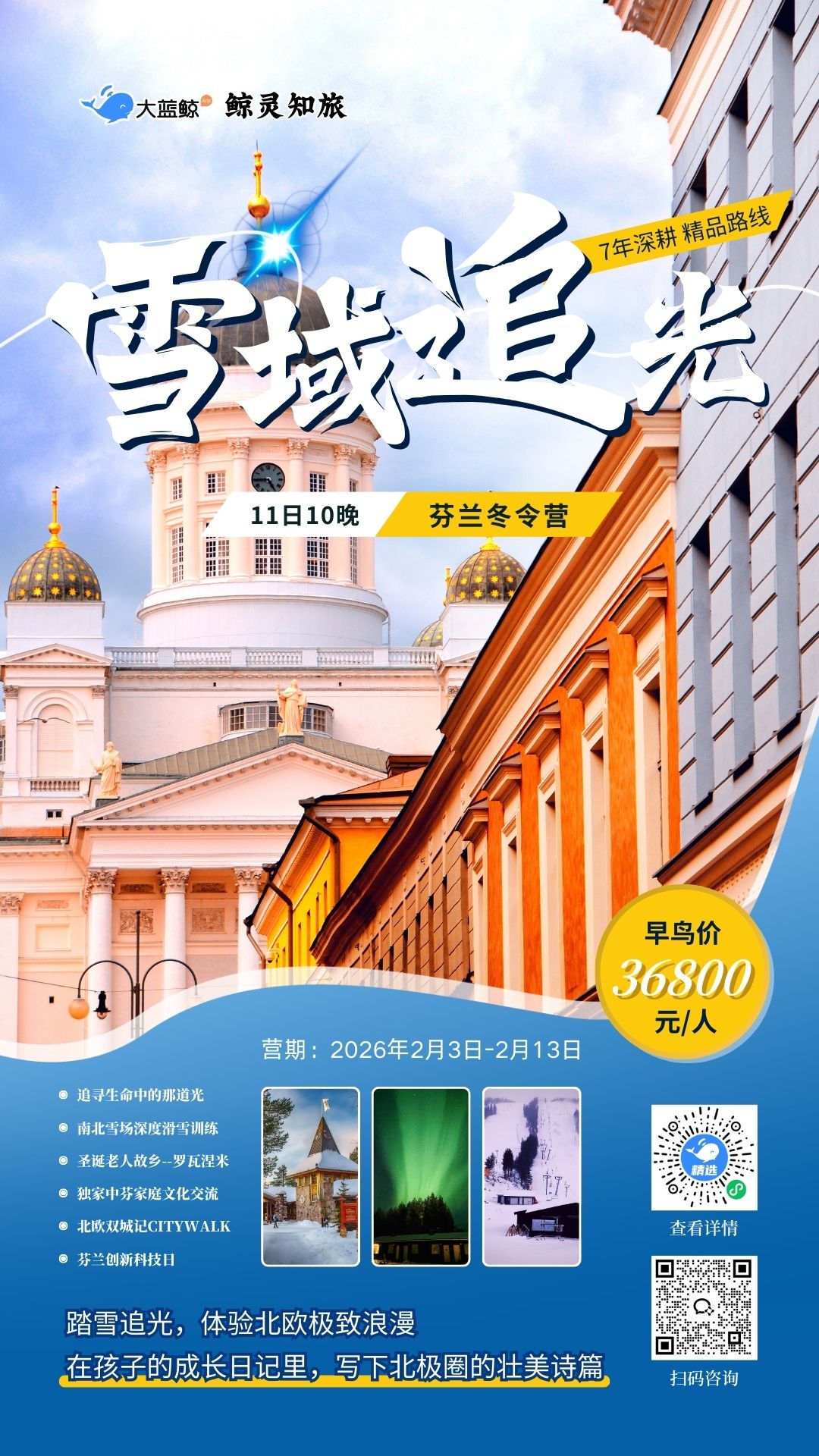 大蓝鲸爱研学 | 【芬兰·冬令营·独立/亲子·11日10晚】芬兰雪域追光营,去圣诞老人故乡滑雪,追寻北欧极光,中芬家庭文化交流,北欧双城探索芬兰雪域追光营