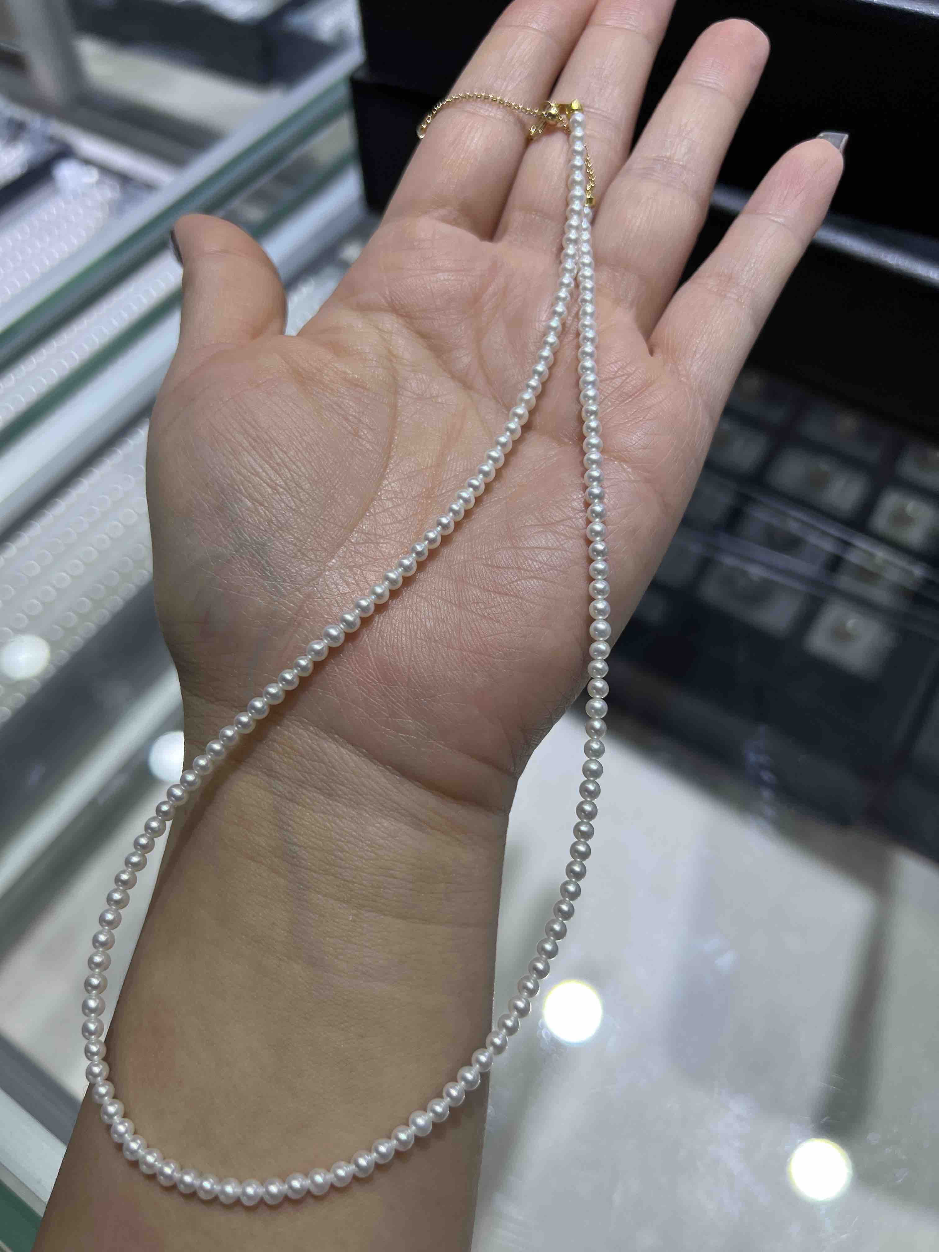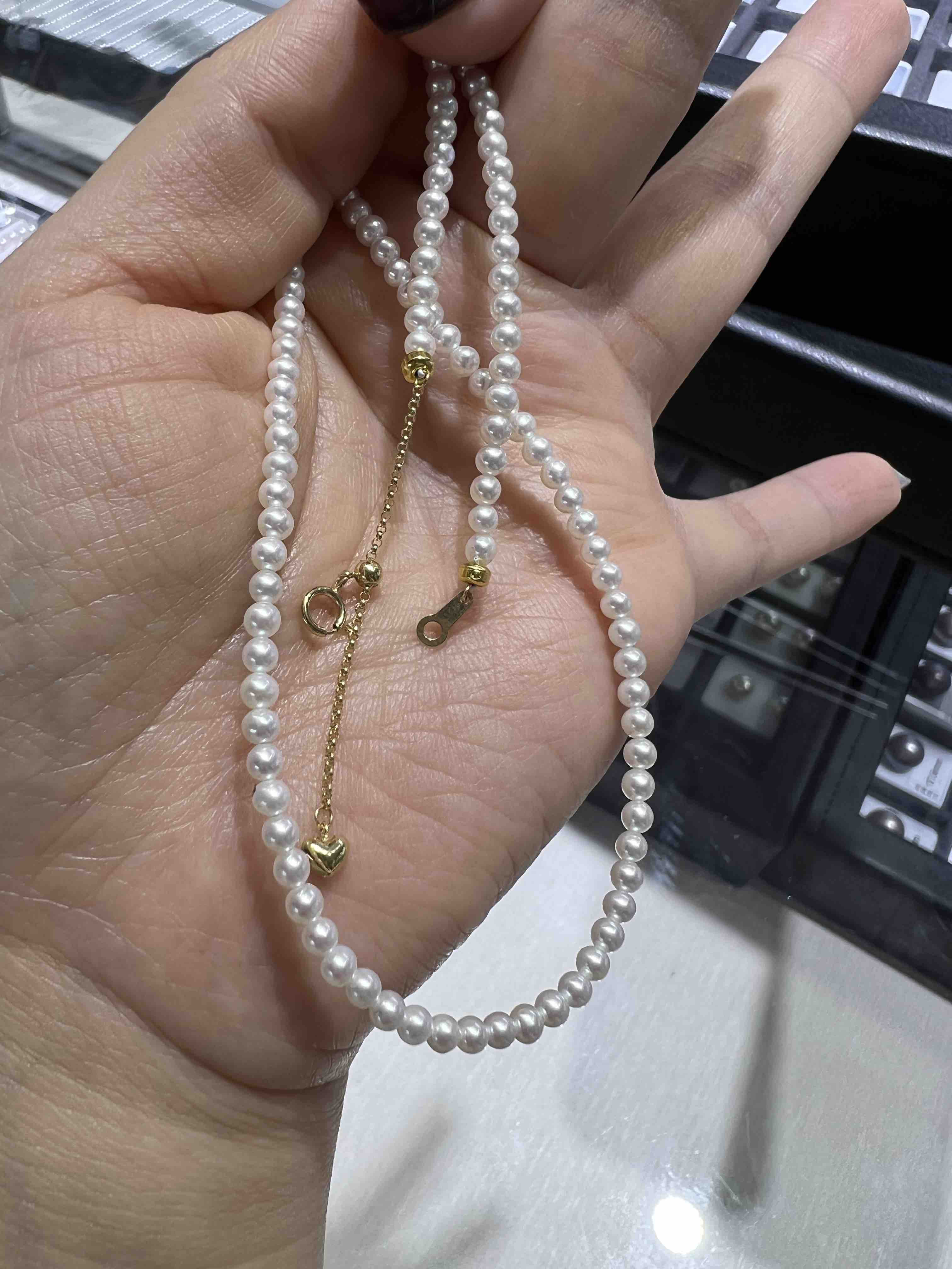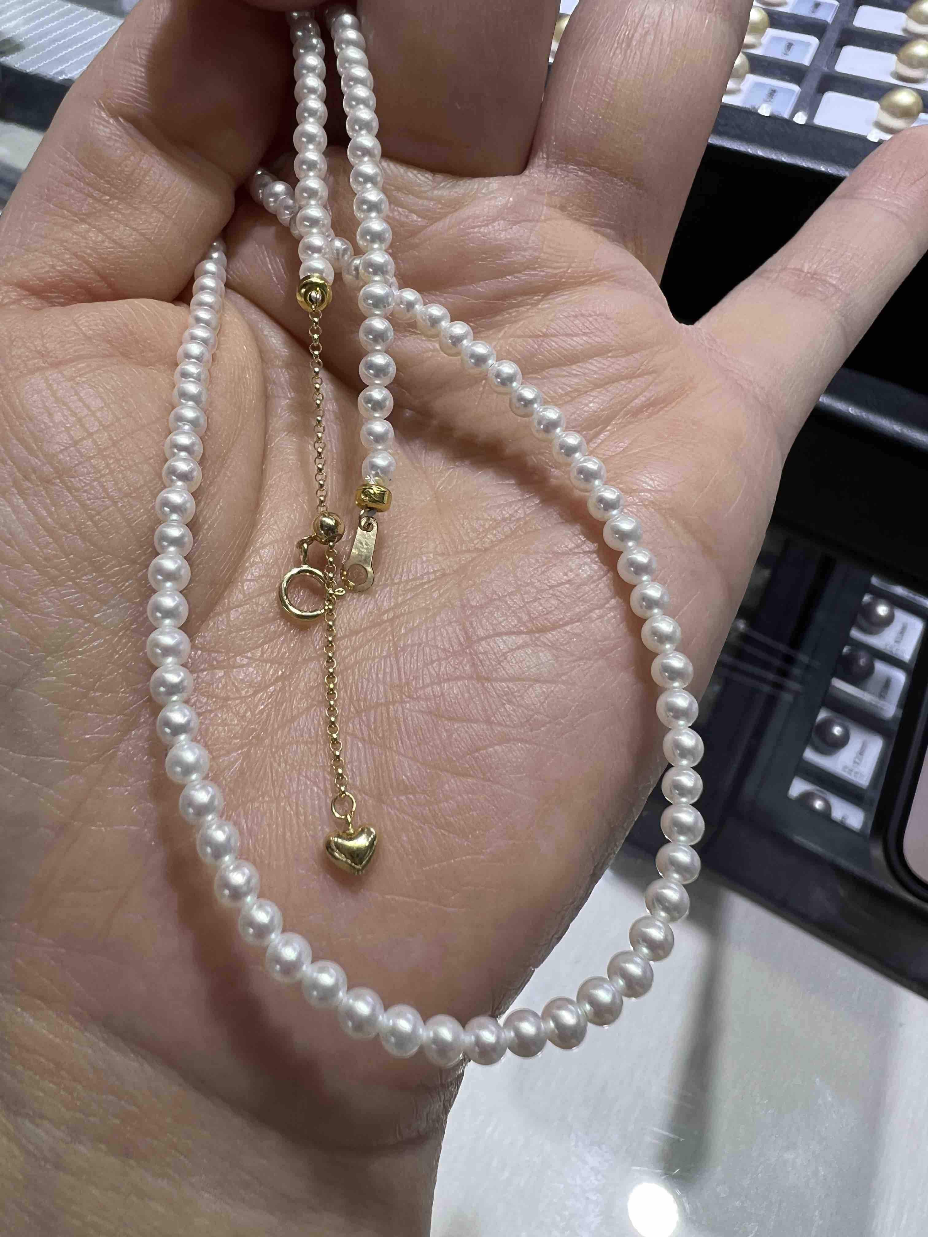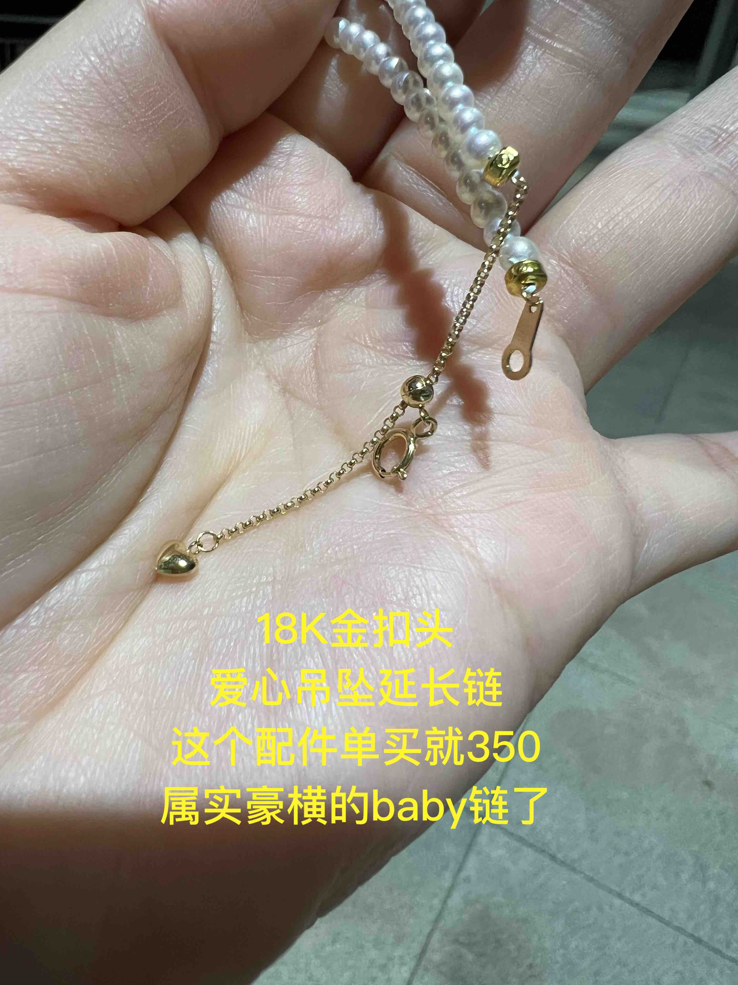尺寸3-3.5mm,正圆极光AK小baby珠子,可以媲美akoya彩凛珠子,配件全部都是18K,尾坠用的是爱心调接扣,厚实扣环大,打起来方便。