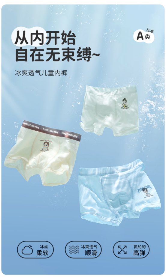 🍂🍂【童童树儿童小冰条裤】1、选用肌理冰丝纤维+氨纶制作,✨面料厚度仅有0.025cm,比普通内裤薄30%,0感穿着/2倍清爽,冰感新体验💯