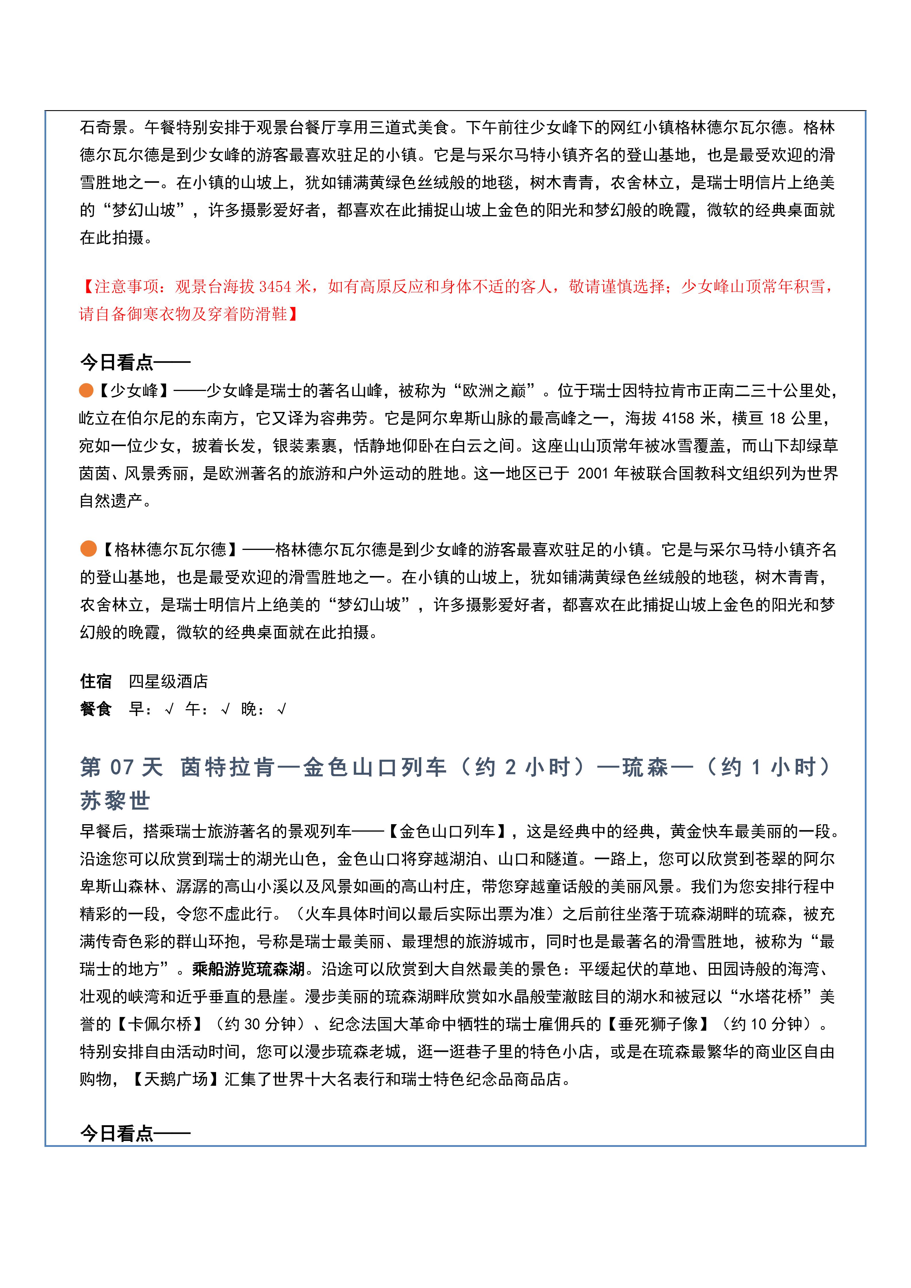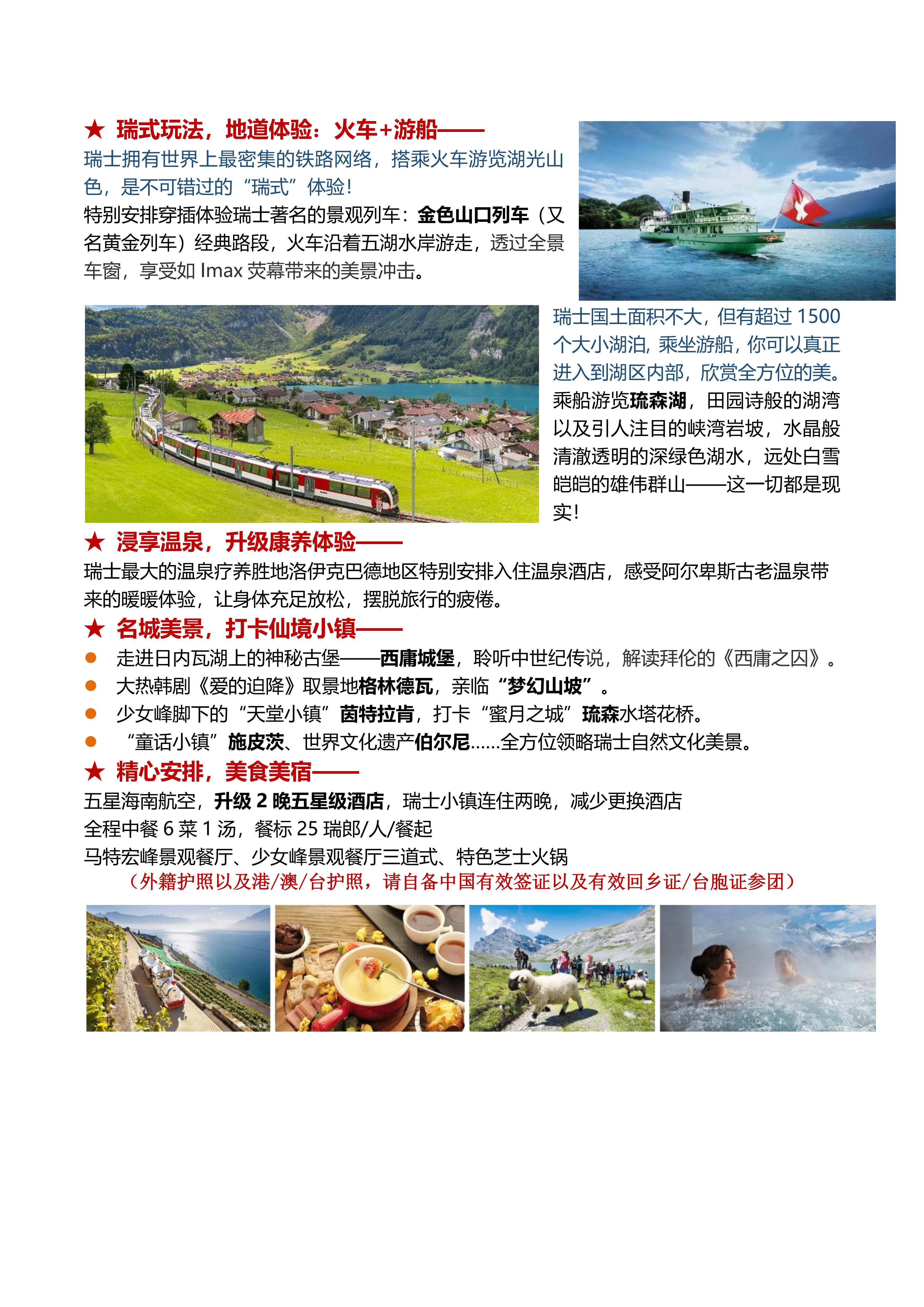 【春节、寒假】<瑞士阿尔卑斯双雪山10天>欧洲山王马特宏峰+少女峰+黄金列车+古堡游船+温泉美食+深圳出发