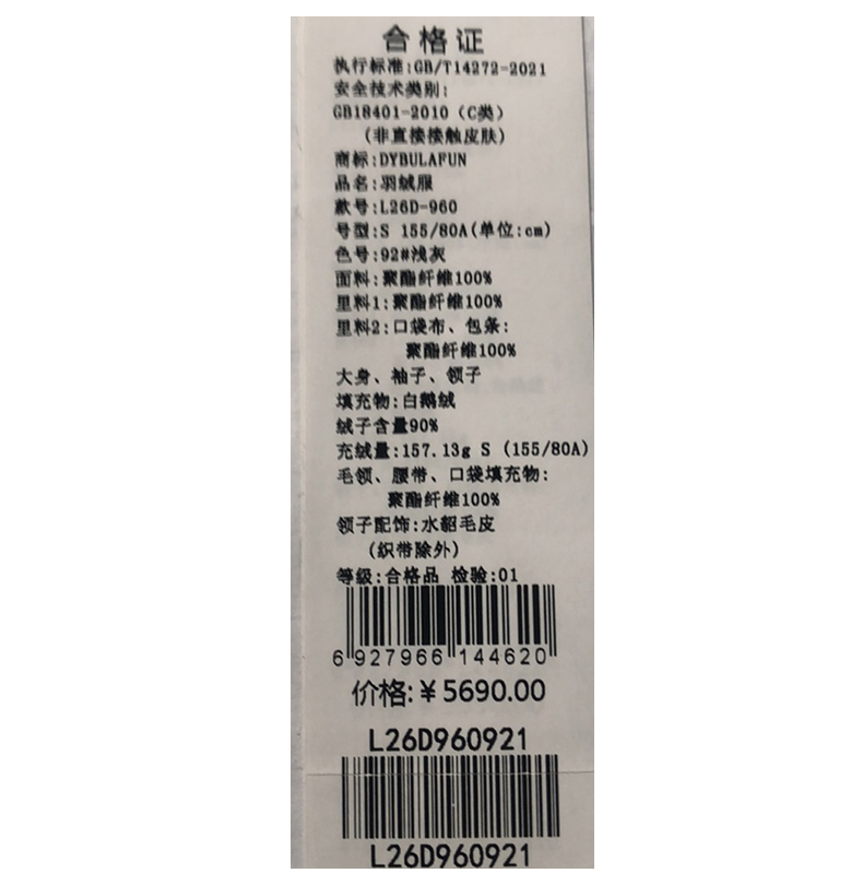 戴布拉芬羽绒服L26D960