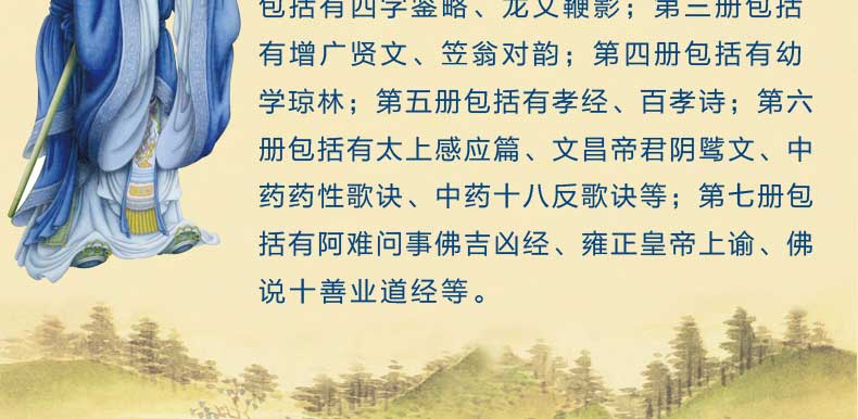 《圣学根之根》是因缘生老师专为儿童编写的一套最新版的童蒙教材。共分7册,第一册包括有小儿语、续小儿语、弟子规、三字经、百家姓、千字文;第二册包括有四字鉴略、龙文鞭影;第三册包括有增广贤文、笠翁对韵;第四册包括有幼学琼林;第五册包括有孝经、百孝诗;第六册包括有太上感应篇、文昌帝君阴骘文、中药药性歌诀、中药十八反歌诀等;第七册包括有阿难问事佛吉凶经、雍正皇帝上谕、佛说十善业道经等。