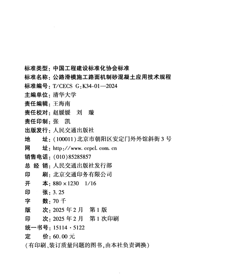 书名:公路滑模施工路面机制砂混凝土应用技术规程(T/CECS G:K34-01—2024)