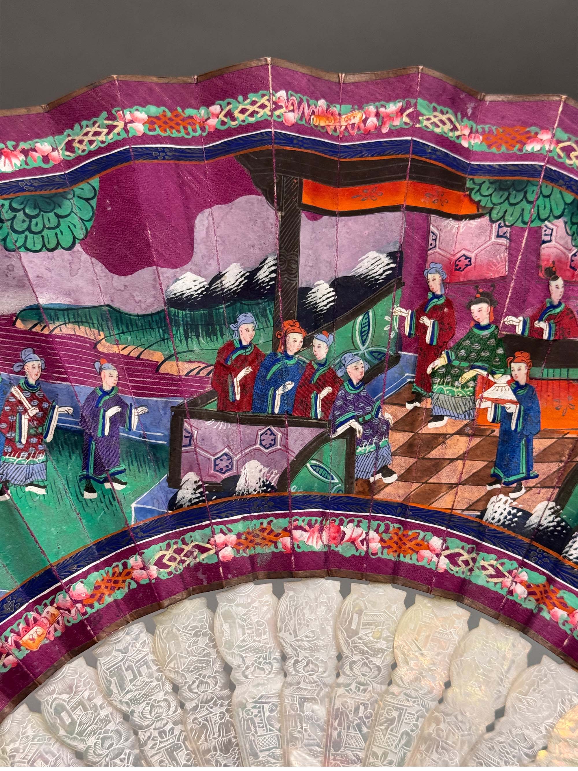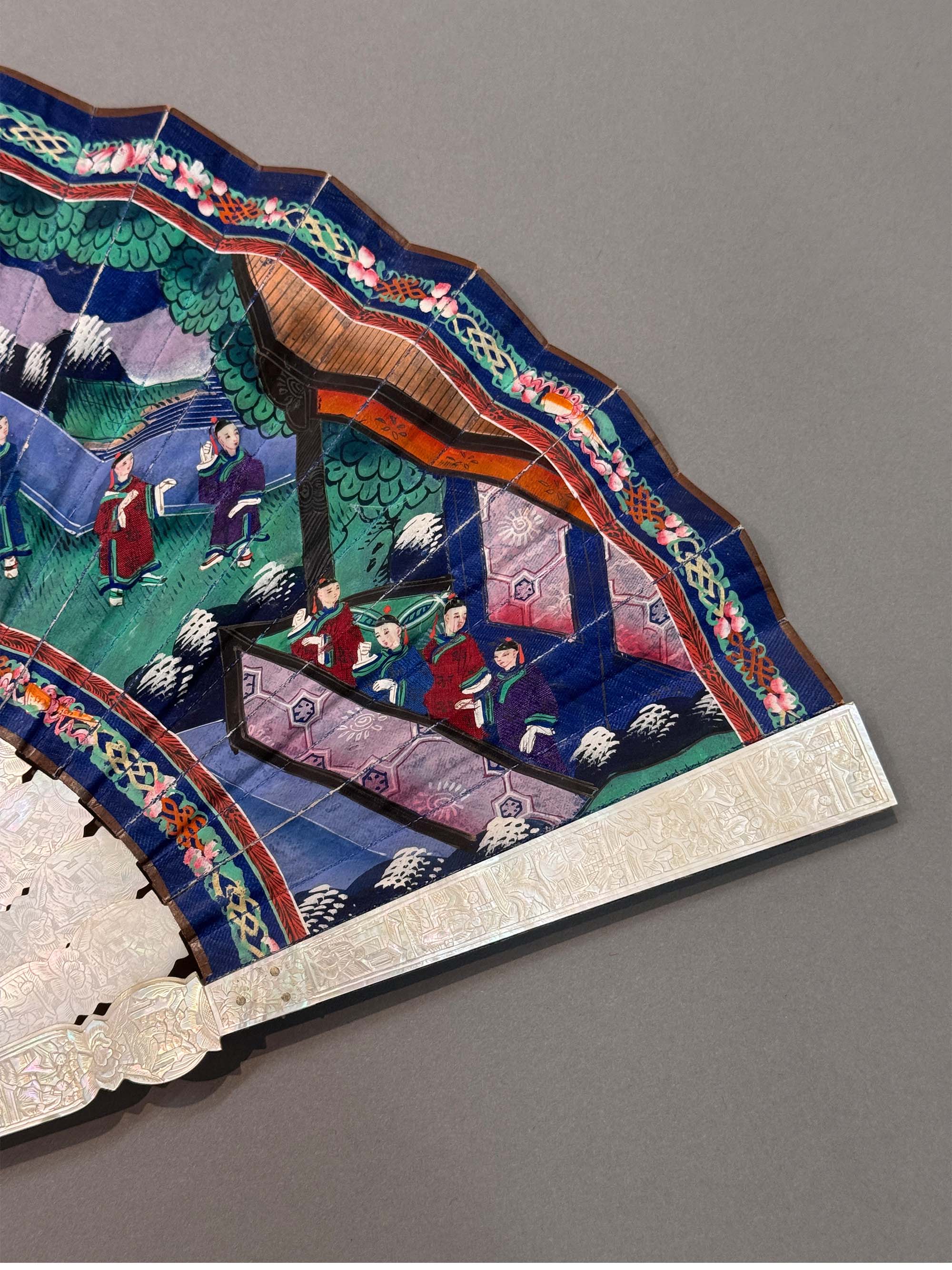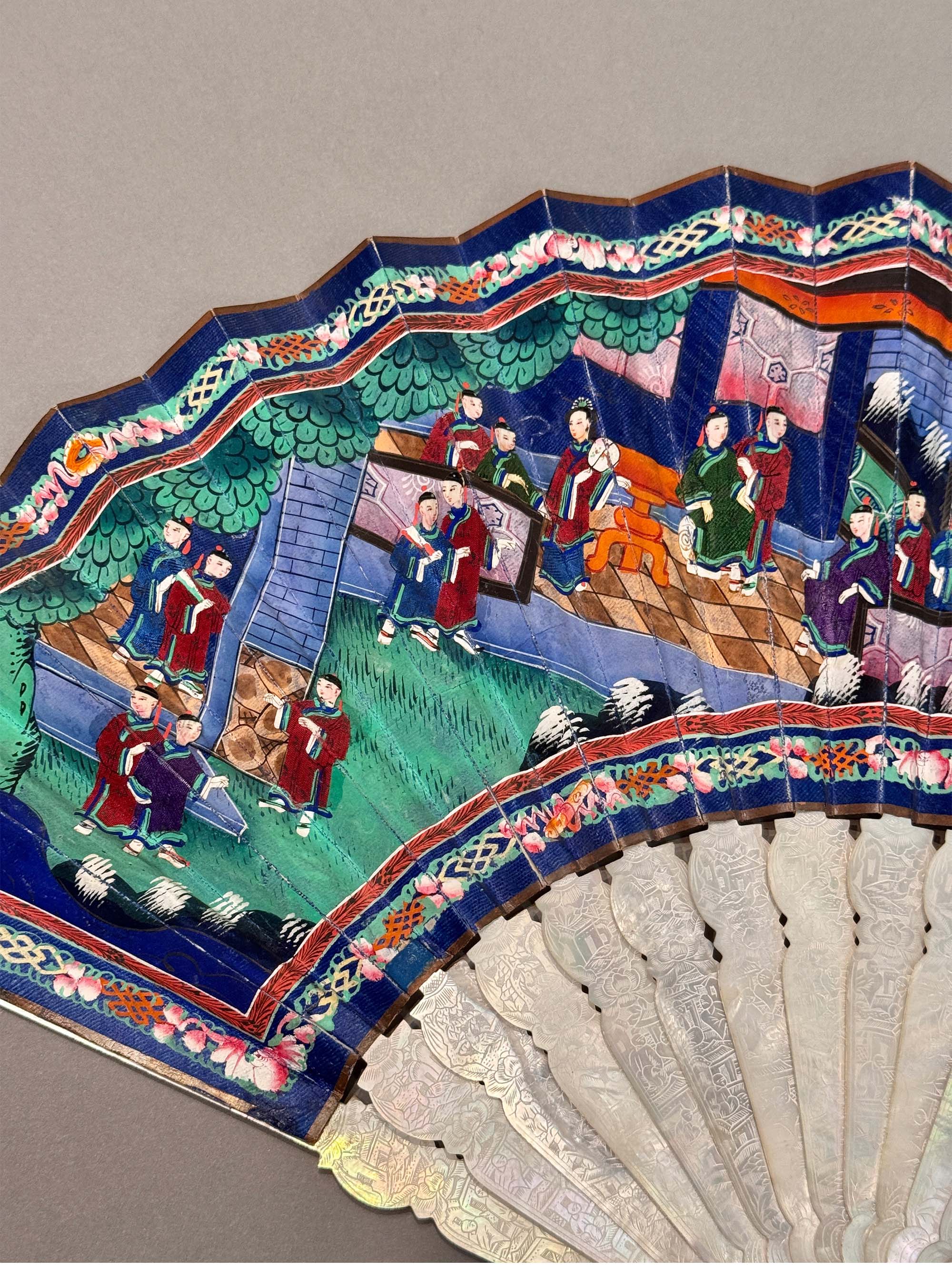 19世纪中国广东十三行出品母贝精雕扇骨装饰官邸人物主题纸本彩绘双扇面折扇