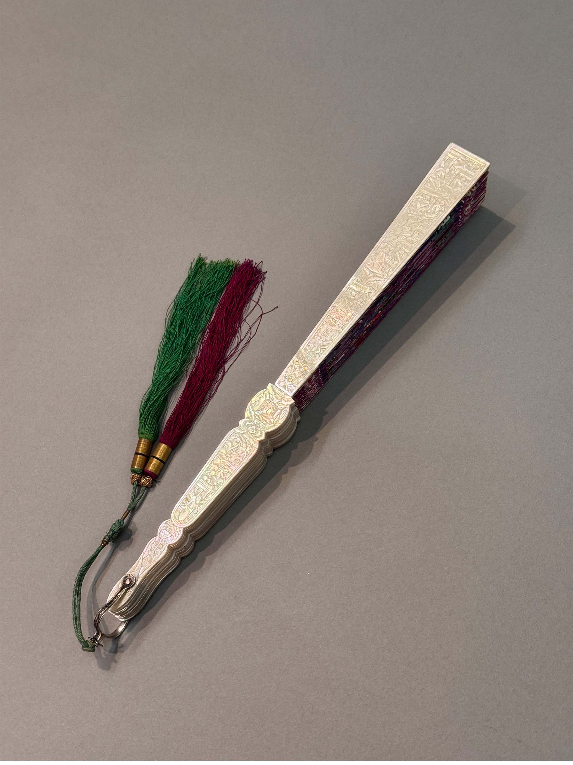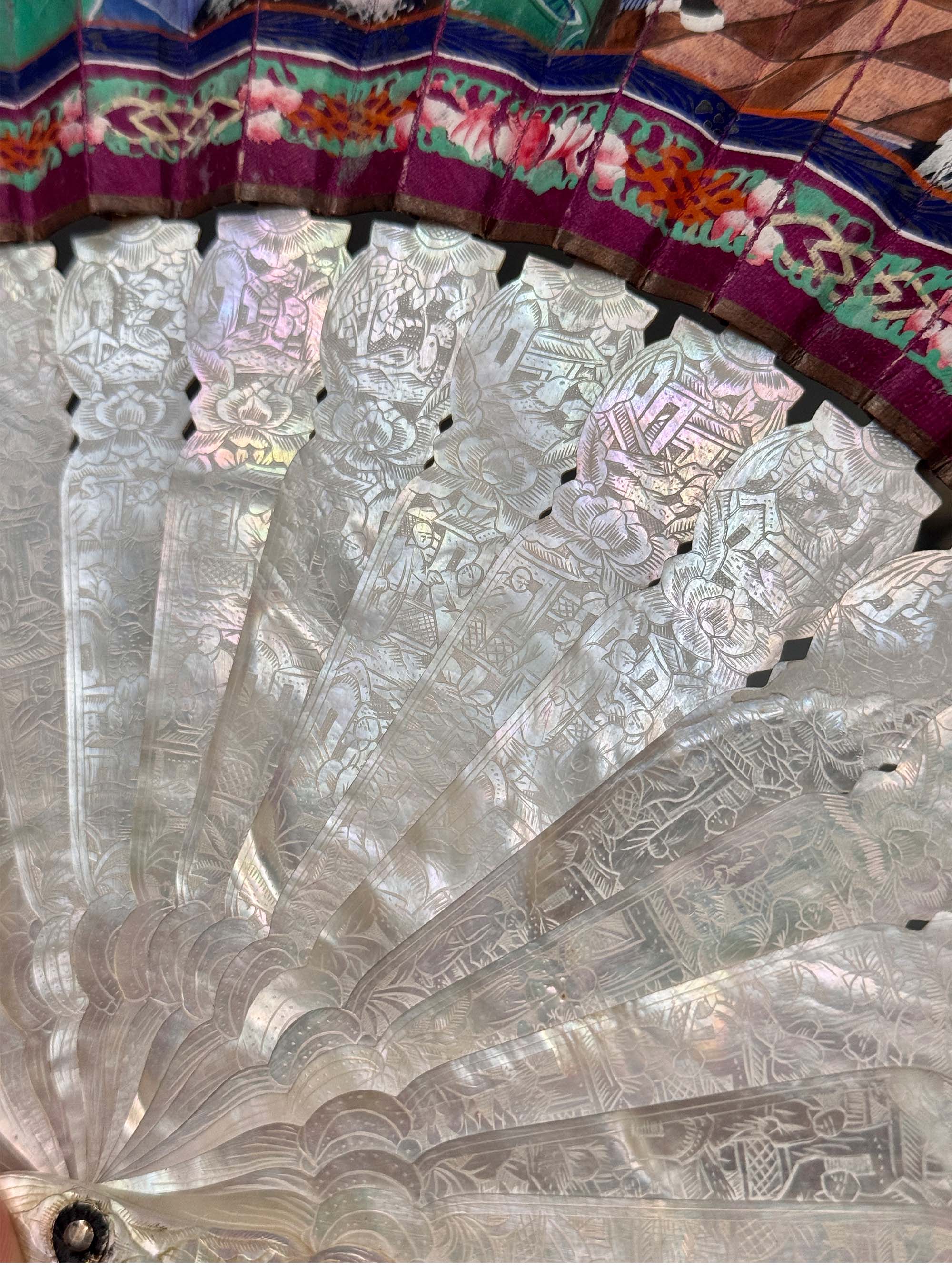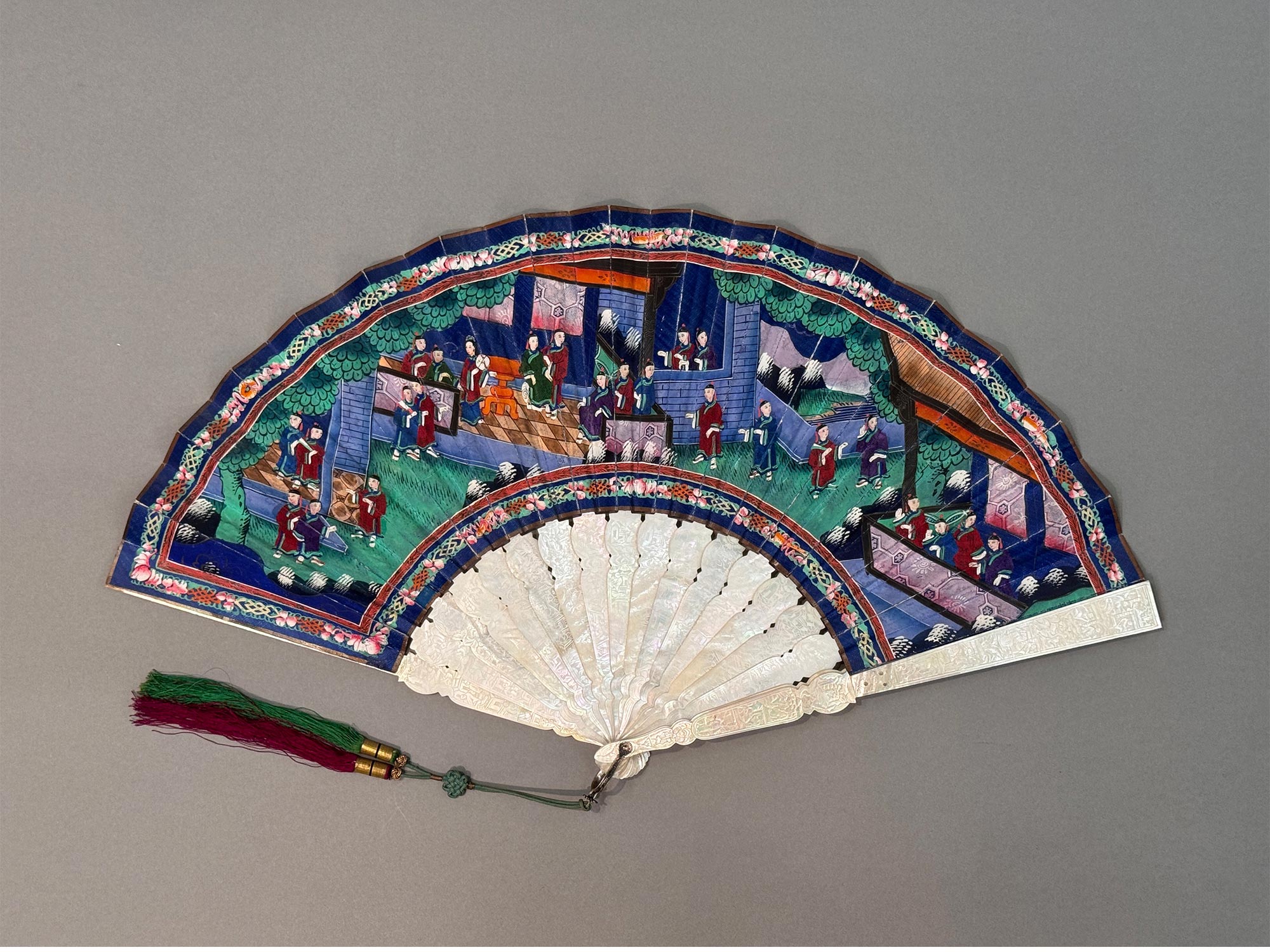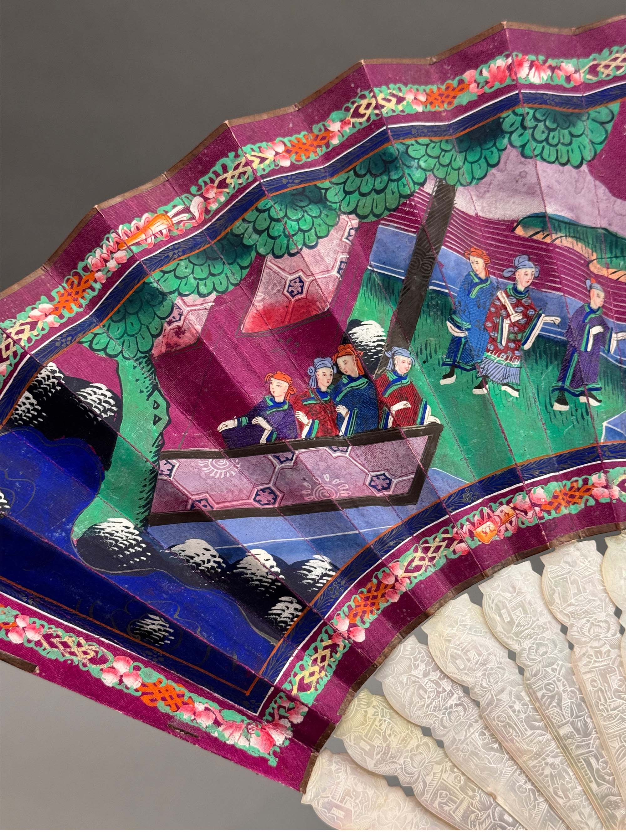 19世纪中国广东十三行出品母贝精雕扇骨装饰官邸人物主题纸本彩绘双扇面折扇