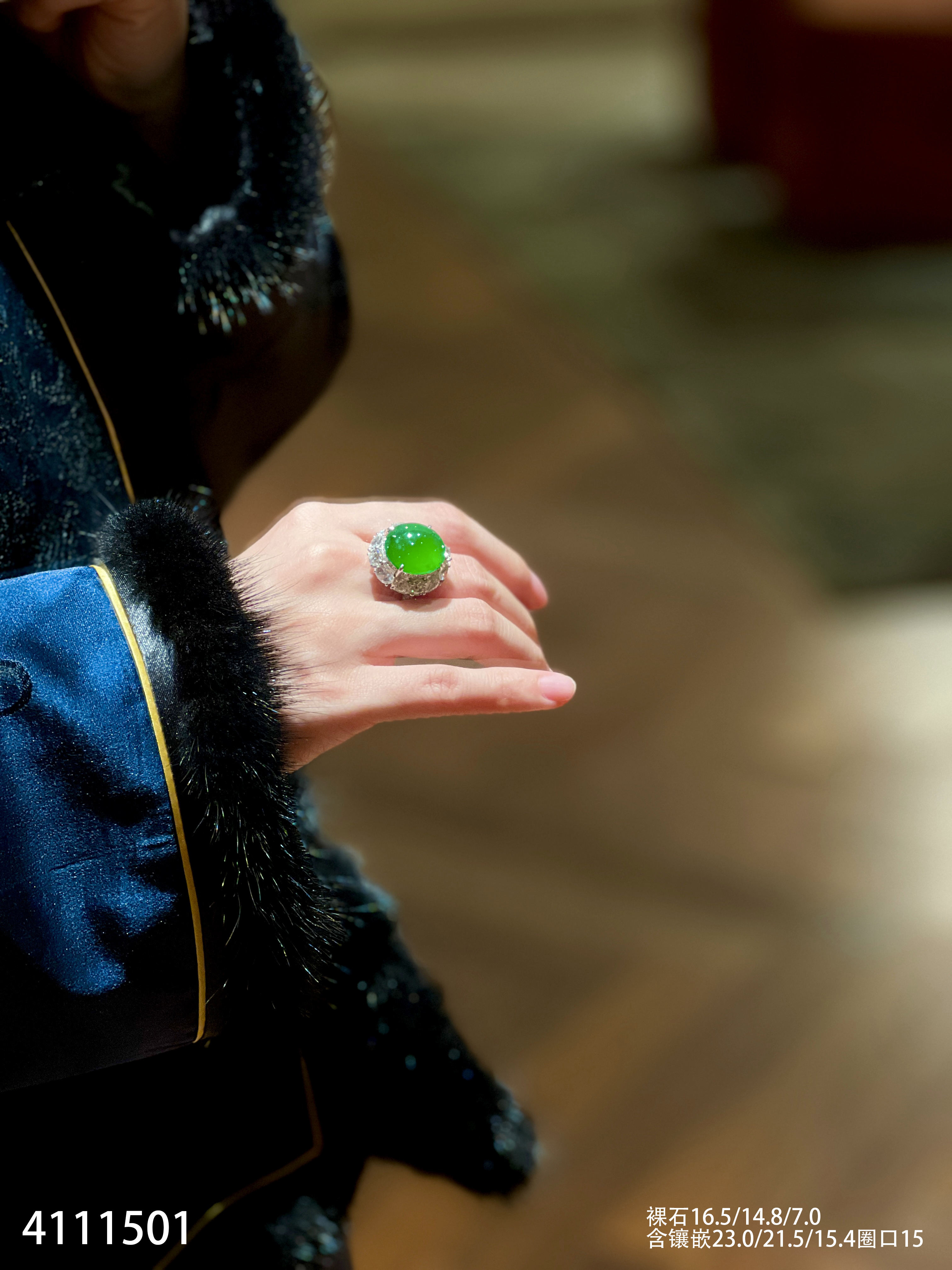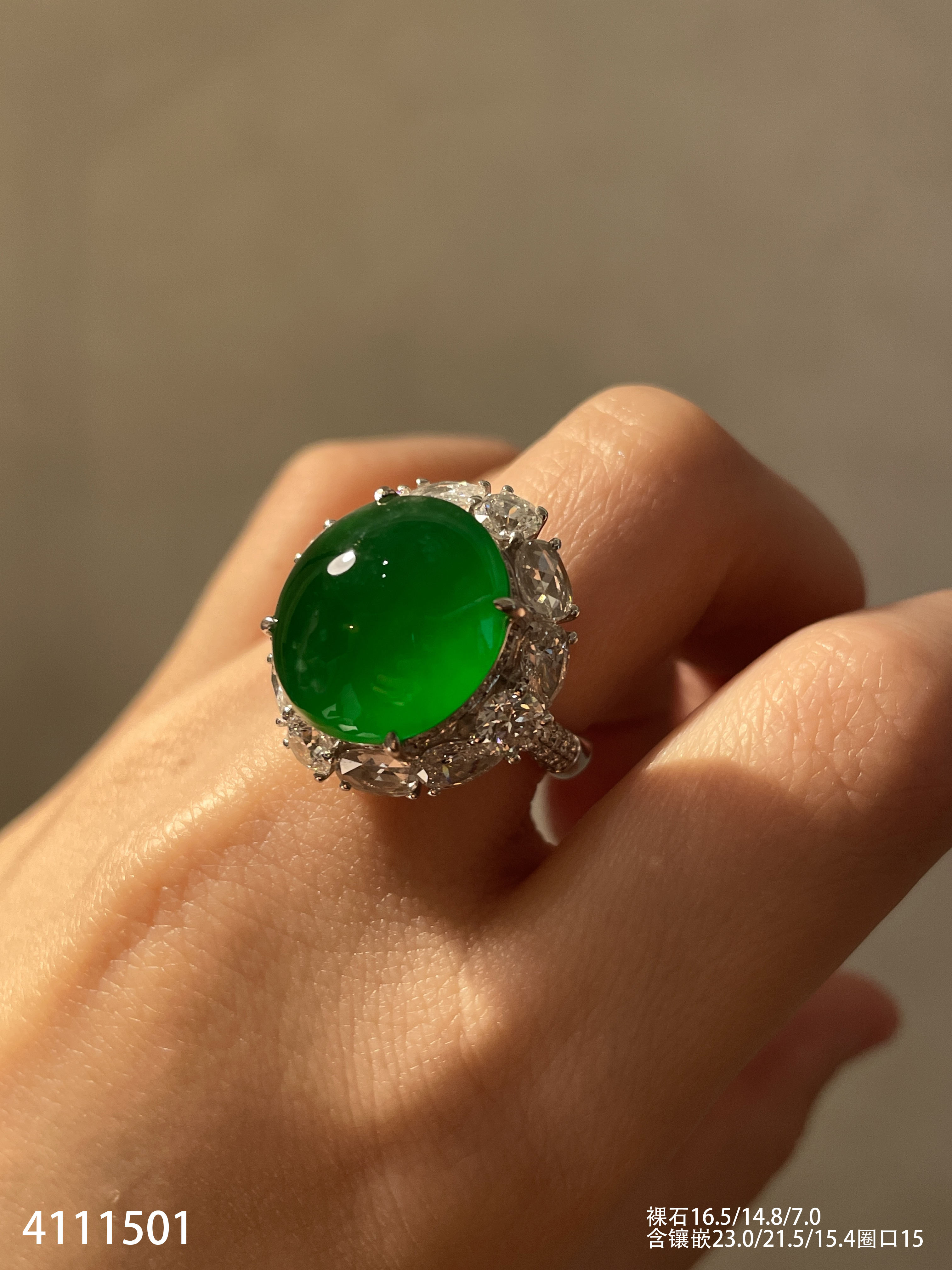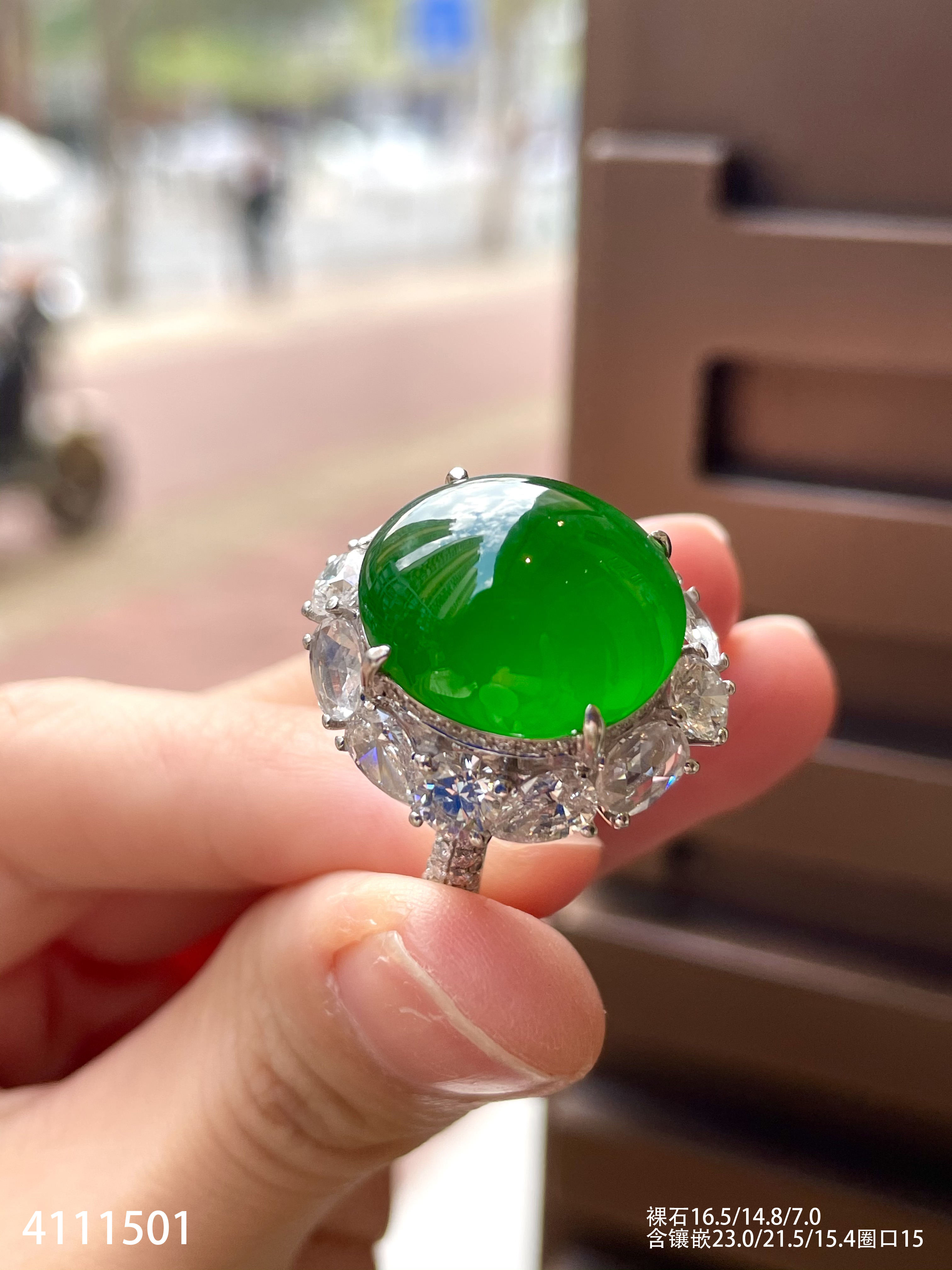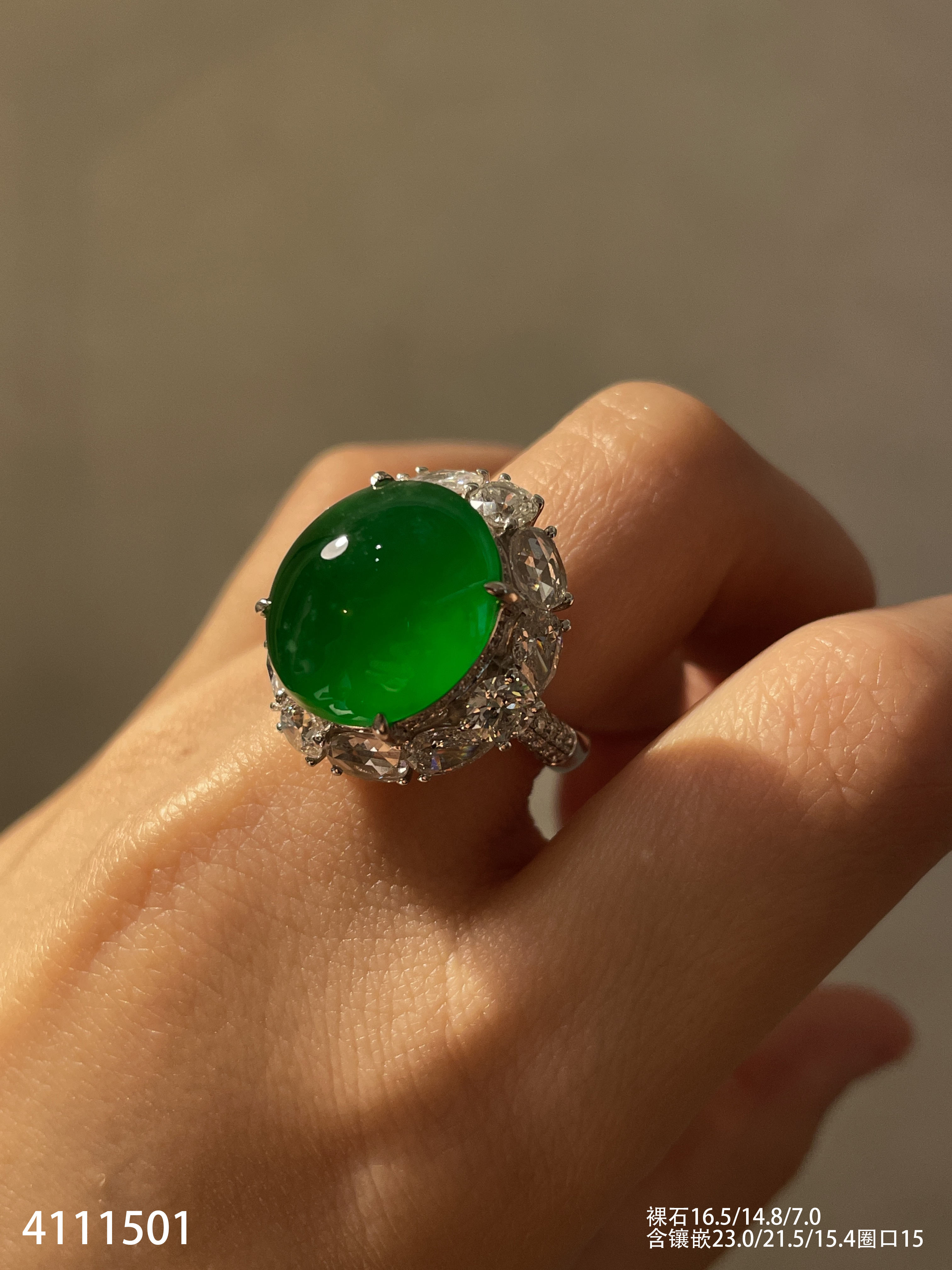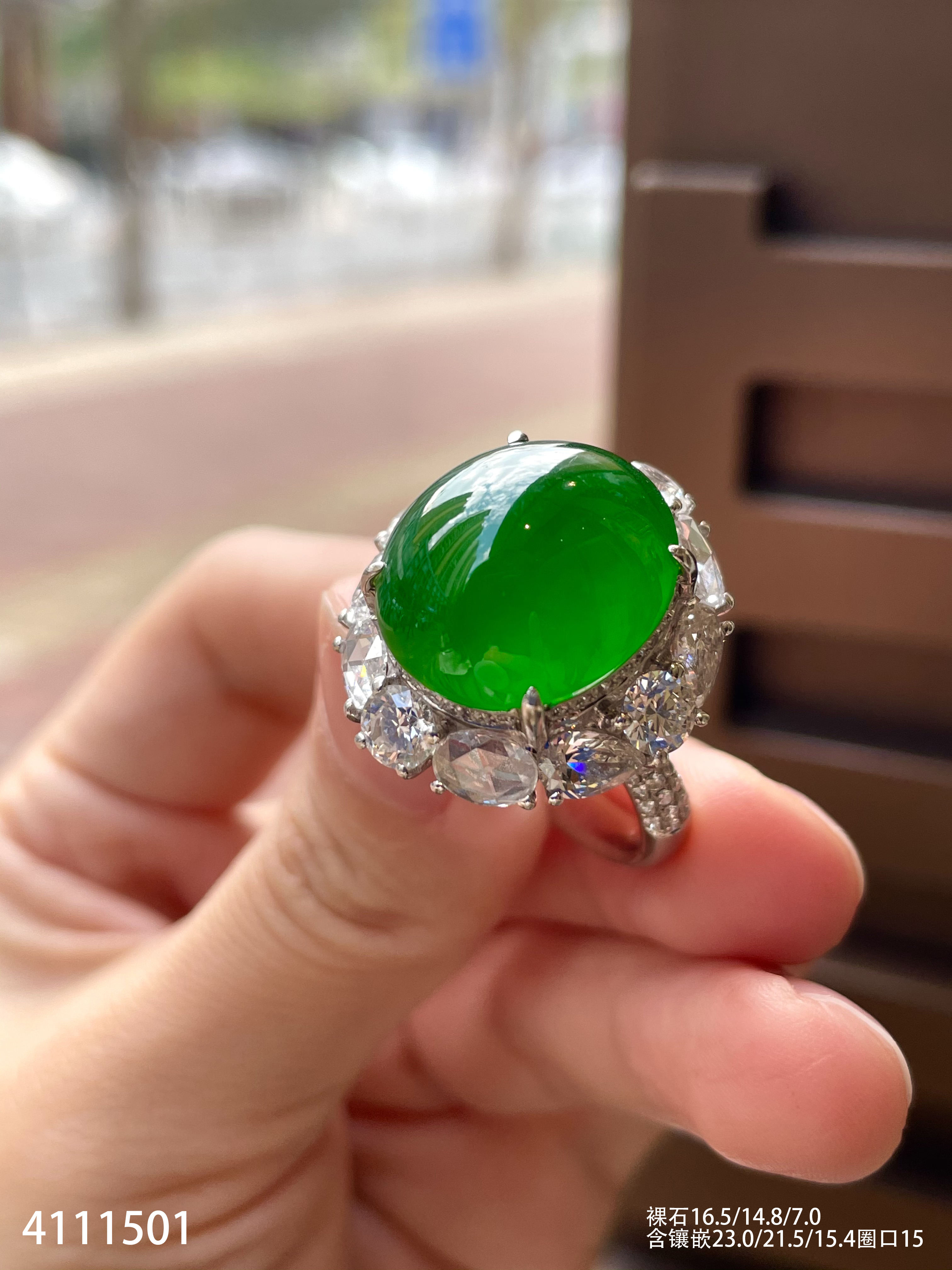 4111501,老坑高冰帝王绿蛋面戒指。具体价格微信咨询