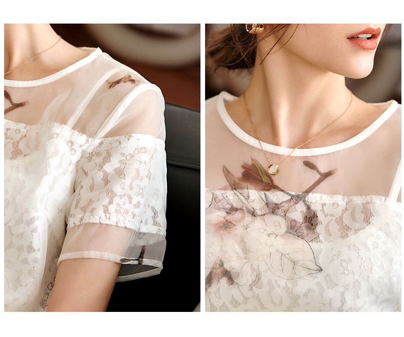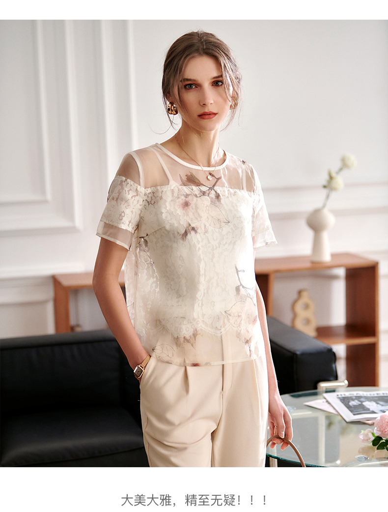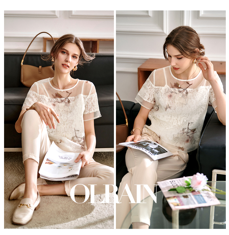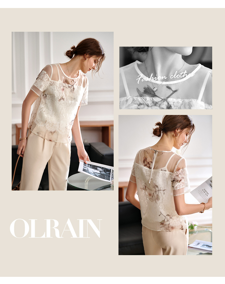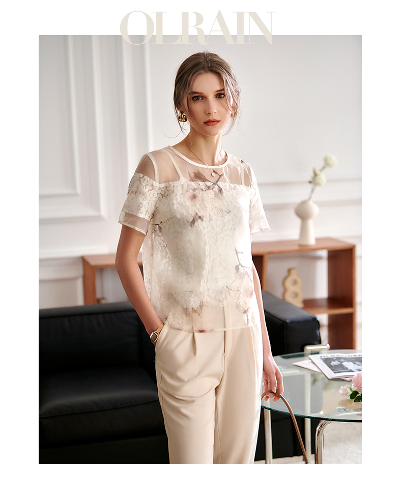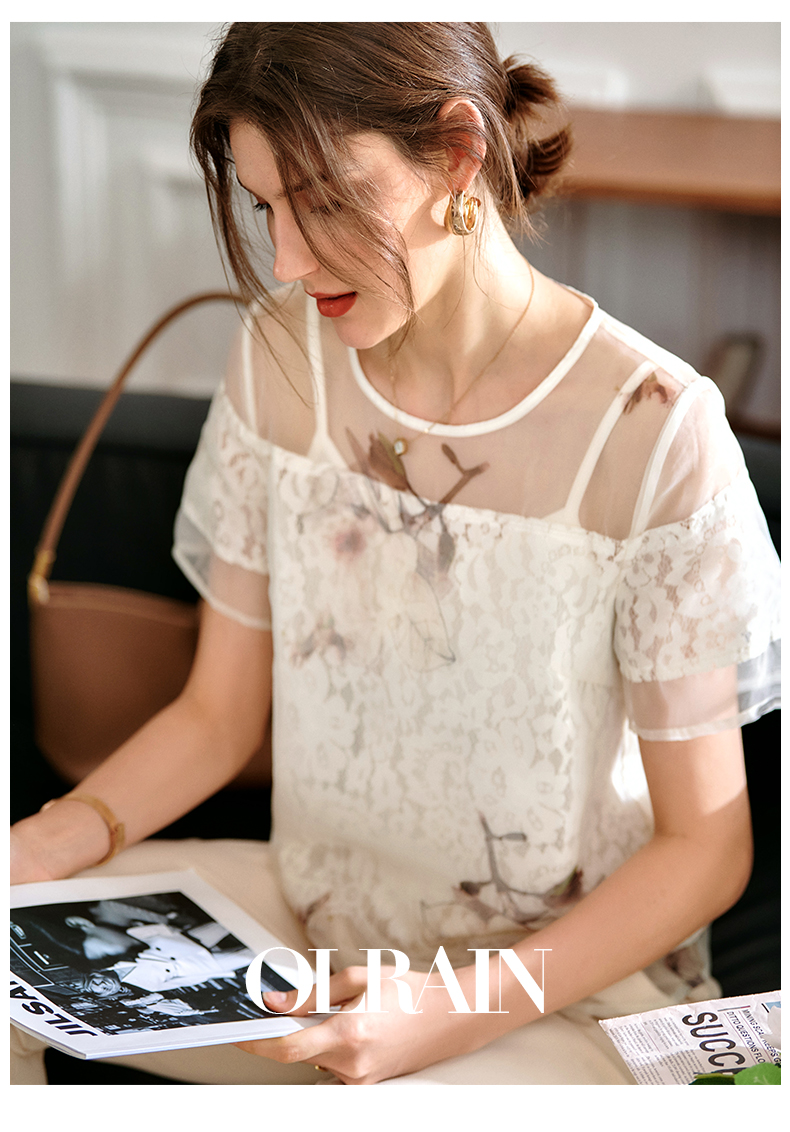 OLrain法式高级穿搭白色雪纺衫女夏季2022年新款欧根纱印花套头衫06XS81193
