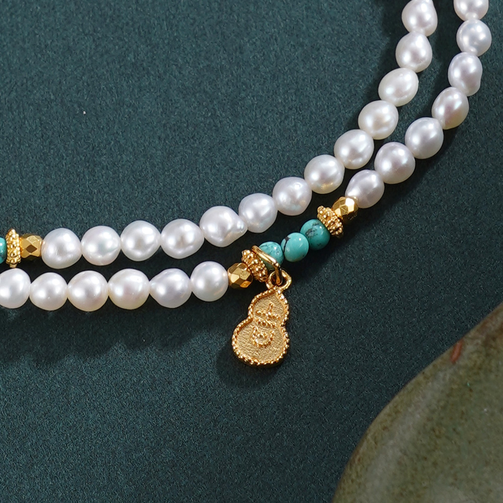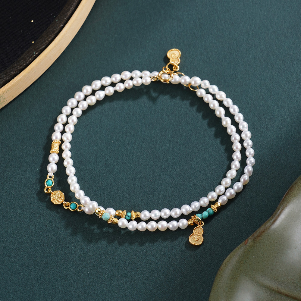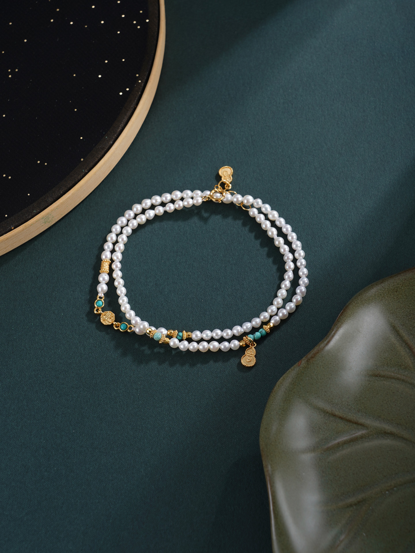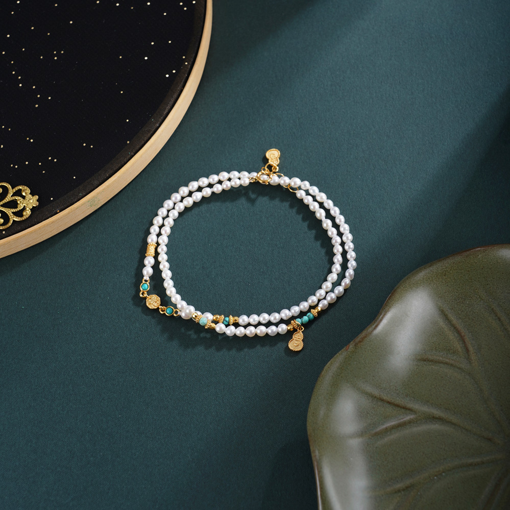 子佩集【福禄双华】银S925珍珠惜王妃手链【QNS0006】3mm珠镀金绿松石葫芦2601