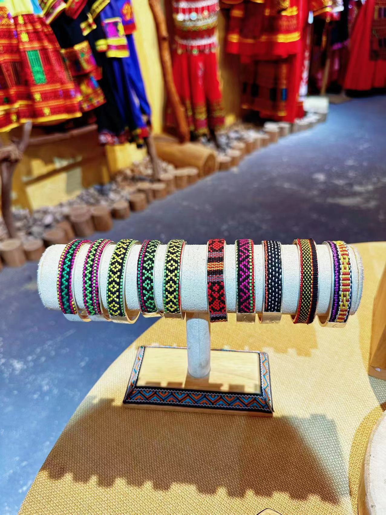 黎锦手镯,是裁剪于黎锦几何纹及秧纹部分,色彩丰富,佩戴时尚。
