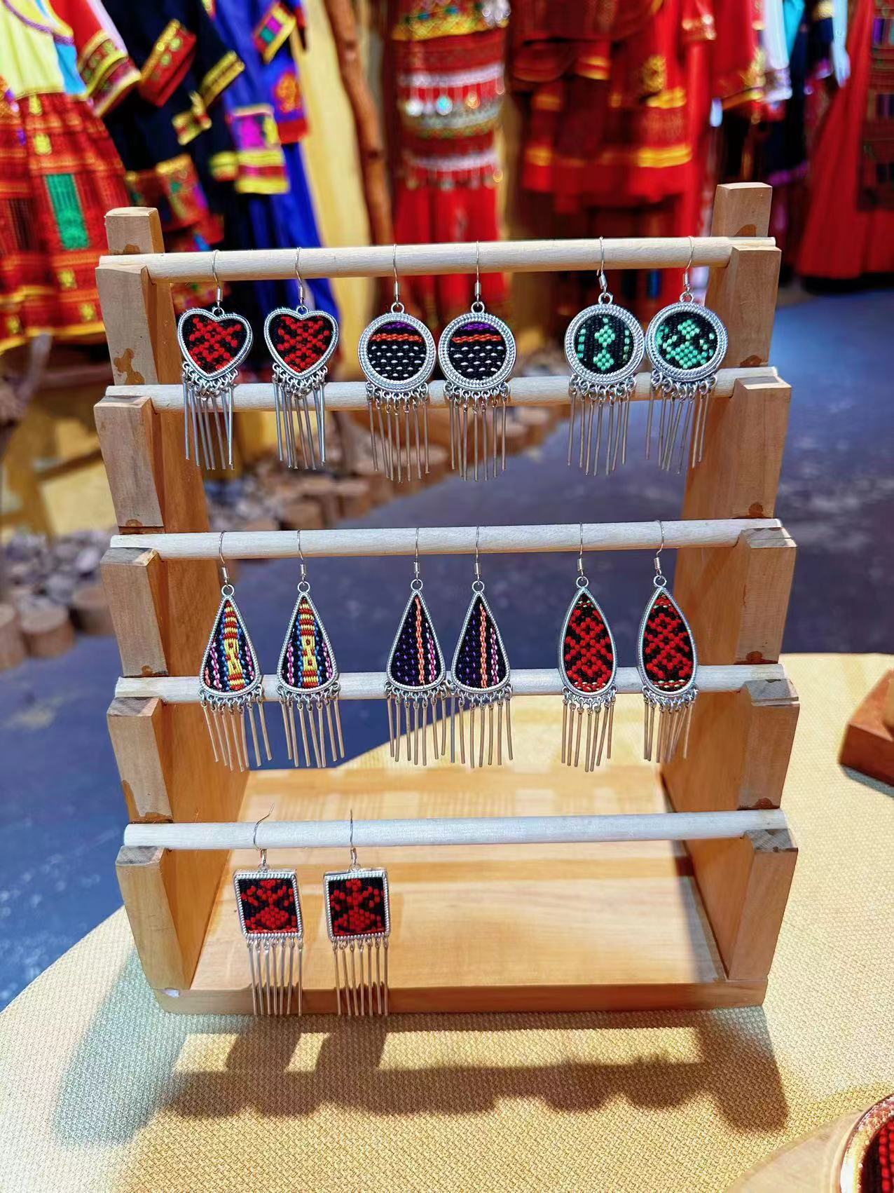 黎锦耳环,耳钉部分采用925银质挂耳有效的防止部分人群金属过敏情况,图案部分选用手工黎锦裁剪,其带有人形纹几何纹部分作为点缀,人形纹象征着守护。