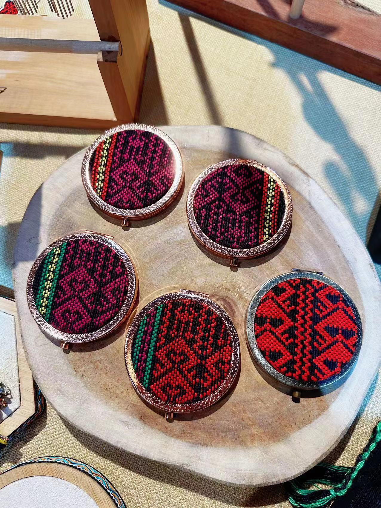 黎锦小圆镜,是裁剪手工黎锦中的人形纹/甘工鸟纹作为主要花纹镶嵌于镜子之上,人形纹在黎族人民心中代表着守护,甘工鸟纹象征着爱情于勇敢。