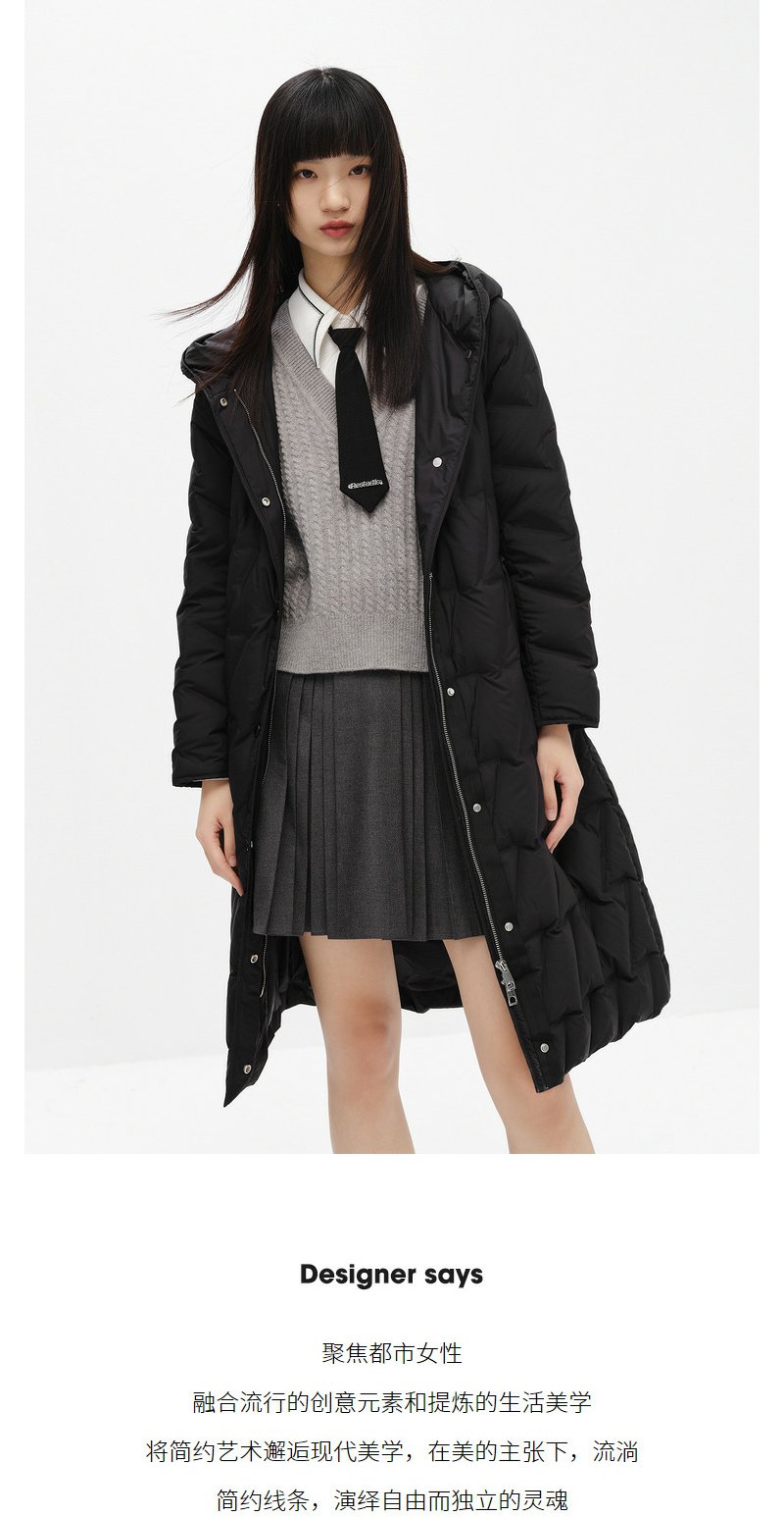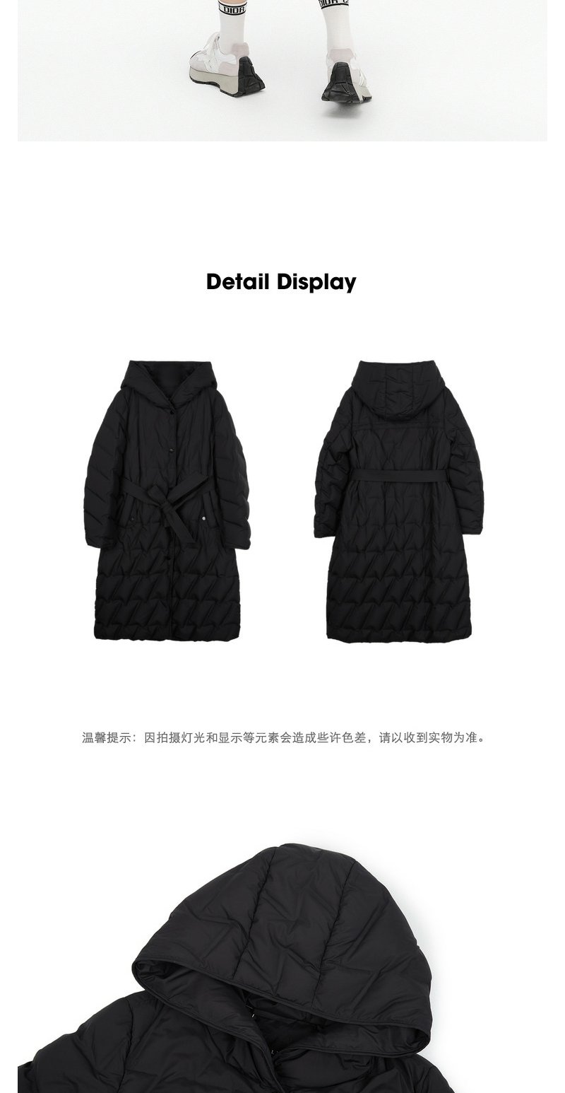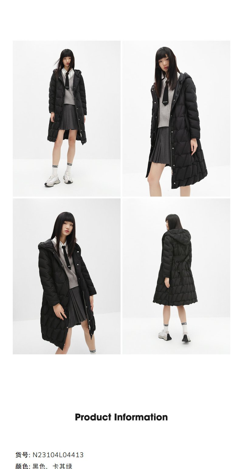 NEELLY纳俪商场同款冬季羽绒服女长款过膝腰带显瘦连帽外套N23104L04413