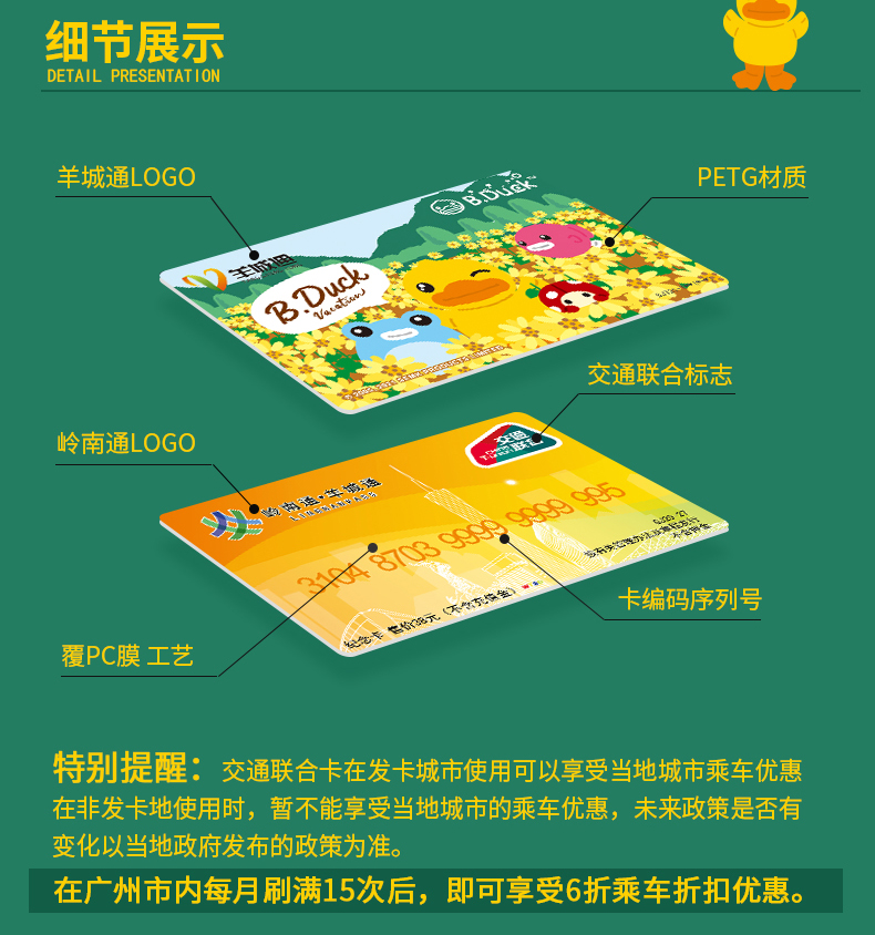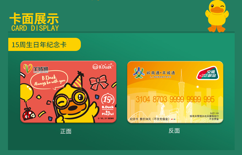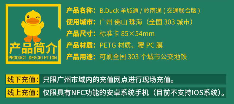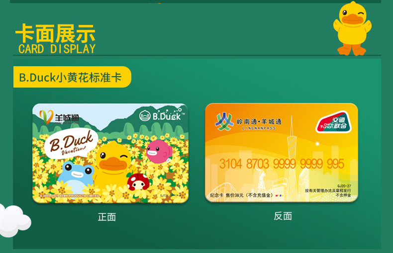 本产品不含充值金,充值后使用,享受羊城通相关优惠政策。“B.Duck”羊城通纪念卡与本商城其他商品分开发货,运费分开计算。