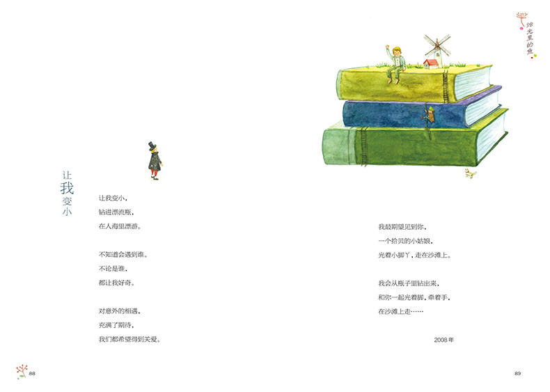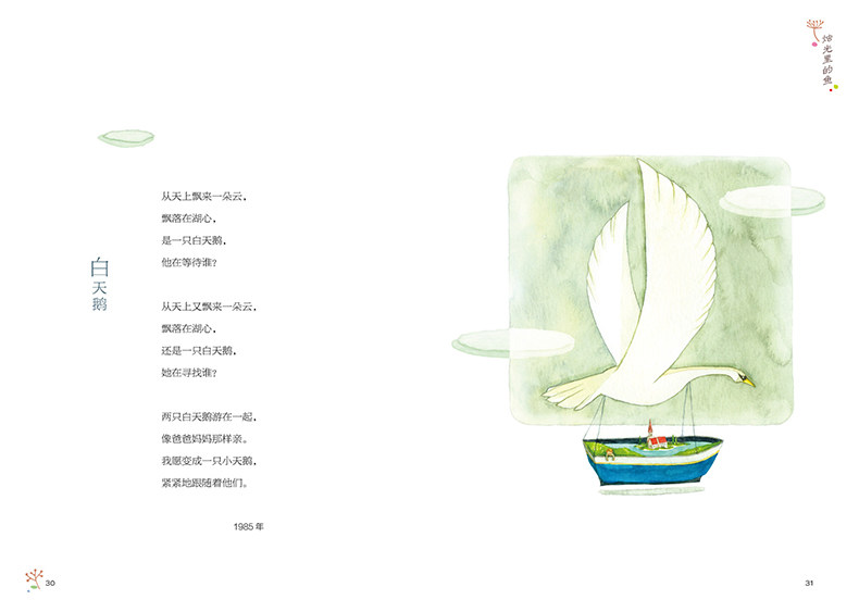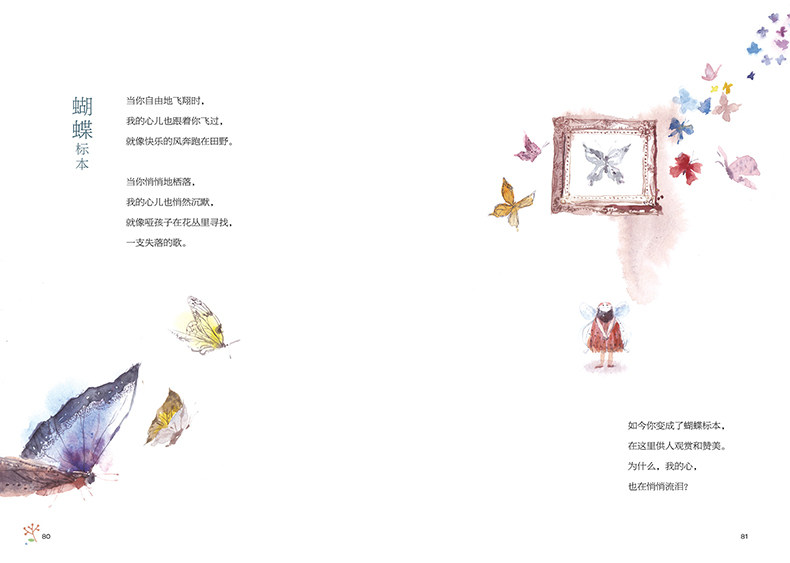 鸟儿,鱼儿,黑夜,白猫,这些都是童年生活中最常见的事物,甚至在孩子自己创作的诗歌中,也只能说是很普通的意象。可是在大诗人的笔下,竟显示出如此非凡的文学魅力。对诗歌仍有所眷恋的读者,还会记得埃兹拉·庞德那首经典的《在一个地铁车站》:“人群中这些面孔幽灵一般显现,湿漉漉的黑色枝条上的许多花瓣。”我们从小时候一路走来,成长着,成熟着,缜密的思辨能力日渐消磨了敏感的观察力与纯净的想象力,以至于面对这些令人激动的诗句时,不再眼含热泪,只能崇敬地仰望。而当下的孩子,趁他们不经意间说出的“孩子话”还能令成年人惊叹,给他们一部专属于小时候的诗,可谓正当时。