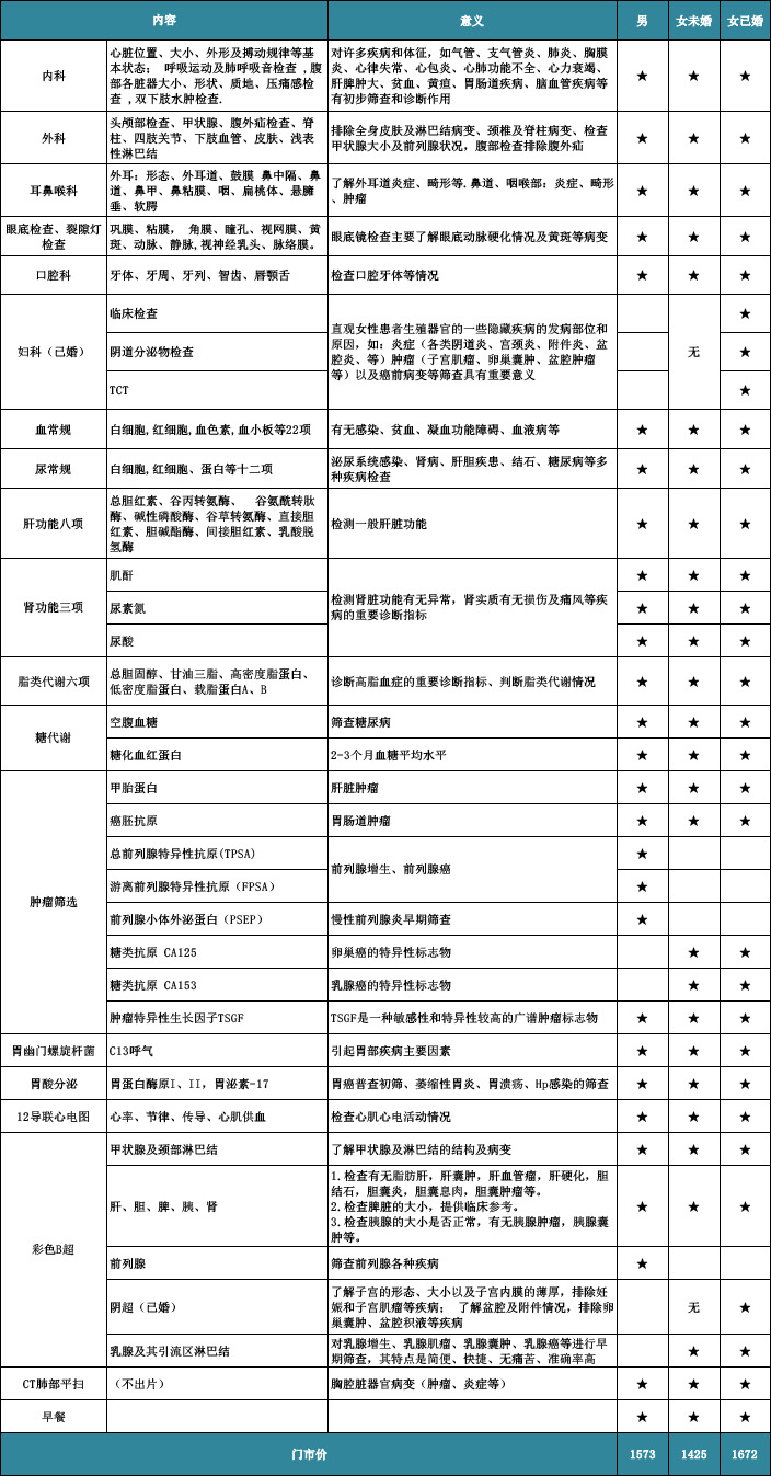 东方医院体检套餐一:原价:男性1573元,女已婚1672元
