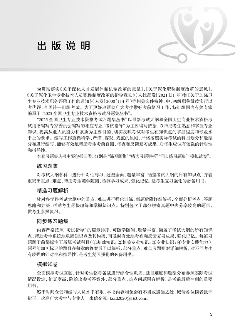由国家卫生健康委人才交流服务中心特组织国内有关专家、教授编写的“卫生专业技术资格考试指导”系列图书,紧跟考试大纲,按照考试指导用书、要点精编、练习题集、同步练习题集、精选习题解析、模拟试卷6本书进行编写,形成了考点讲解、习题演练和考前冲刺模拟的完整备考体系。书中内容重在考查大纲中要求的临床常见病、多发病的病因、发病机制、临床表现、辅助检查、治疗要点、护理措施,以及护理学基础的有关理论和操作技术。本书针对各学科考试大纲中的重点、难点进行强化训练,每题后附详细解析,全面分析考点、答题思路和方法,帮助考生尽快理解和掌握知识点。特别包含了部分解密真题中失分率较高的题目,供考生参照复习。