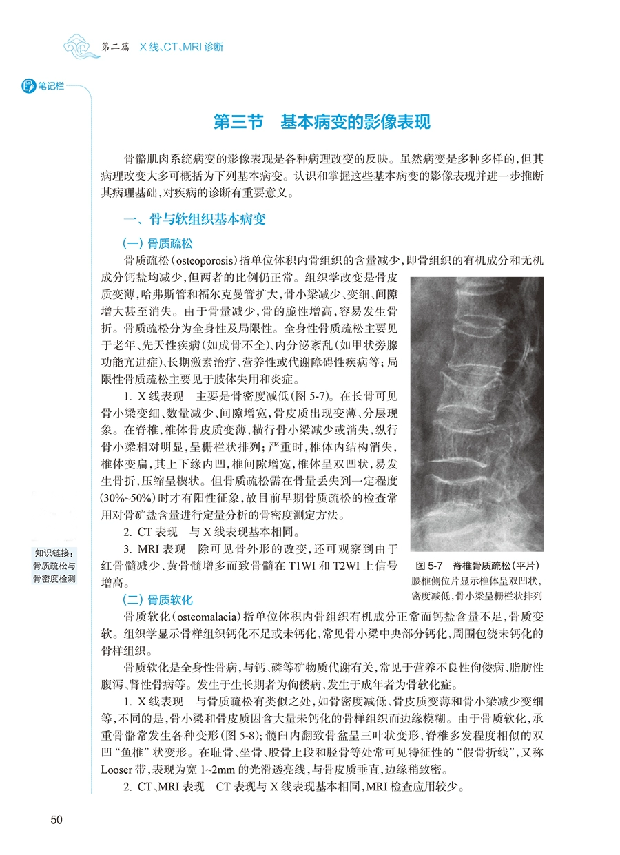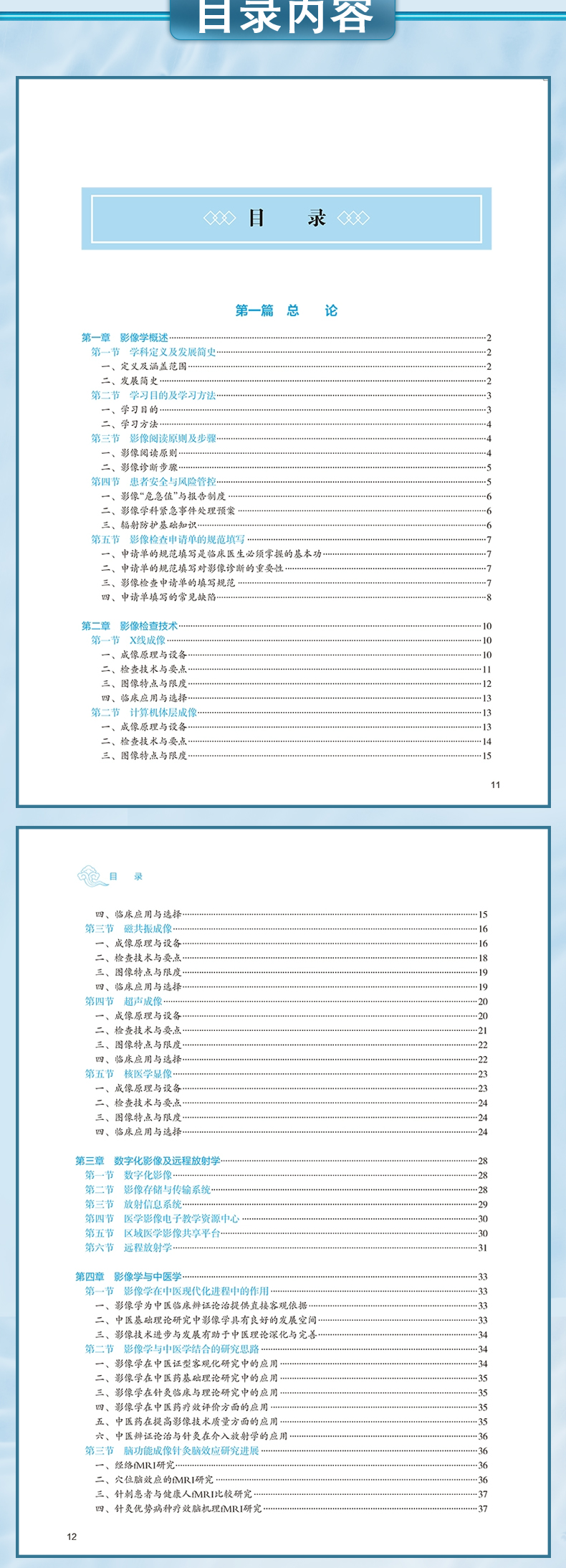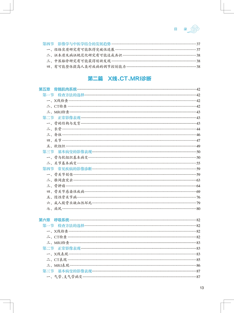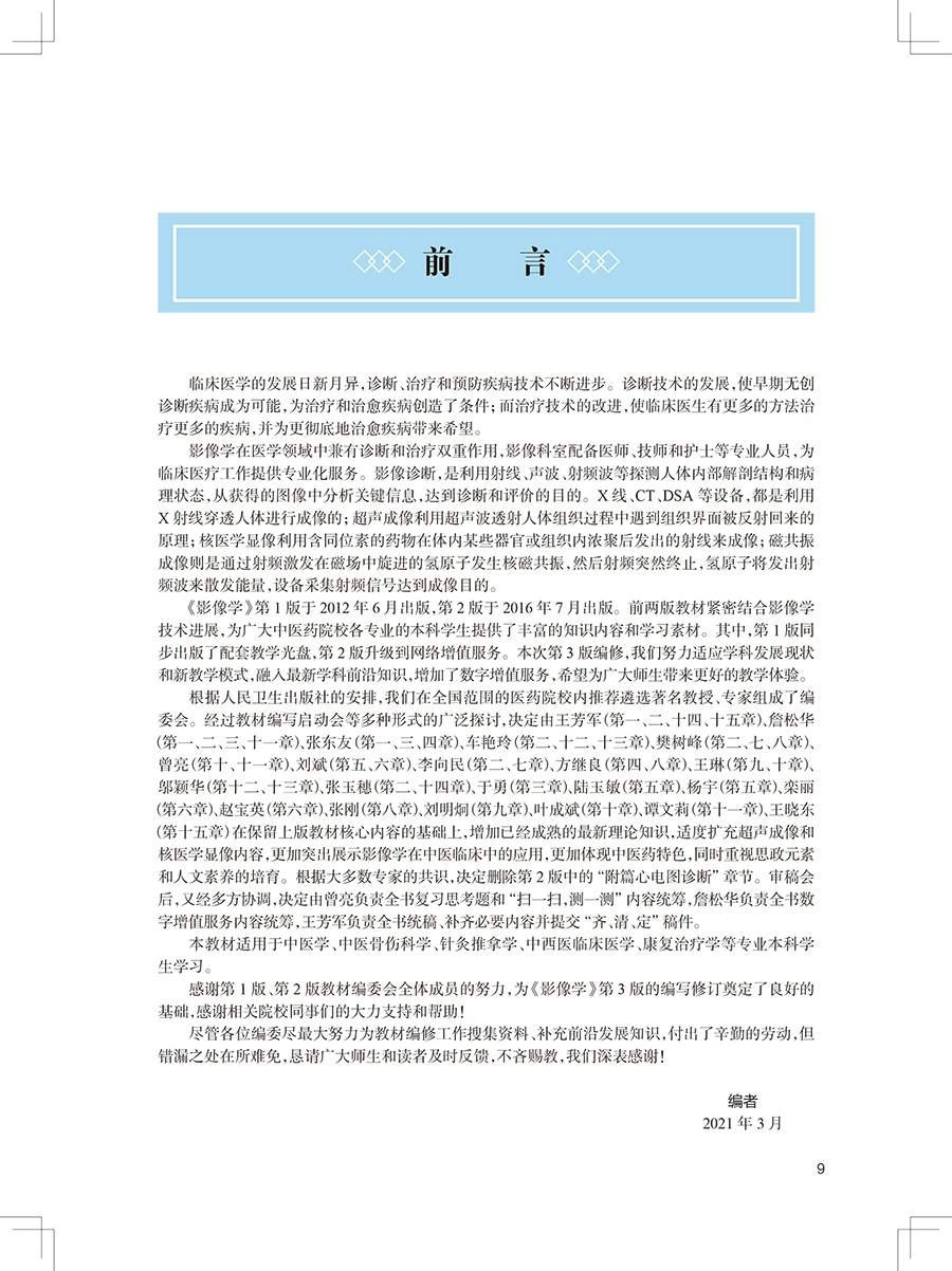 影像学在医学领域中兼有诊断和治疗双重作用,影像科室配备医师、技师和护士等专业人员,为临床医疗工作提供专业化服务。影像诊断,是利用射线、声波、射频波等探测人体内部解剖结构和病理状态,从获得的图像中分析关键信息,达到诊断和评价的目的。X线、CT、DSA 等设备,都是利用X 射线穿透人体进行成像的。前两版教材紧密结合影像学技术进展,为广大中医药院校各专业的本科学生提供了丰富的知识内容和学习素材。本次第 3 版编修,我们努力适应学科发展现状和新教学模式,融入最新学科前沿知识,增加了数字增值服务,希望为广大师生带来更好的教学体验。