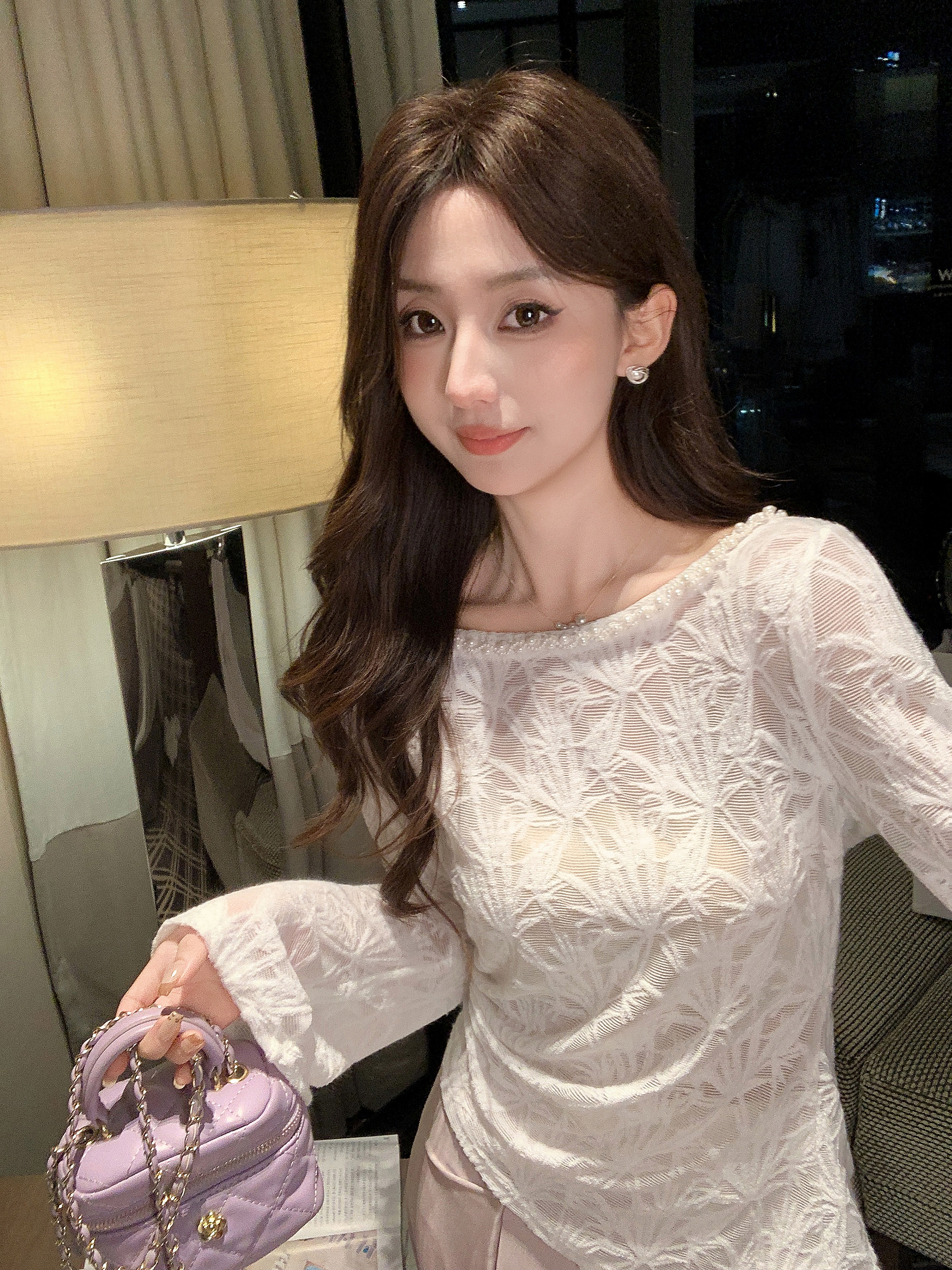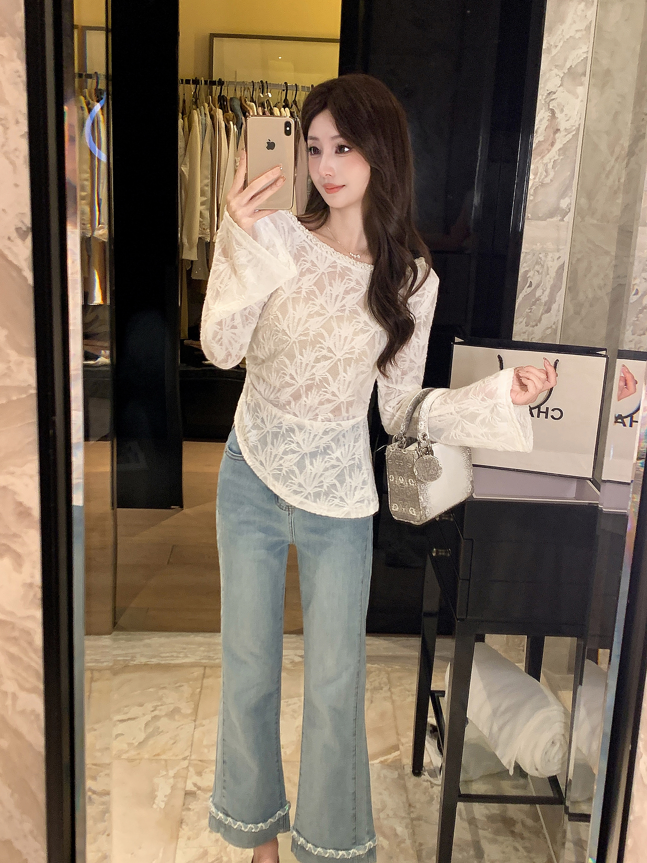 张心子【心动赴约】珍珠圆领竹叶纹蕾丝上衣 U2509035