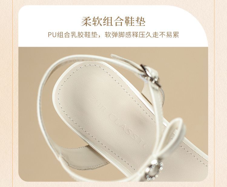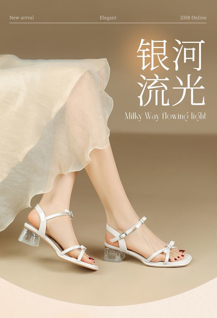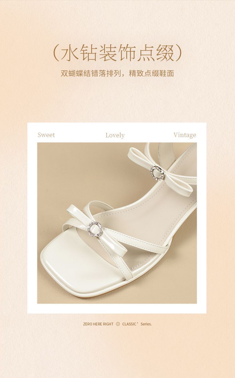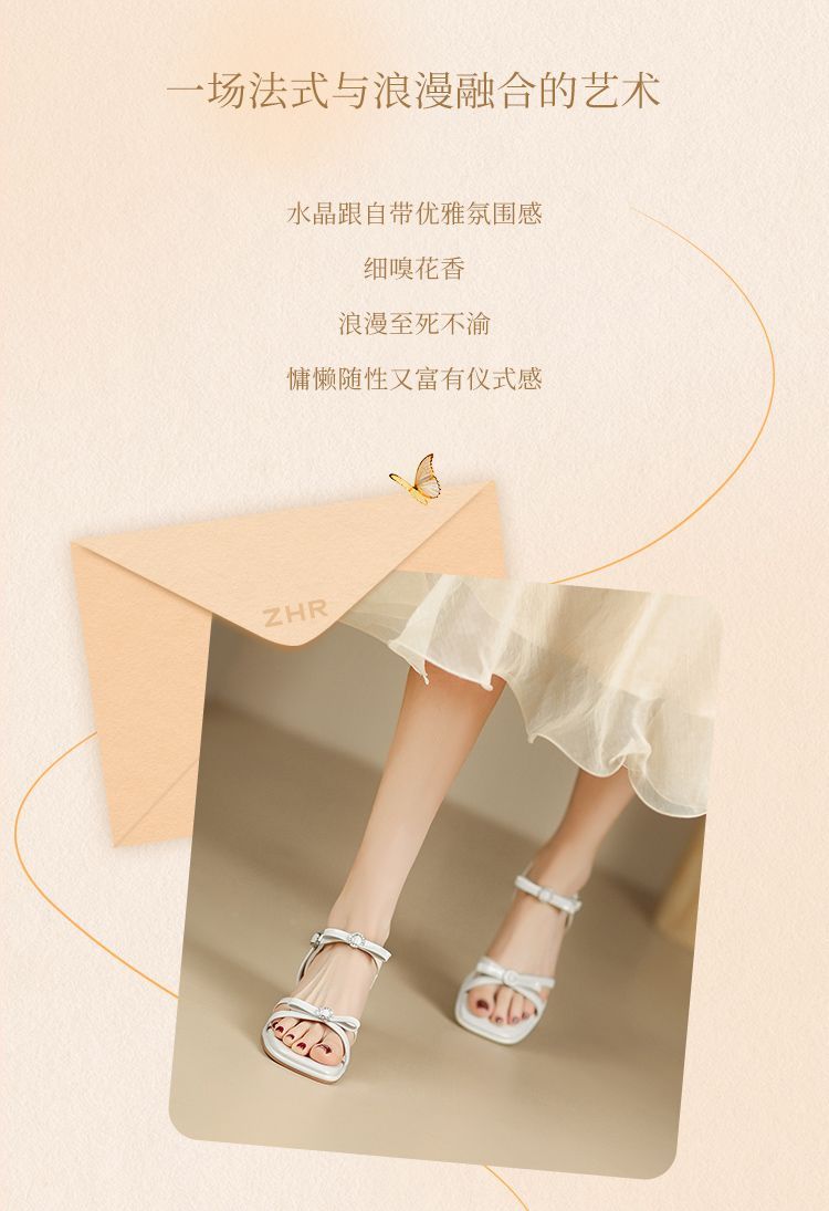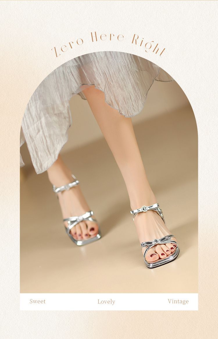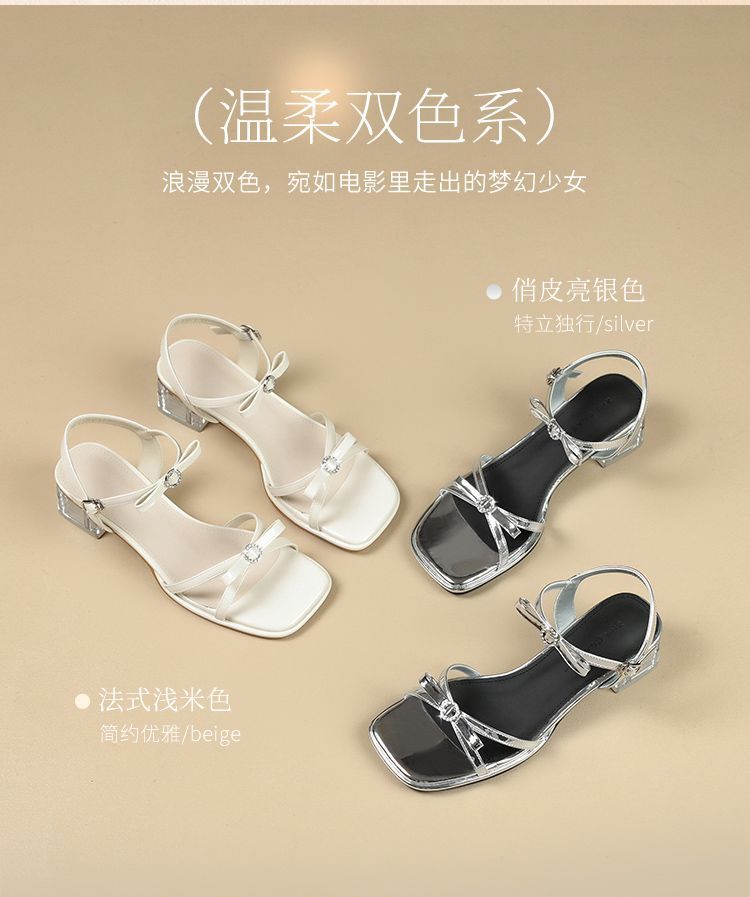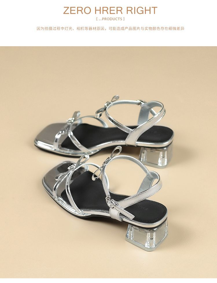 ZHR则则高级感银色蝴蝶结凉鞋法式一字带凉鞋款水晶粗跟凉鞋仙女