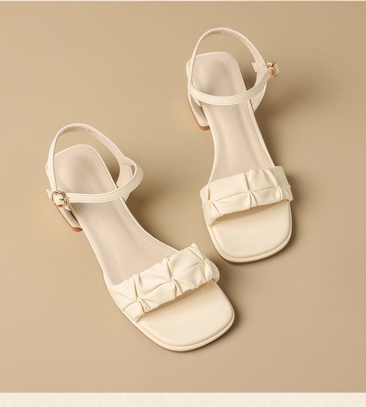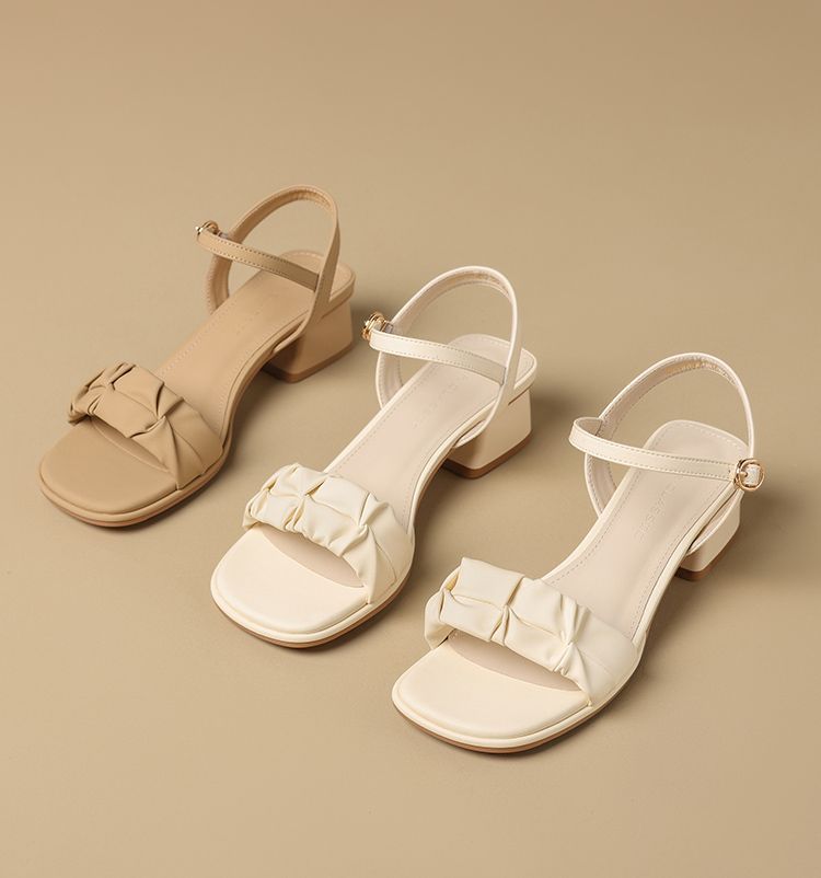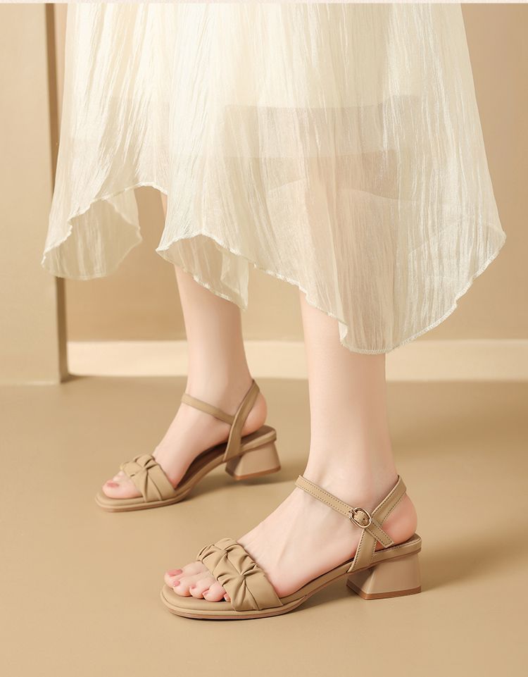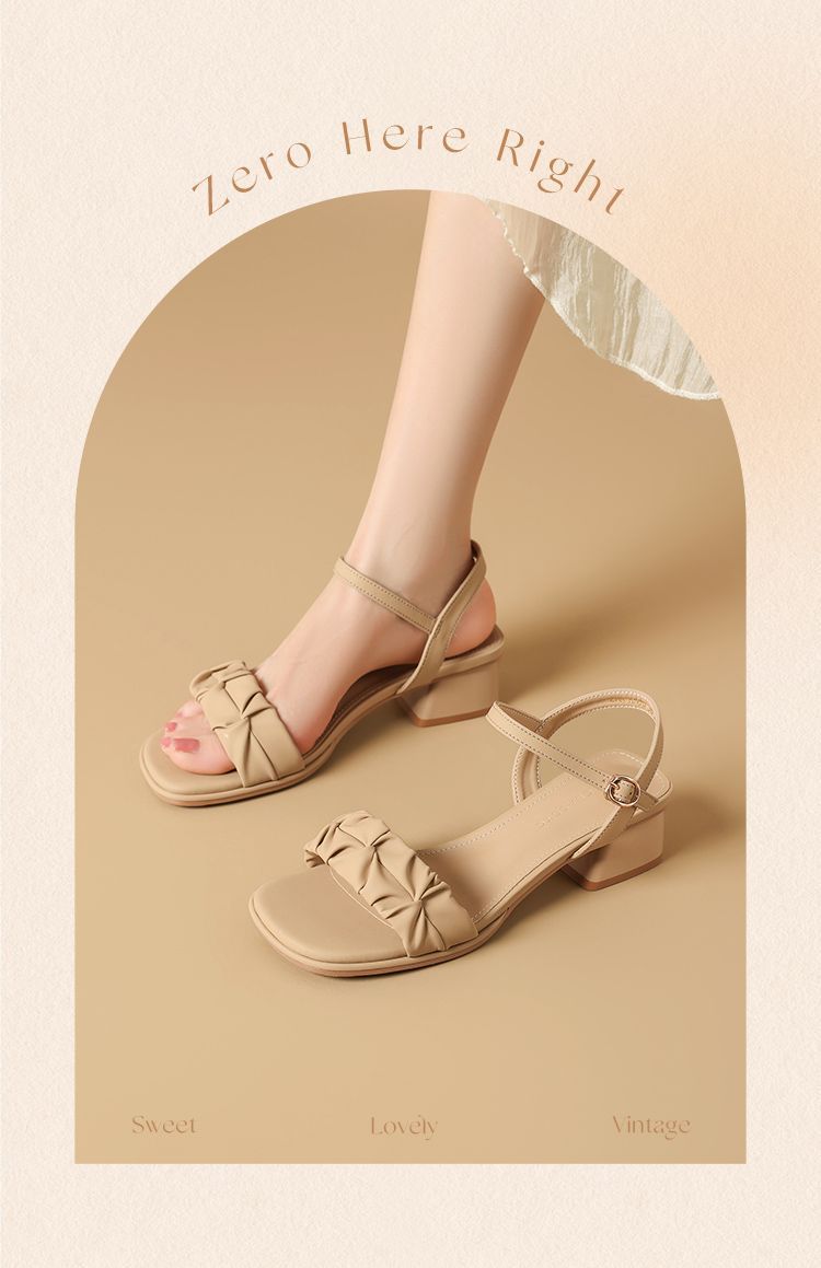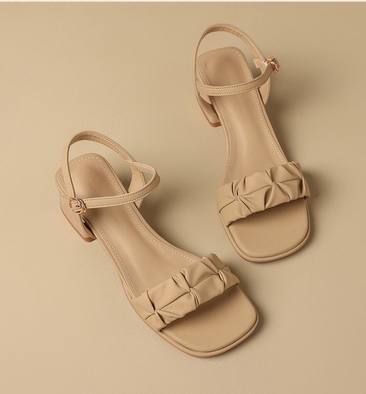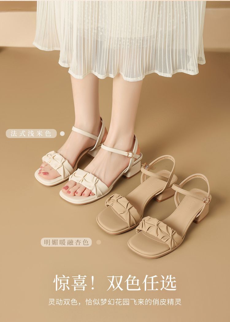 ZHR时装粗跟凉鞋2025夏季新款洋气褶皱一字凉鞋女网红ins高级女鞋