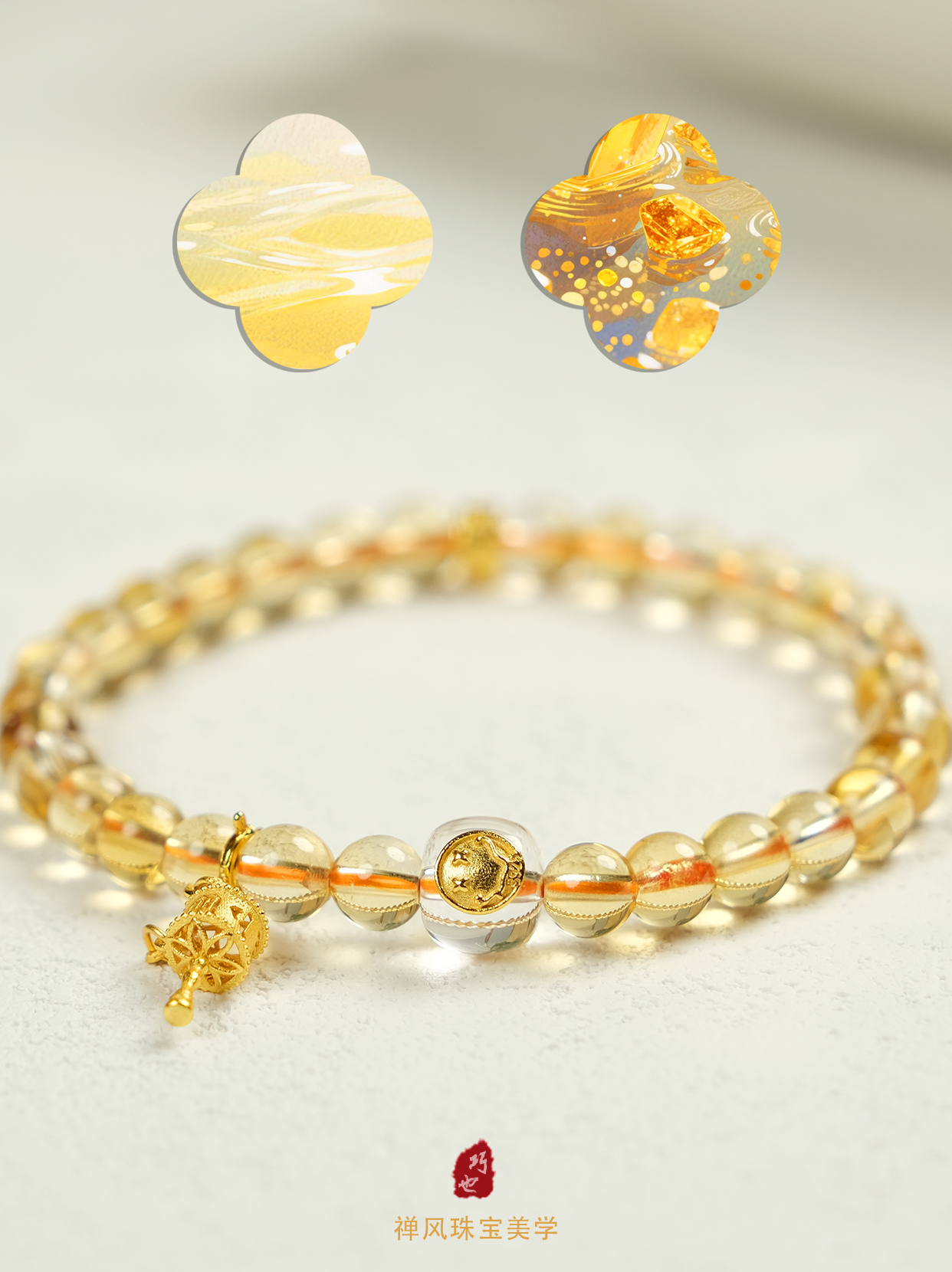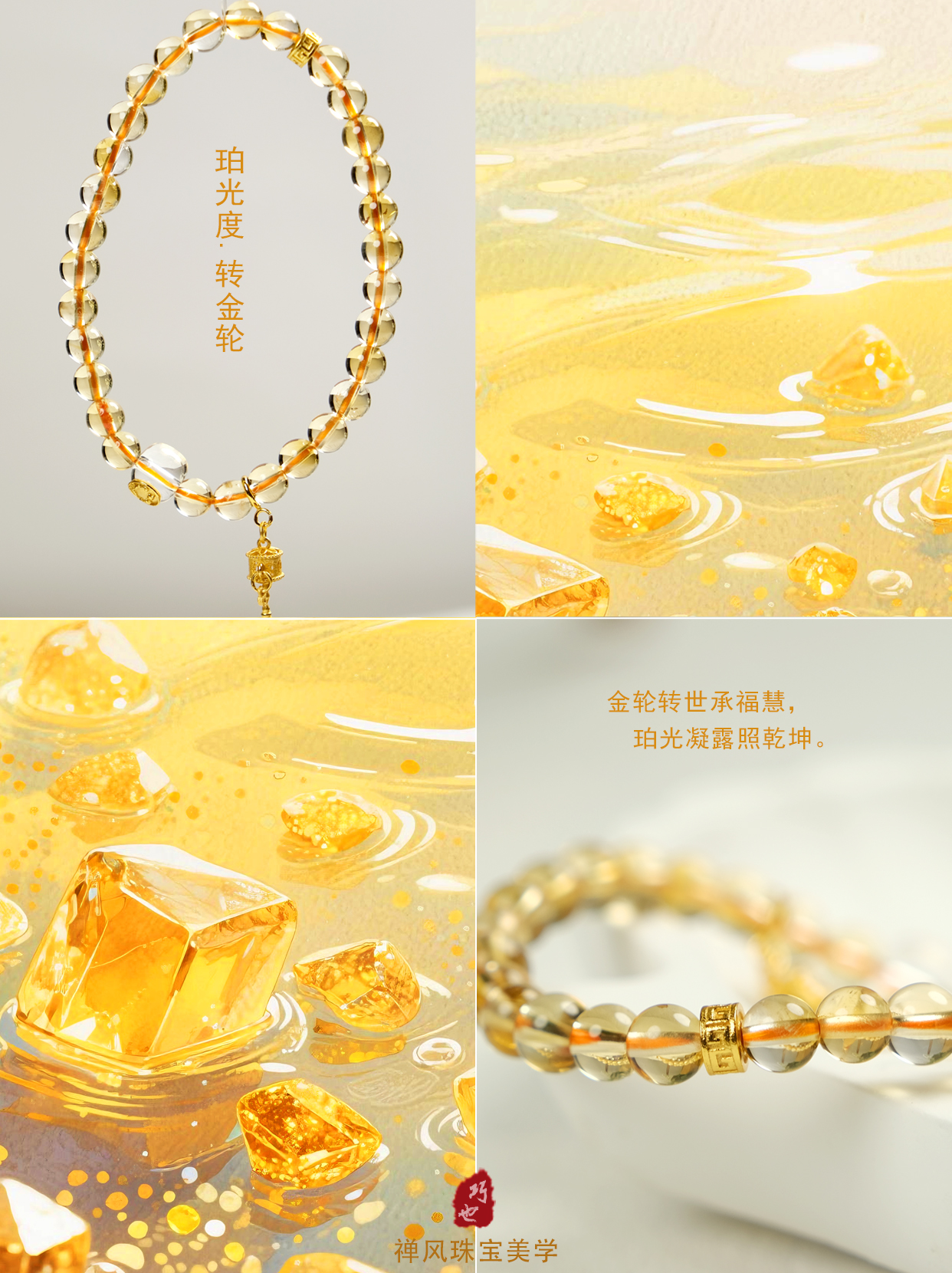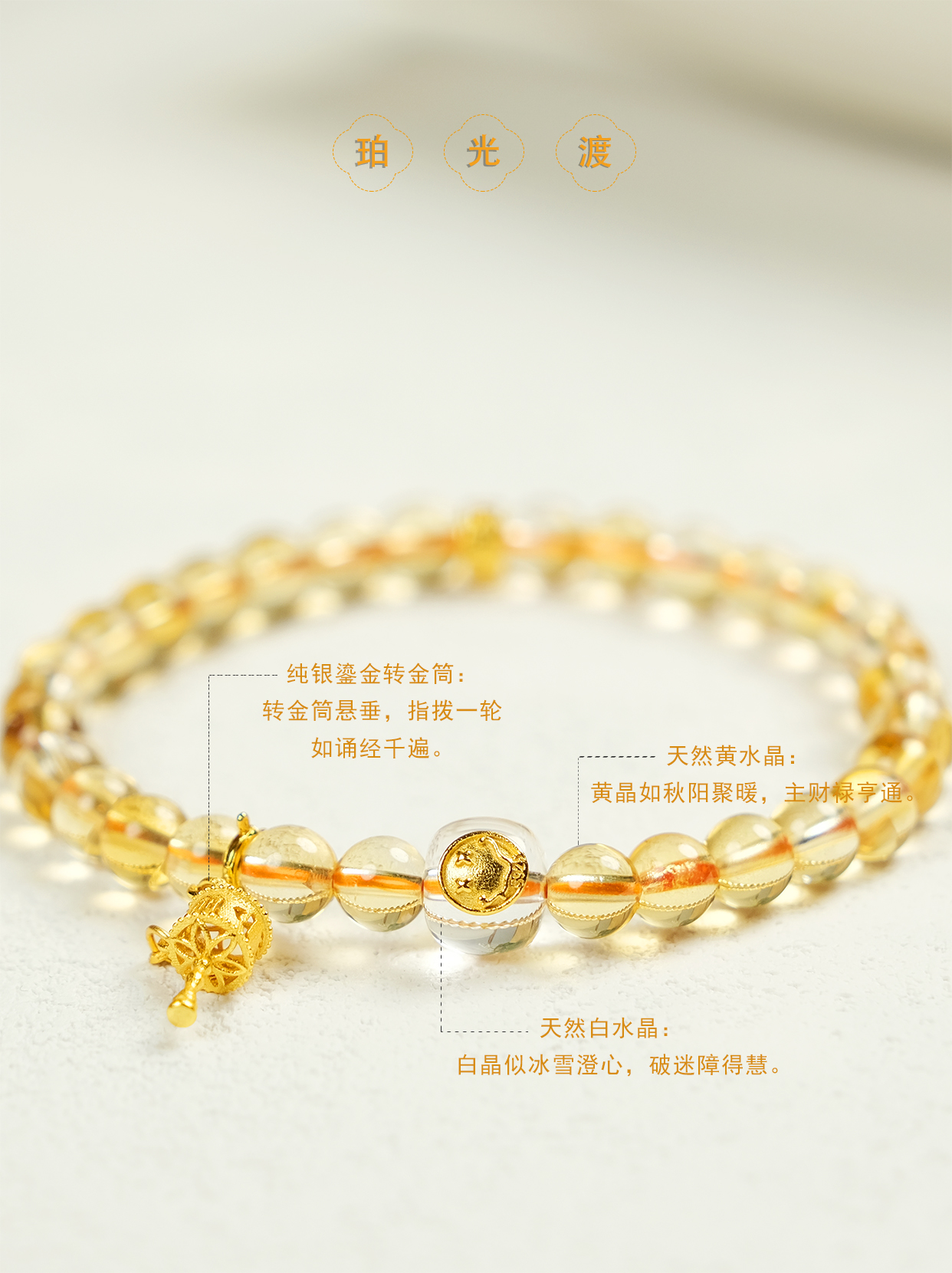 珀光度手串,以天然黄水晶为骨,白水晶为魄,银鎏金转经轮为心。黄水晶如秋阳聚暖,主财禄亨通;白水晶似雪澄心,破迷障得慧。转经轮悬垂,暗藏六字真言,指拨一轮,如诵经千遍。腕间金光浮动,似敦煌画飞仙遗落的宝器,又若茶马古道驼铃摇碎的夕阳,佩之可招祥瑞,转运成祥。