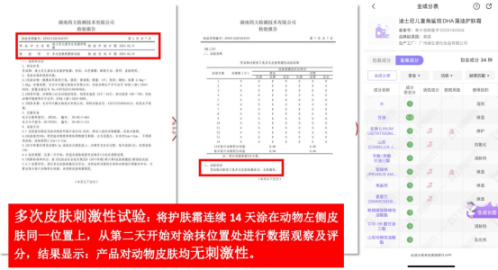 ①迪士尼安全认证配方 | 迪士尼的纯净守护,双重权威认证,安全是底线更是承诺! 在进行儿童护肤品类的检测备案时,需要通过:多次皮肤刺激性试验 产品才能打上国家药监局「小金盾」认证严苛安全评估,品质看得见! **多次皮肤刺激性试验** 护肤霜连续14天涂在动物左侧皮肤同一位置上,从第二天开始对涂抹位置进行数据观察及评分,结果显示:产品对动物皮肤均无刺激性。