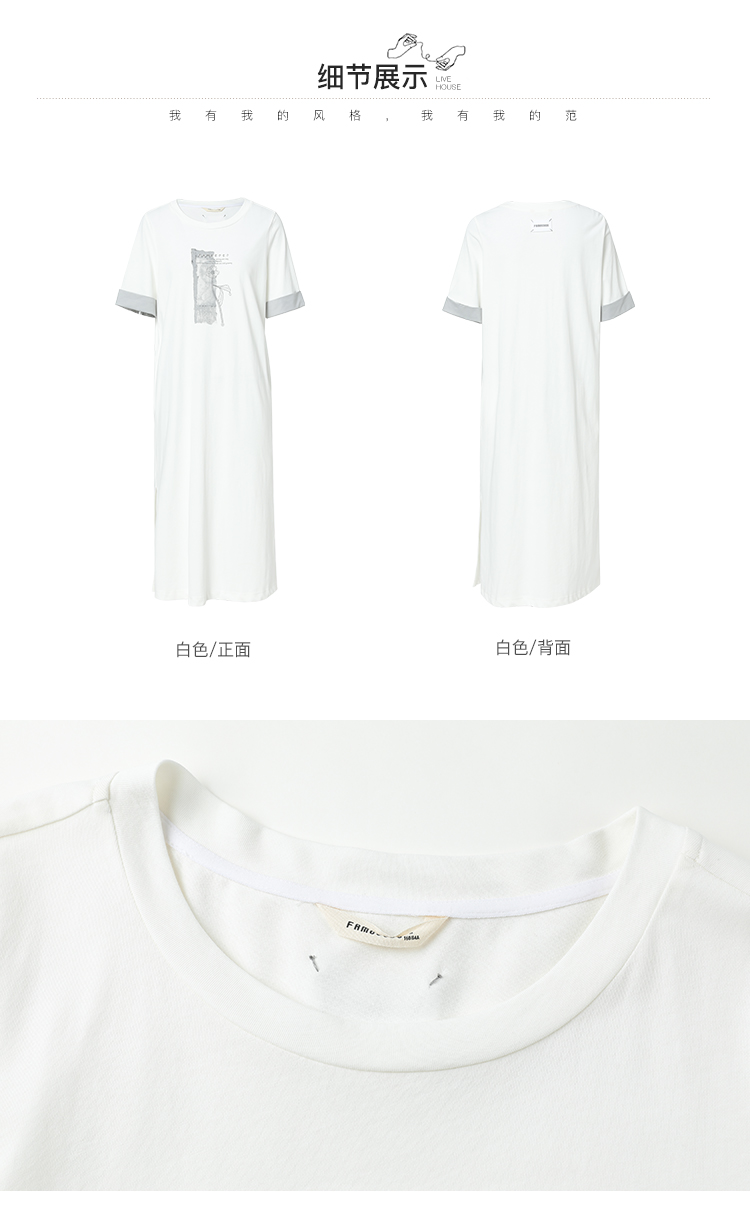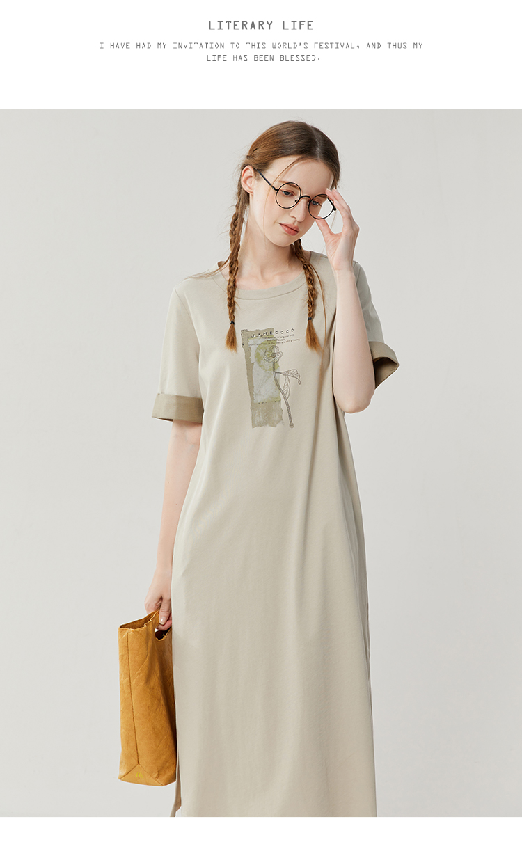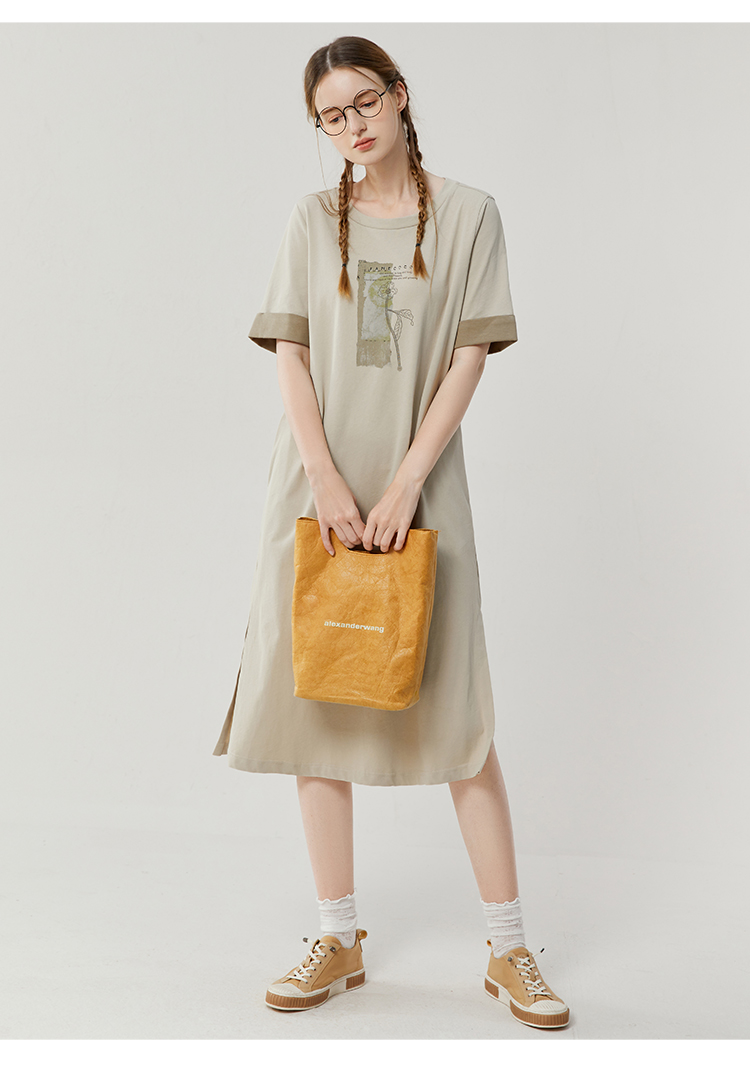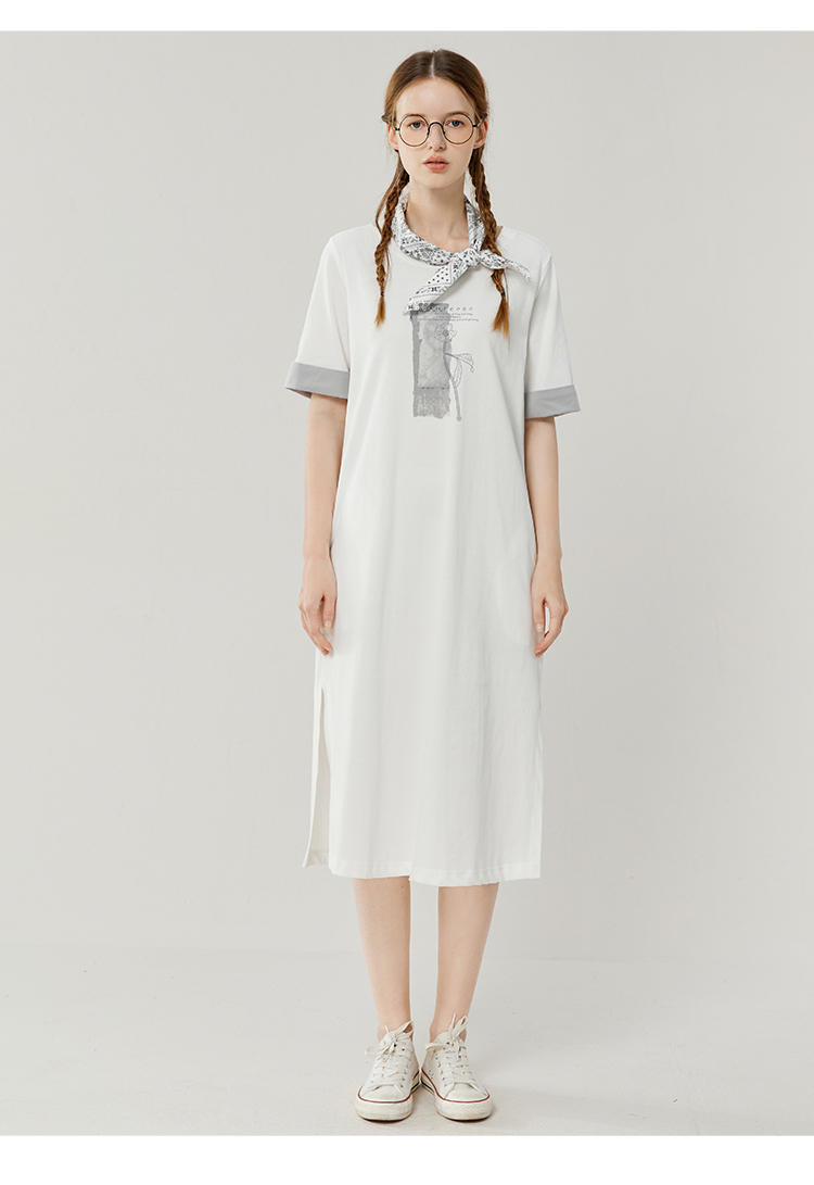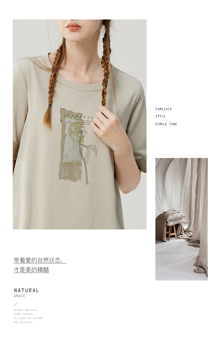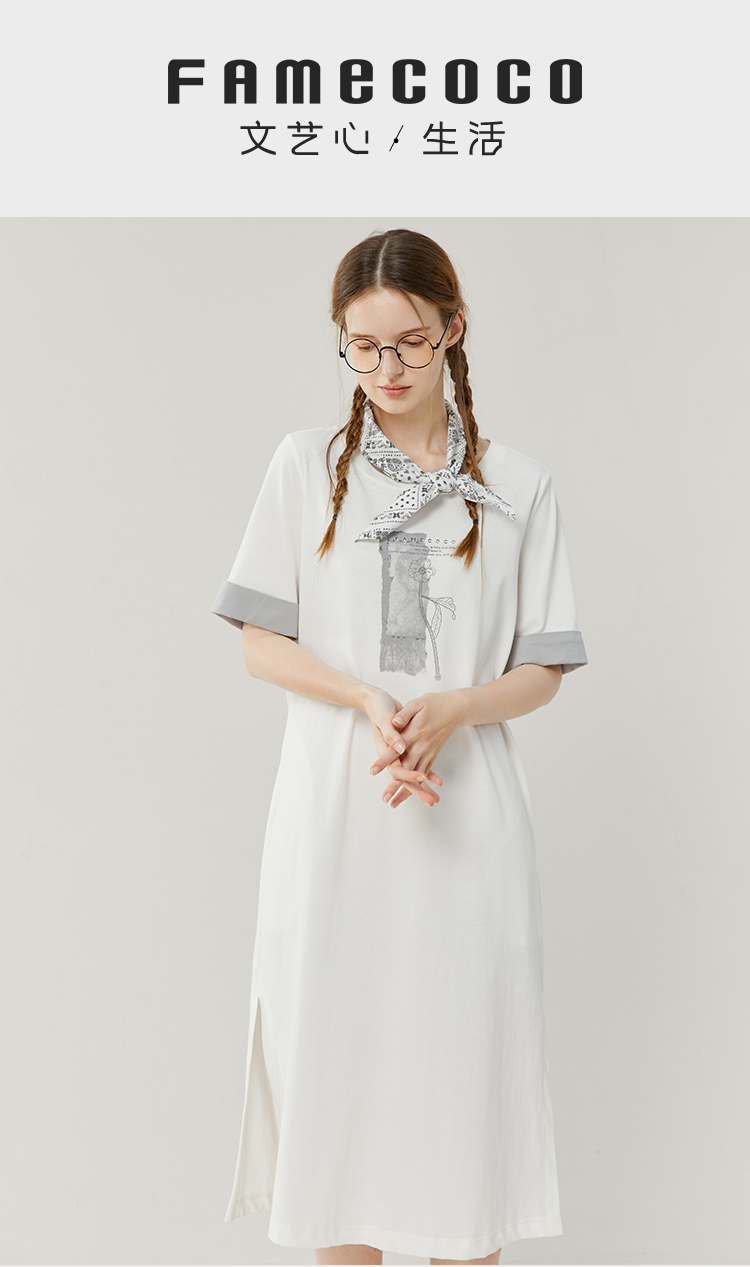 Famecoco范可儿宽松直筒T恤连衣裙夏季复古印花开叉长裙FAB3FA079