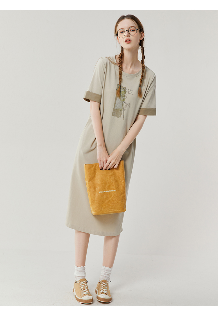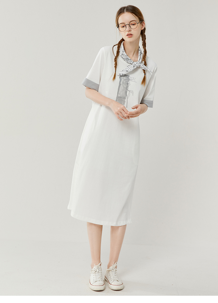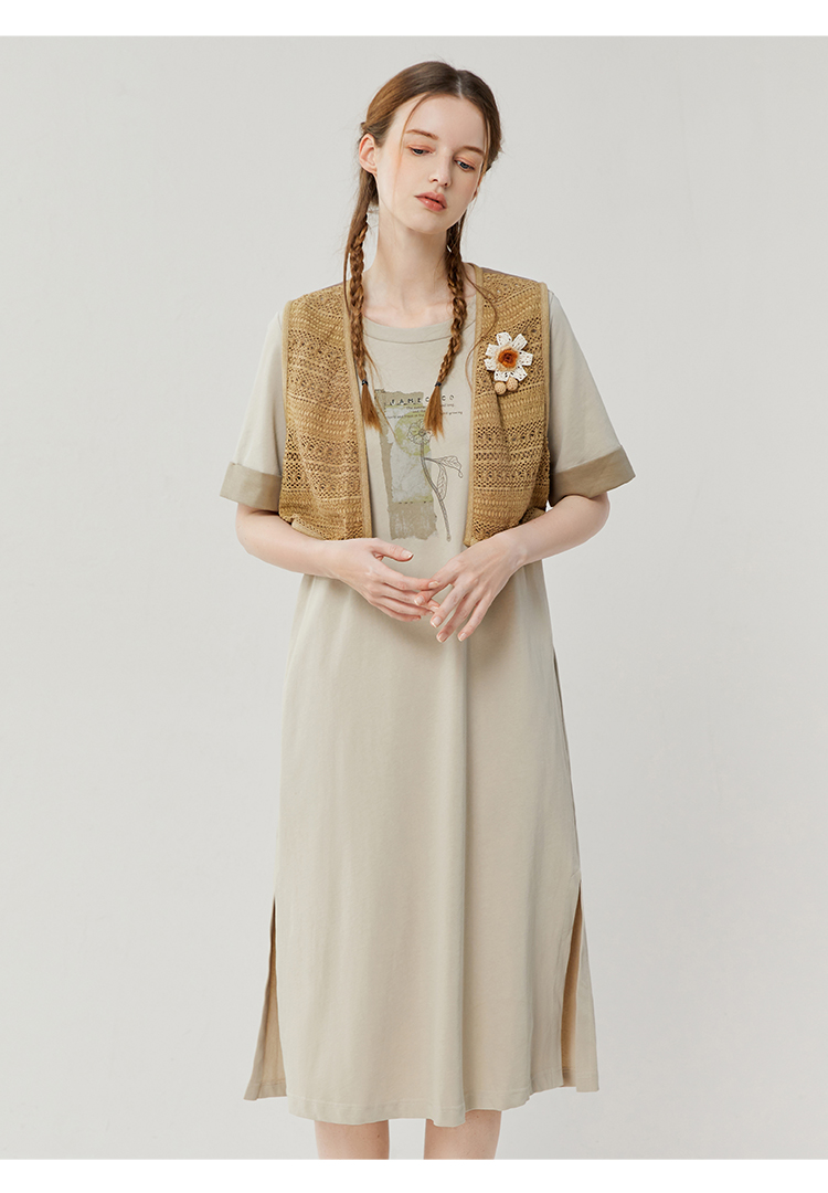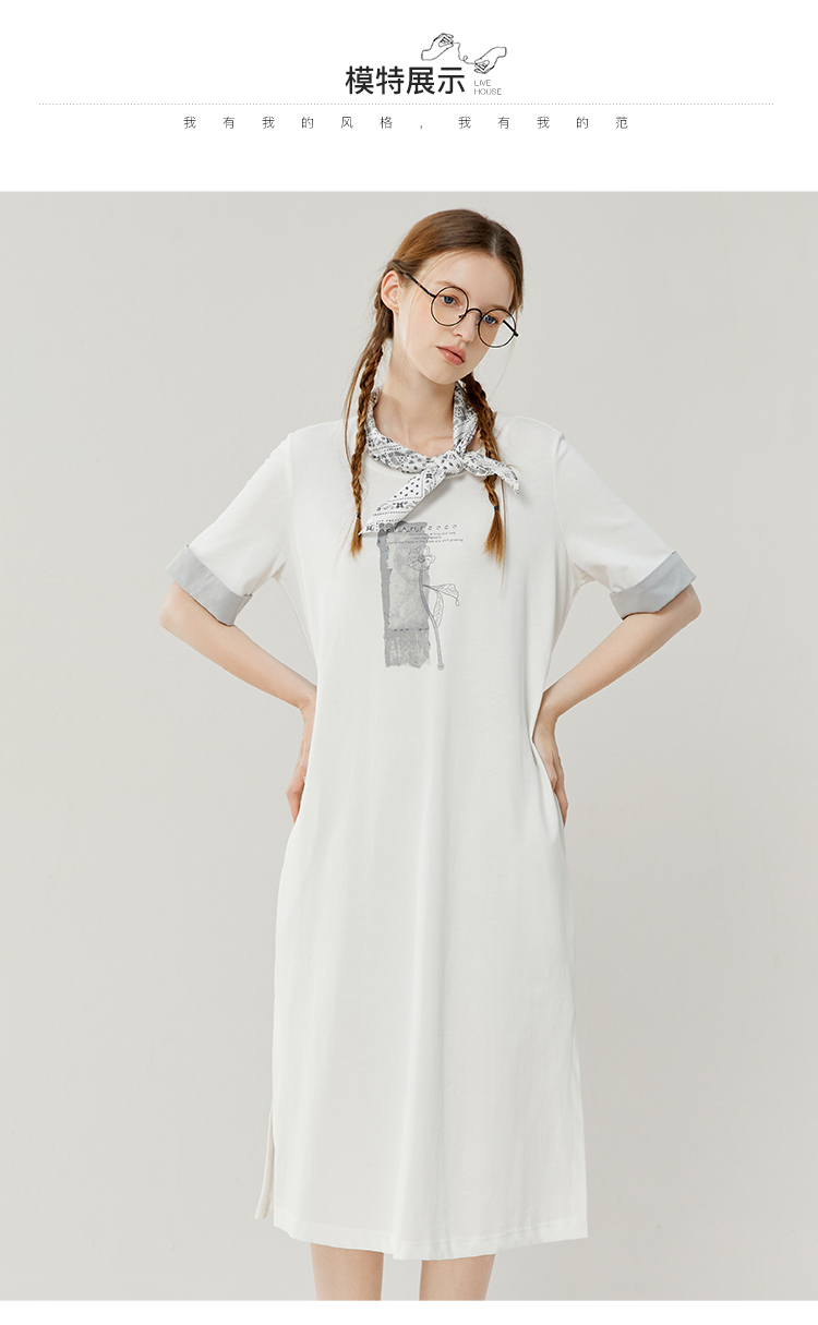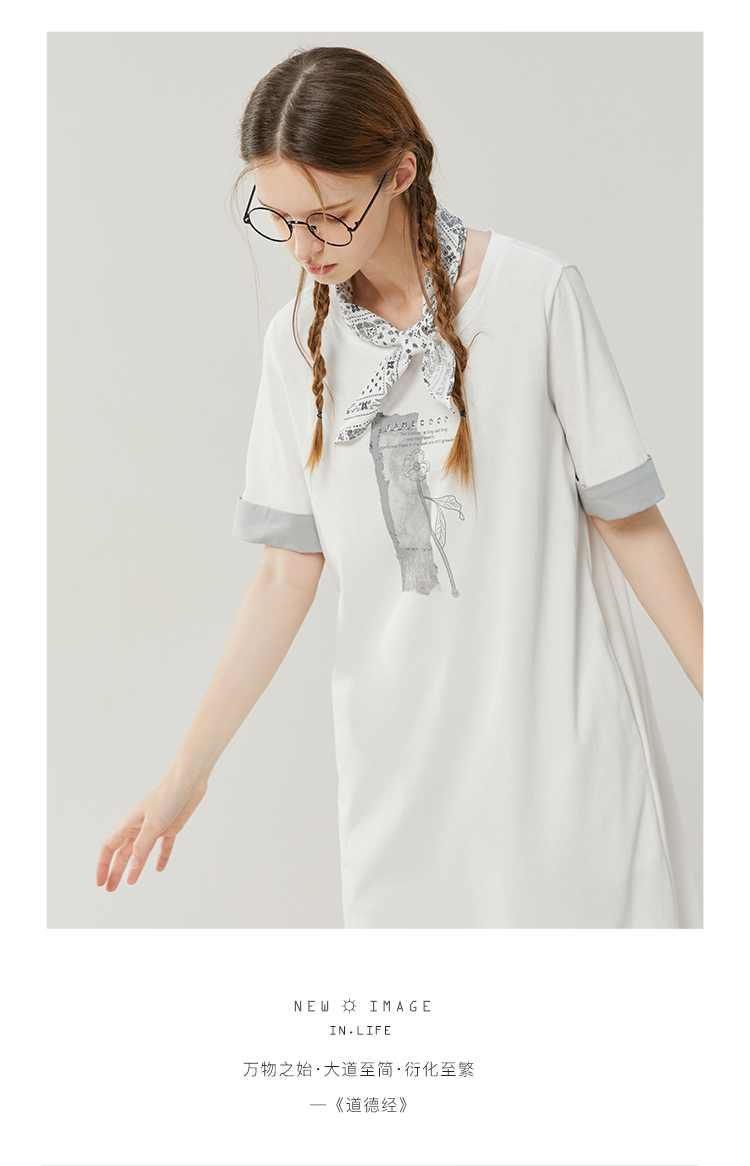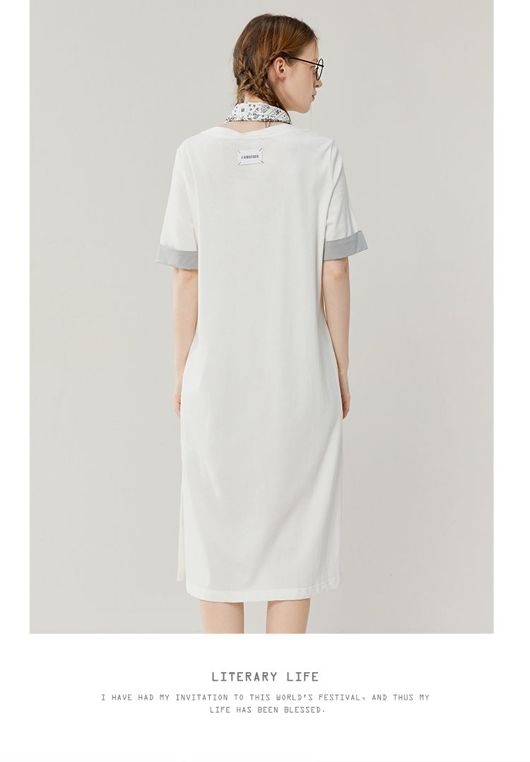 Famecoco范可儿宽松直筒T恤连衣裙夏季复古印花开叉长裙FAB3FA079