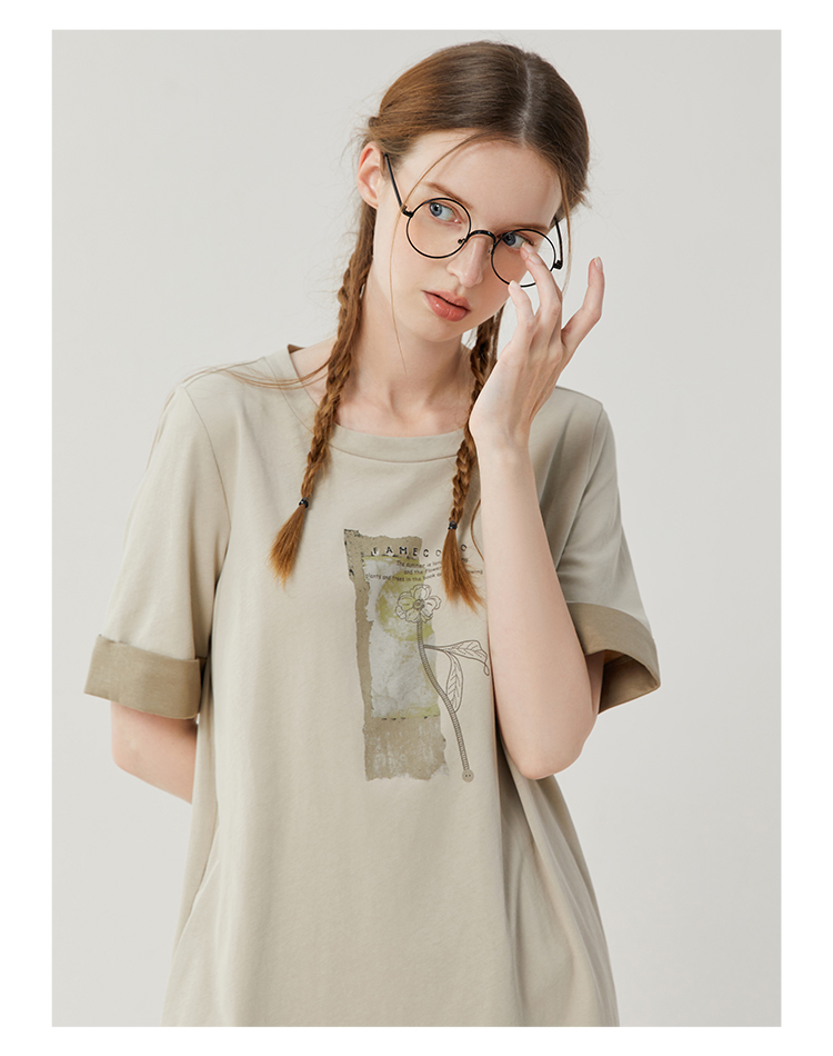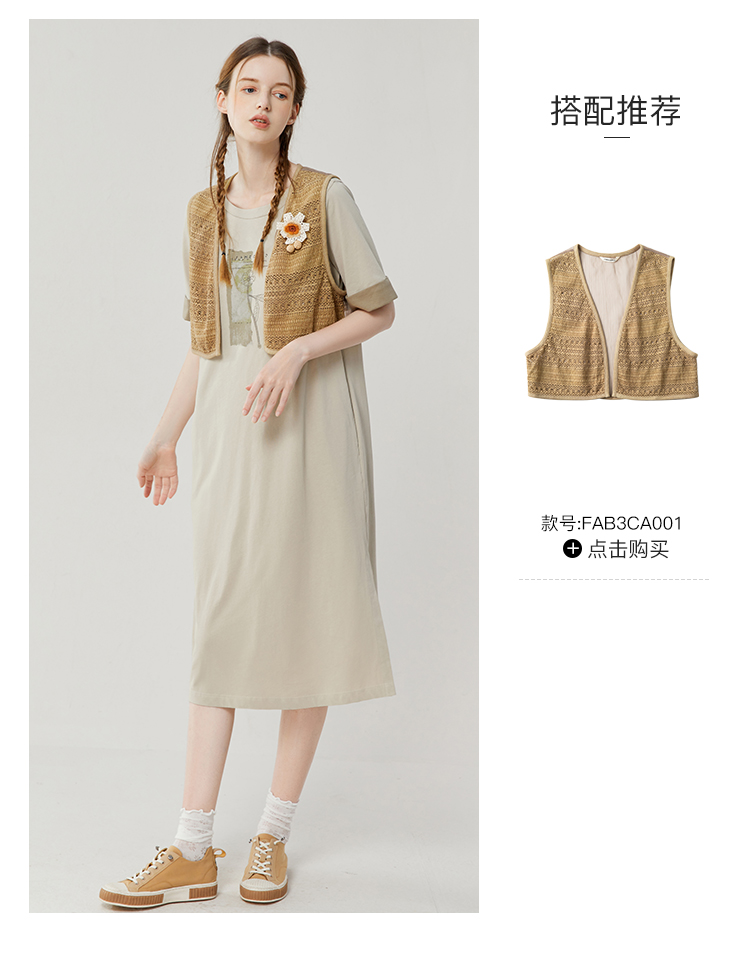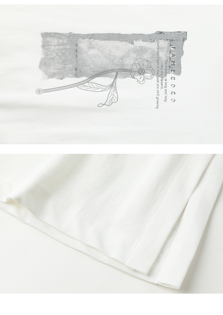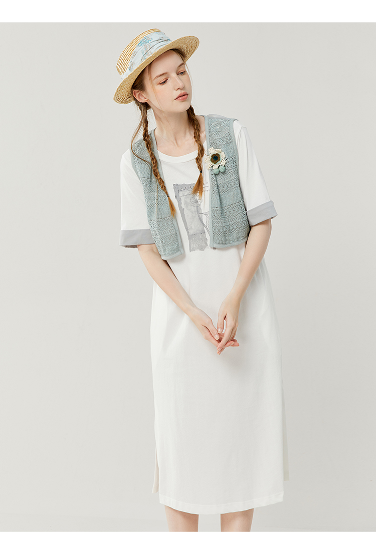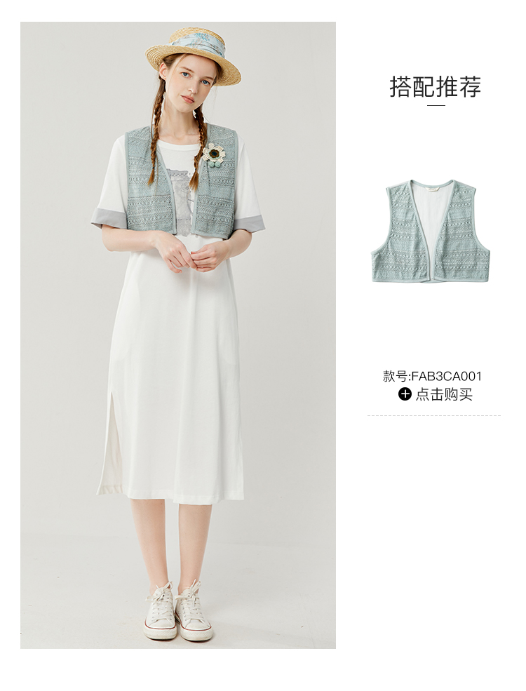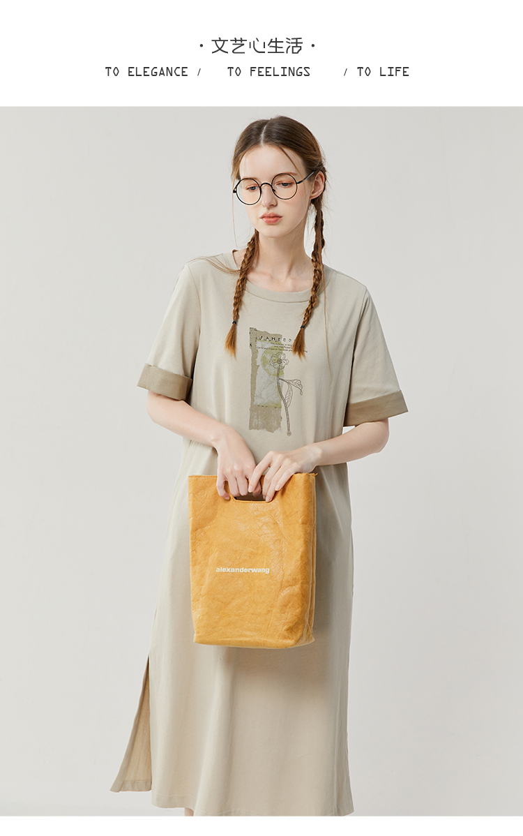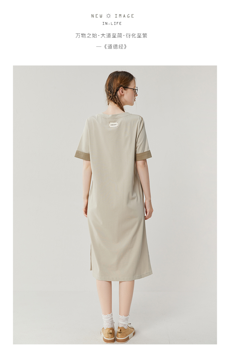 Famecoco范可儿宽松直筒T恤连衣裙夏季复古印花开叉长裙FAB3FA079
