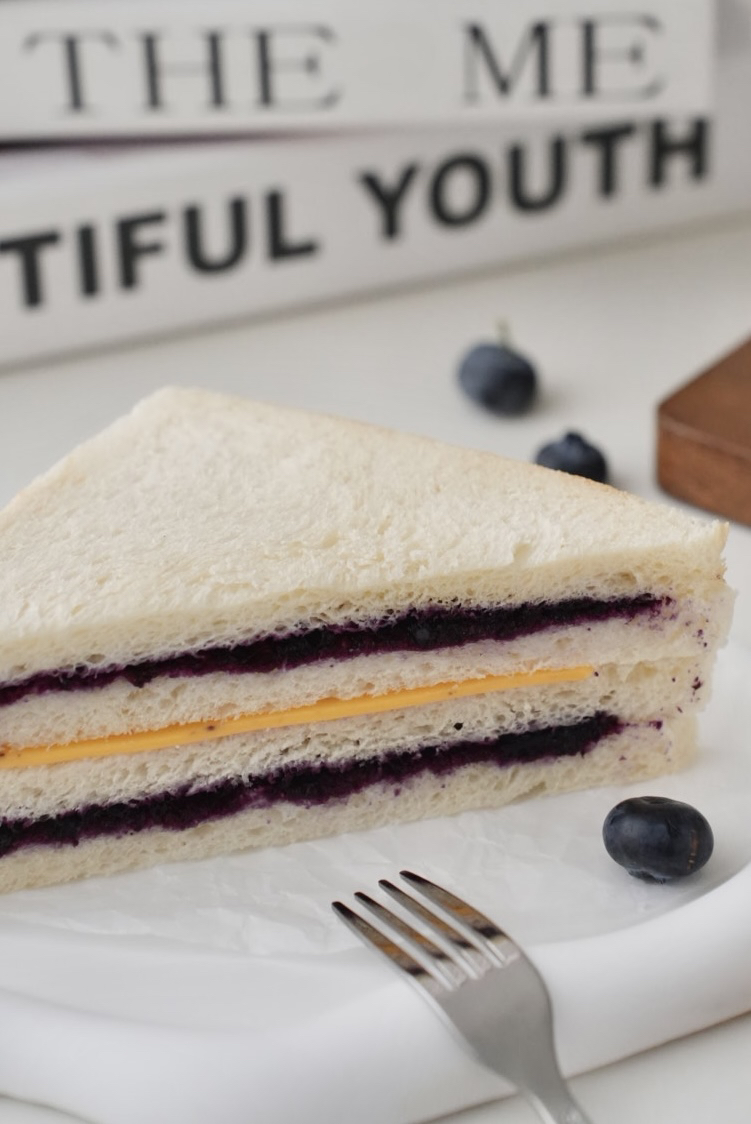 牛奶吐司(小麦粉,鸡蛋,牛奶,黄油,糖,盐,酵母),芝士片,自熬蓝莓果酱(蓝莓,糖,柠檬汁)
