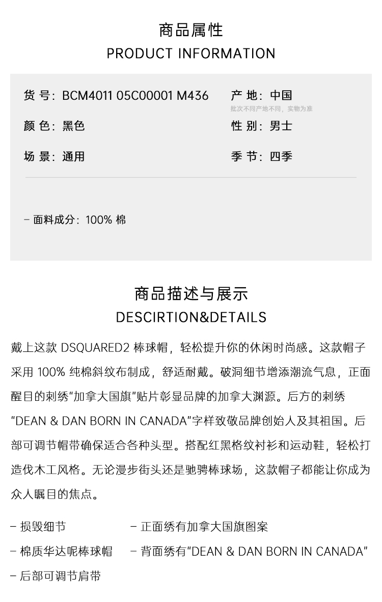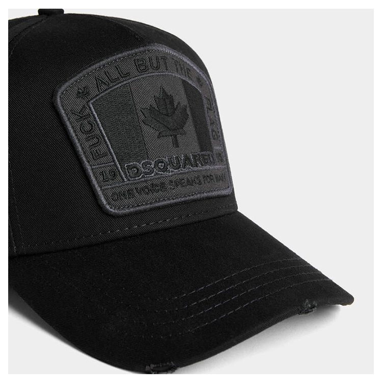 DSQUARED2 男士加拿大徽标刺绣棉质补丁棒球帽 黑色 BCM4011 05C00001 M436