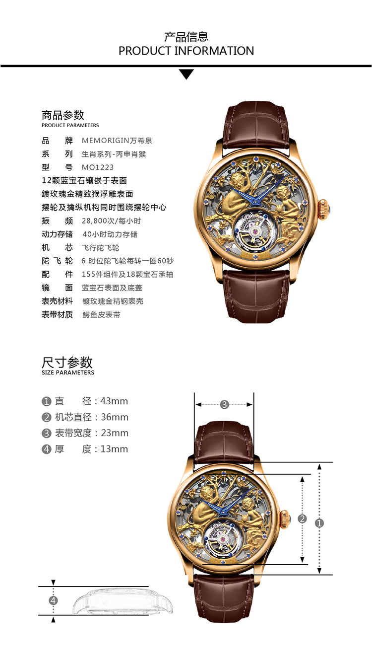 MEMORIGIN万希泉生肖系列猴腕表男款表陀飞轮真皮机械表男士手表