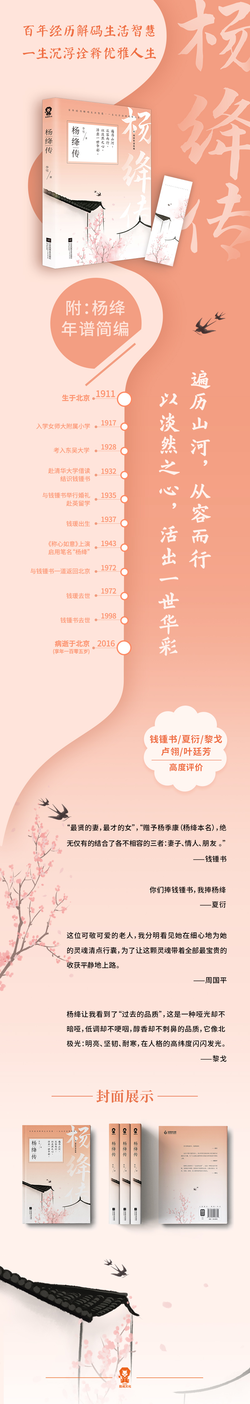 ★百年经历解码生活智慧,一生沉浮诠释优雅人生。 ★从1911年到2016年,讲述杨绛105年的生活经历,摘引先生自述,蕴藏大量人生智慧,呈现了一个立体丰满的杨绛形象。 ★“最贤的妻,最才的女”,“赠予杨季康(杨绛本名),少见的结合了各不相容的三者:妻子、情人、朋友 。”——钱锺书 ★钱锺书、夏衍、黎戈、卢翎、叶廷芳等高度评价。 ★遍历山河,从容而行,以淡然之心,活出一世华彩。 ★特别附录:杨绛年谱简编