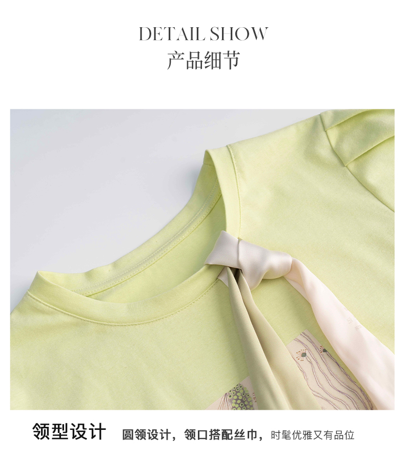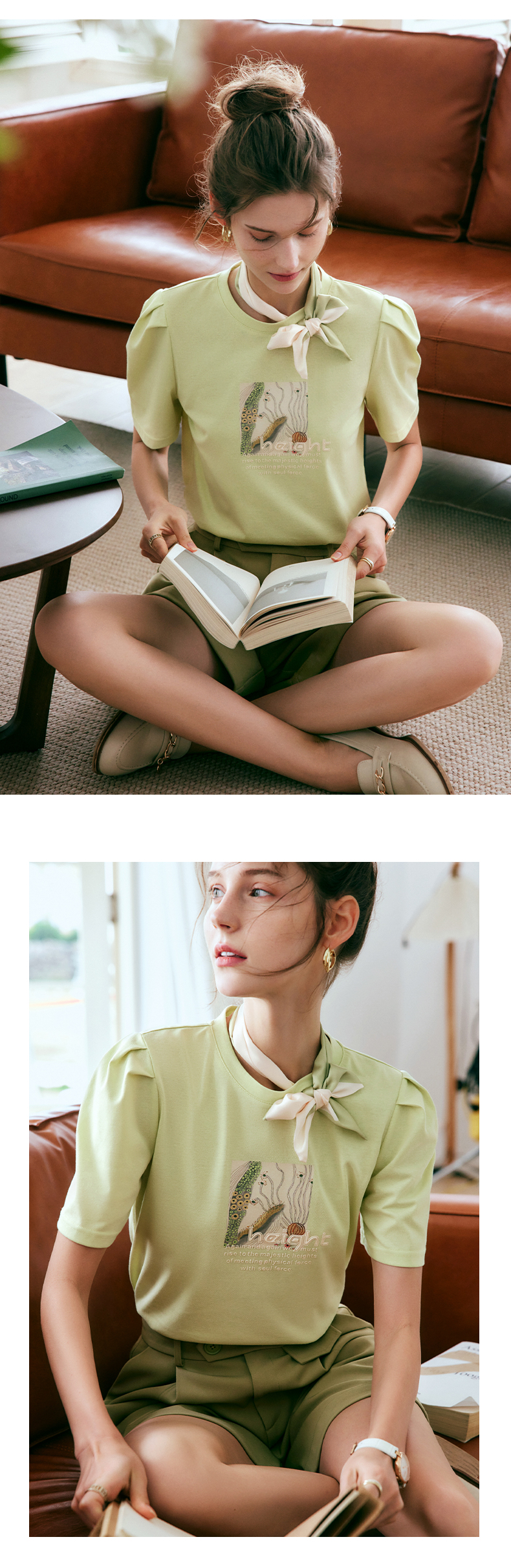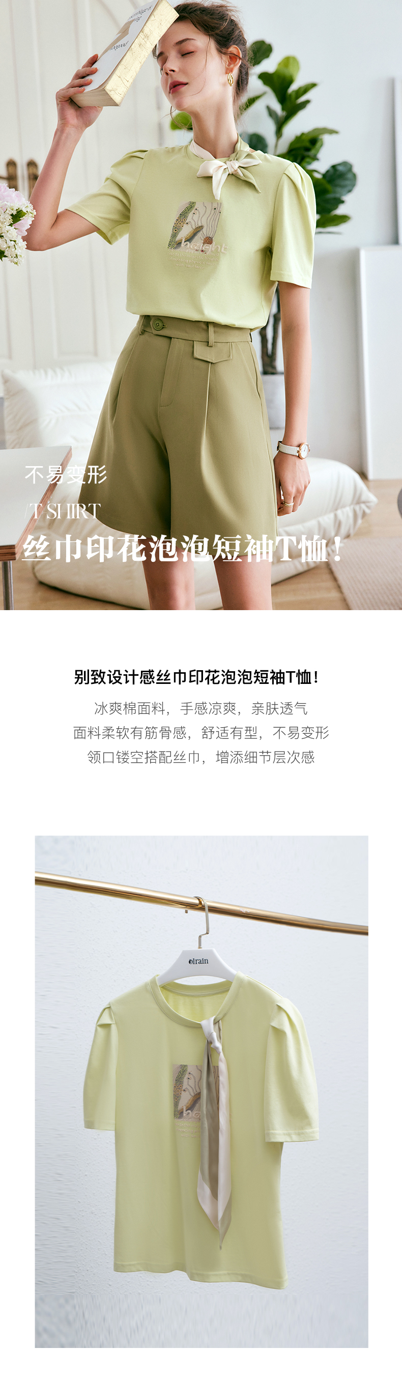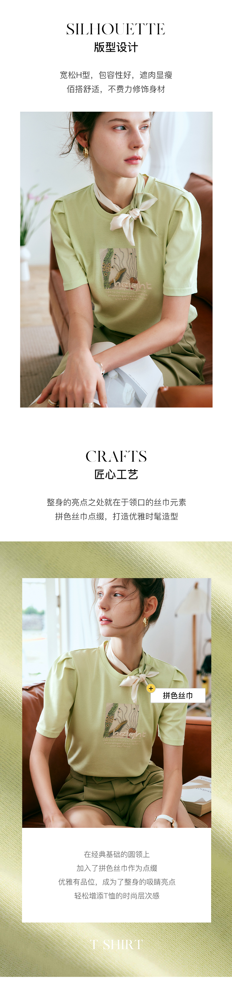 OLrain法式高级穿搭绿色短袖t恤女夏季2022年新款泡泡袖丝巾上衣