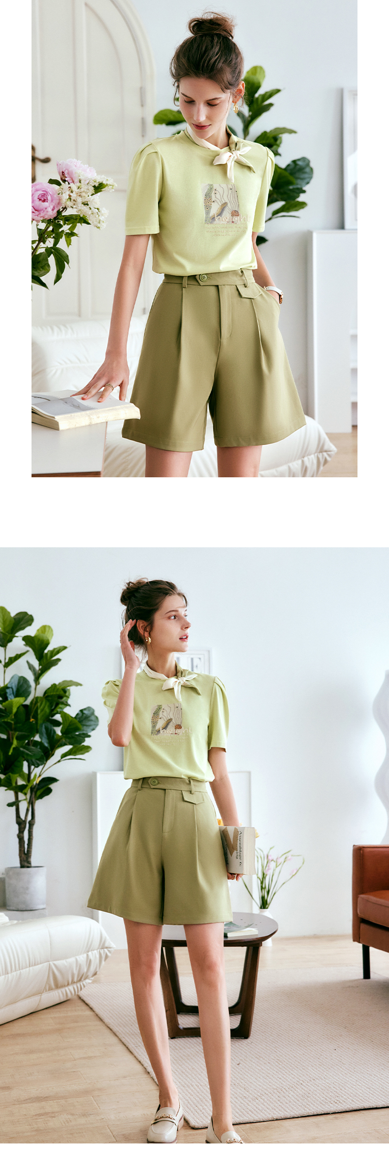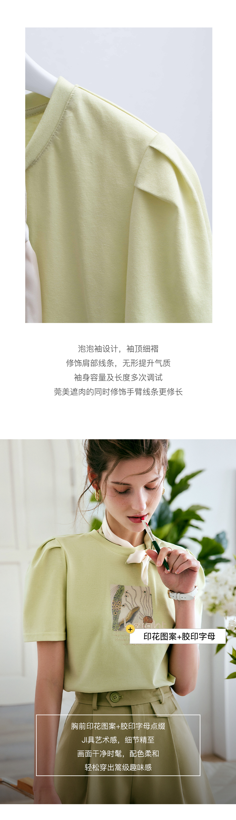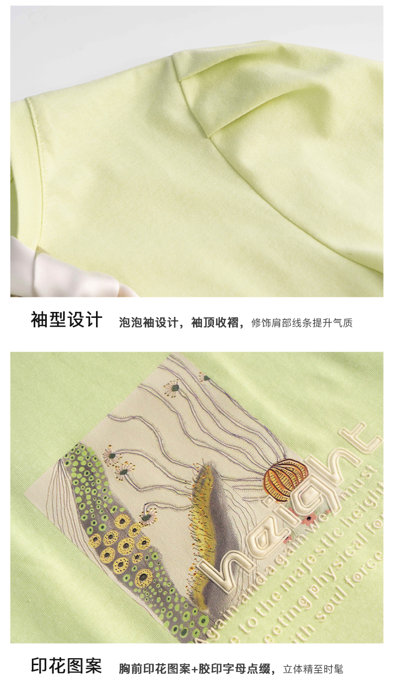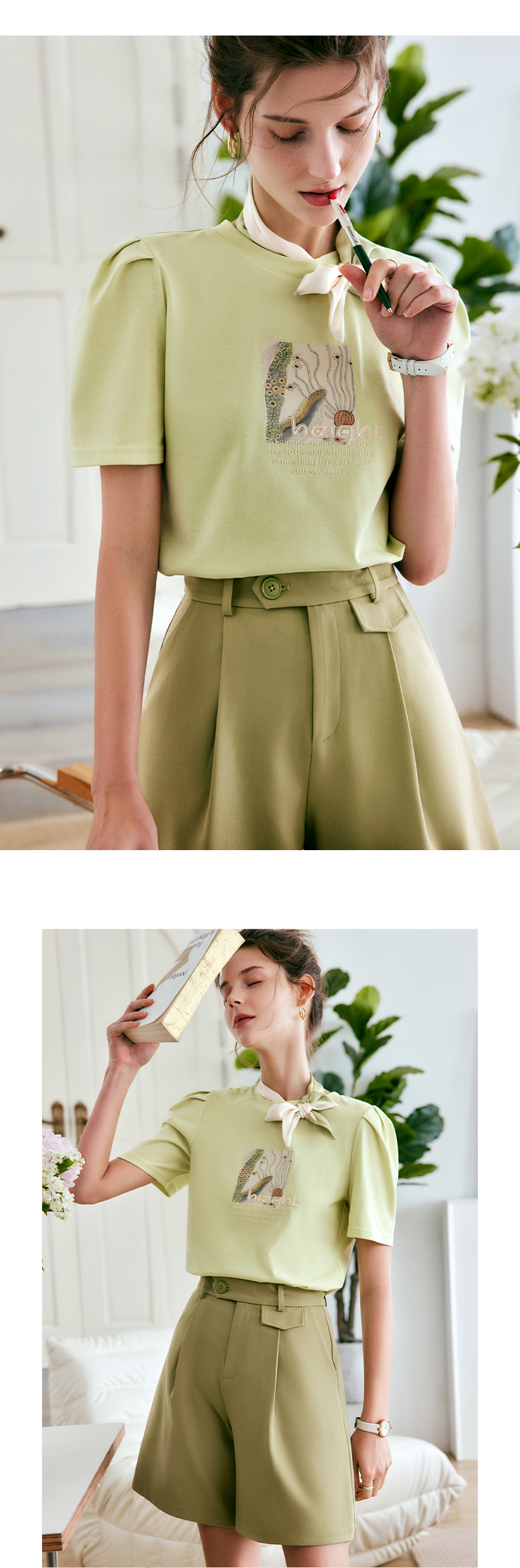OLrain法式高级穿搭绿色短袖t恤女夏季2022年新款泡泡袖丝巾上衣