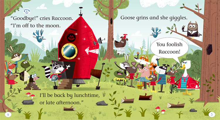 Goat in a Boat 山羊先生船上坐Llamas in Pyjamas 美洲驼睡衣秀Raccoon on the Moon 小浣熊月球游Cow Takes a Bow 大棕牛来谢幕Snail Brings the Mail 小蜗牛来送信Bee Makes Tea 蜜蜂姑娘做茶点