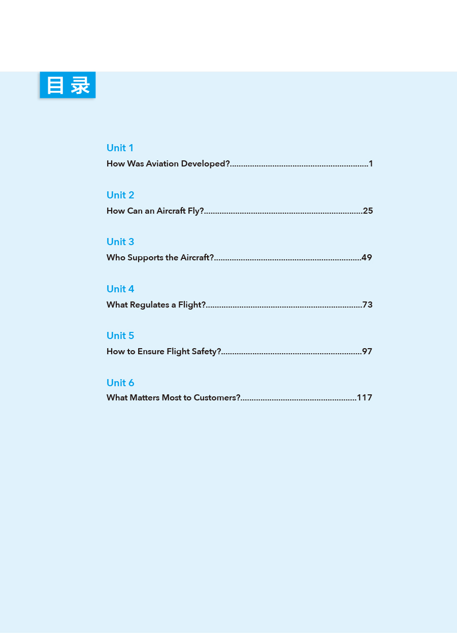 体验文化,感悟精神选取真实民航语料,涵盖多个场景和话题,让学生在学习民航通识知识的同时,体验民航文化、感受民航精神。需求分析,项目引领基于对学生语言学习需求的分析,从语篇选择、意义构建和项目实践三个层面复现真实民航场景,让学生在完成任务过程的中发展语言能力和交际能力。辅助资源,支撑教学提供音频、答案等辅助教学资源,为线上线下混合式教学提供保障,有效支撑移动学习与自主学习。