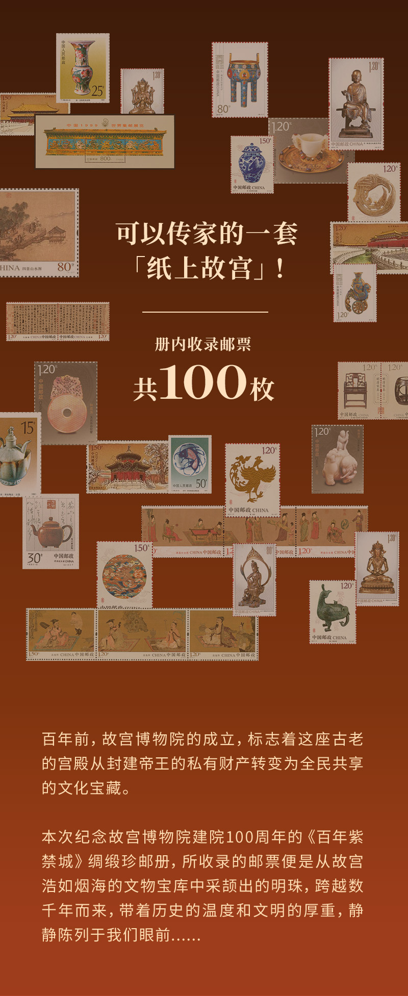【赠故宫邮票两枚】纪念故宫博物院100周年!《百年紫禁城》绸缎珍邮册,百枚馆藏文物邮票,可扫码验真伪,还送主题礼袋,限量2000册