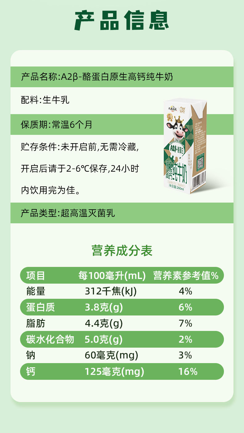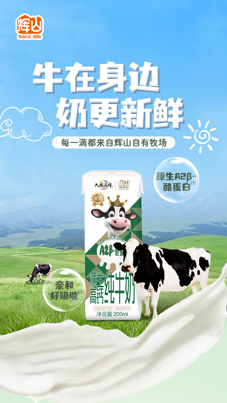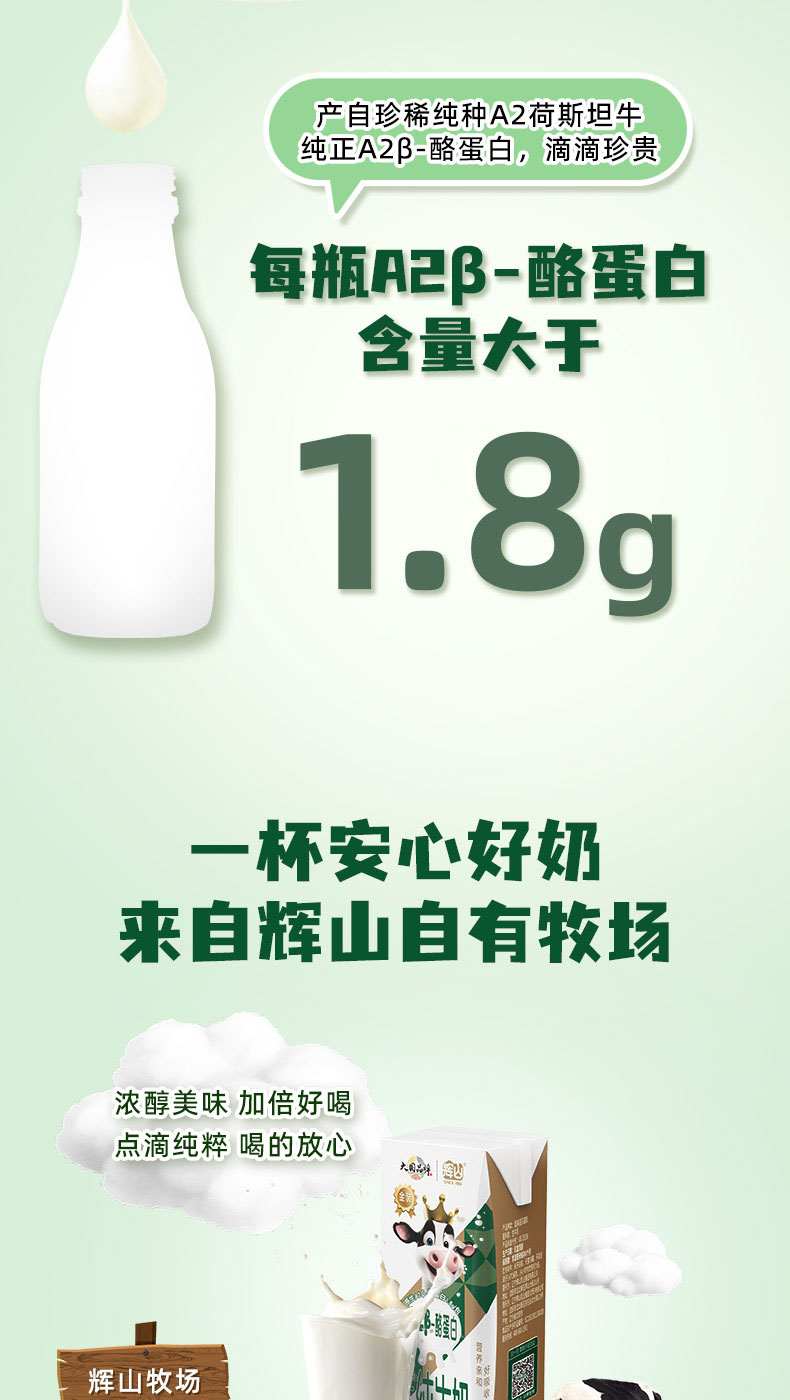 【辉山 A2β-酪蛋白原生高钙纯牛奶】儿童学生营养全家早餐牛奶 200ml*20盒