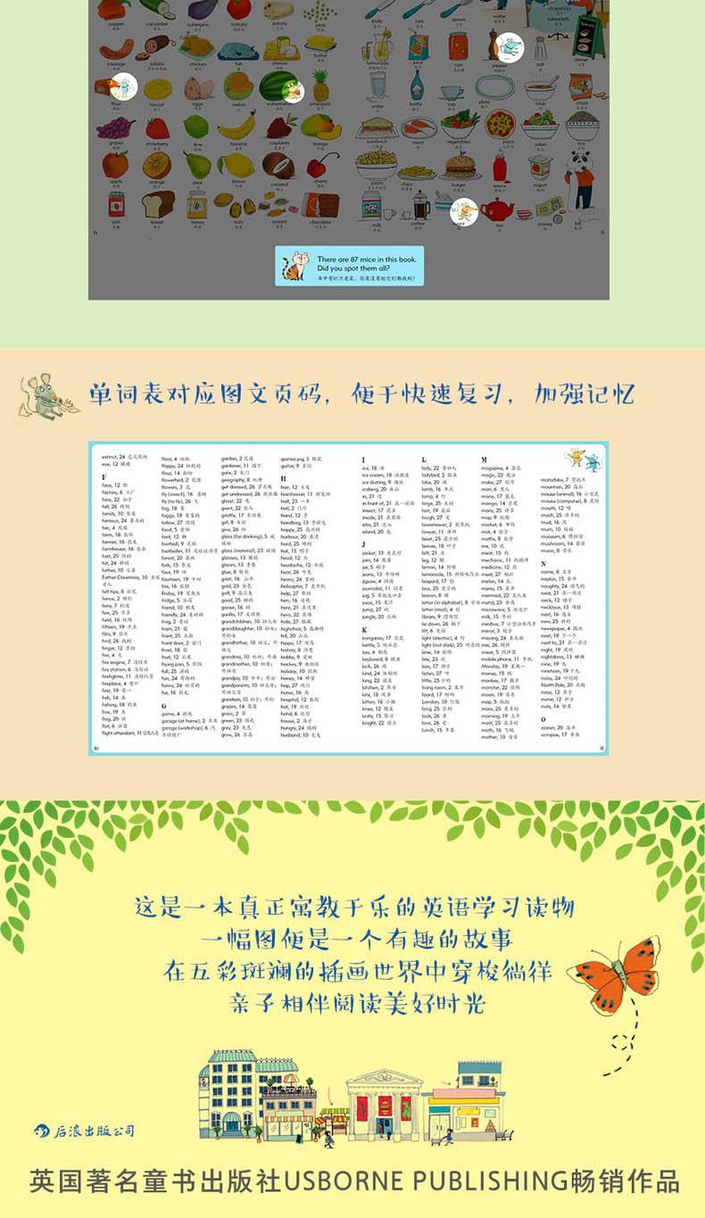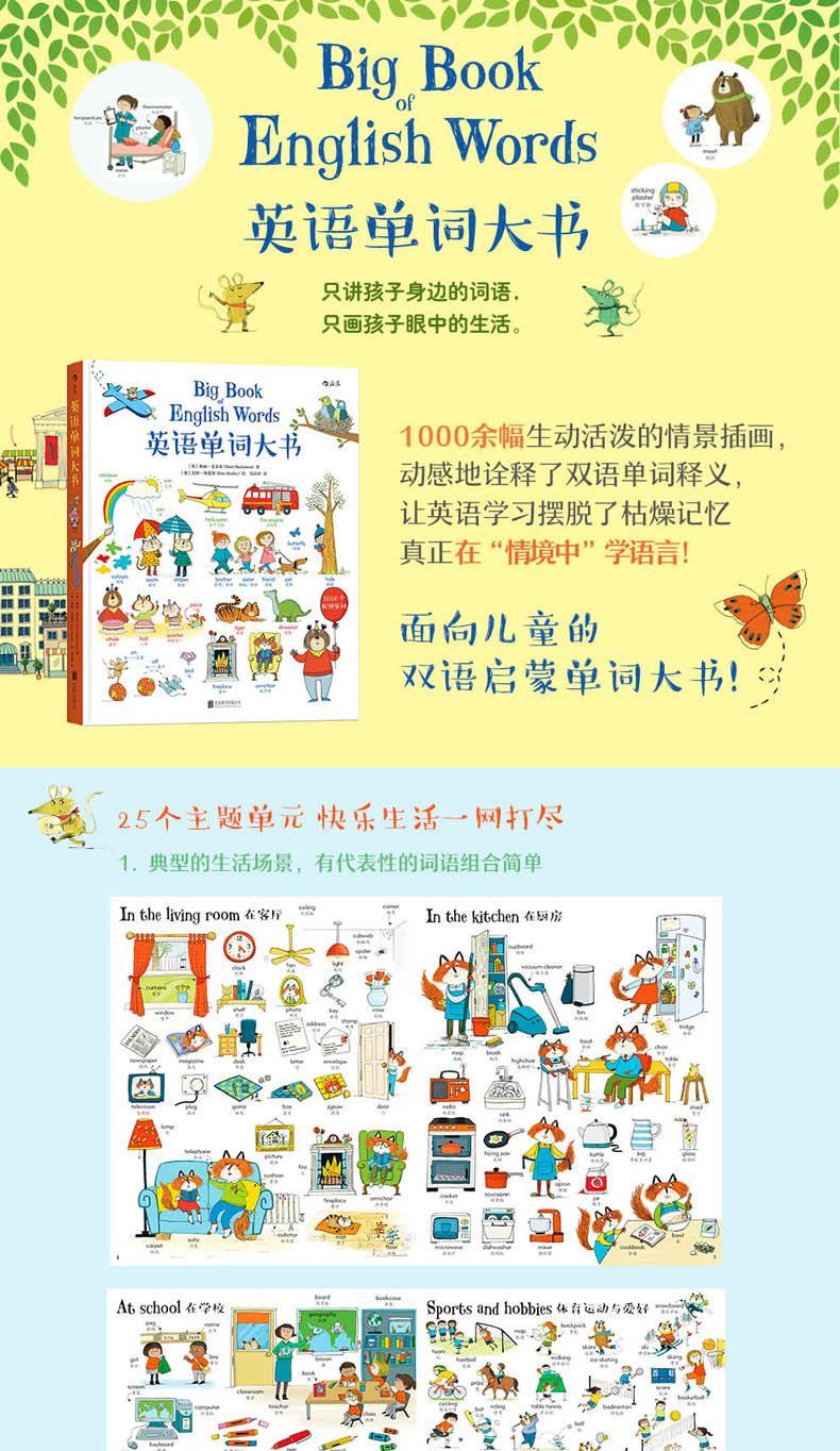 梅丽·麦金农著的《英语单词大书(精)》是一本专为儿童编写的双语词汇启蒙书。别具一格的怀旧画风,描绘了25个主题,涵盖了大约1000个贴近儿童生活的常用词。每一页都藏有两只小老鼠,孩子可以一遍翻阅一遍寻找,颇有趣味。文末附有单词表,方便查找单词。在这本大开本的硬皮书中,有太多的东西值得发现和讨论,这正是一个把孩子聚在一起认真阅读的好机会。